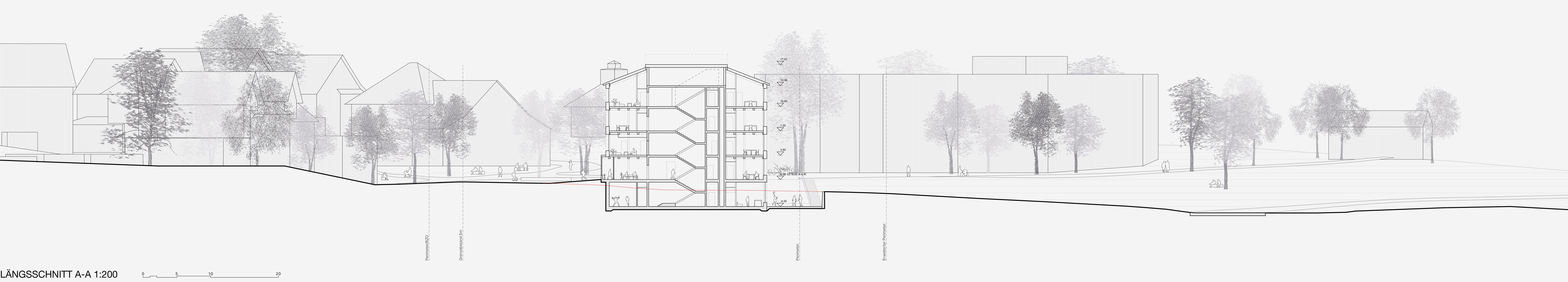 Entlang der Ostseite wird das neue Gebäude von einem Gräser- und Blütenband gesäumt. Nach Nord-Ost ist die Aussenterrasse als Aufenthaltsbereich für Patienten an die Fassade angelagert. Durch eine begrünte Böschung mit Sitzkante fügt sie sich weich in die bestehende Hangsituation ein. Ein Stufenweg erschliesst den darunterliegenden Therapieaussenraum als Aufenthaltsort im Wiesenhang.