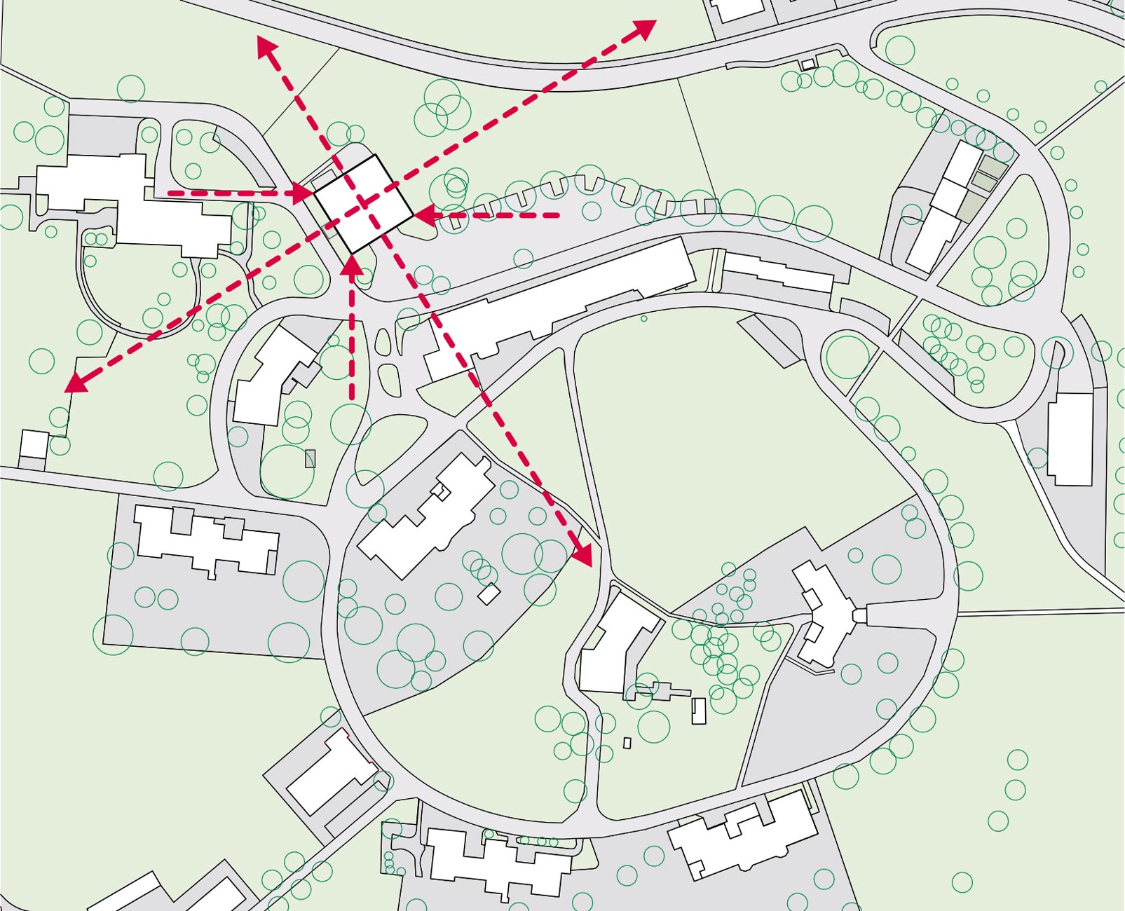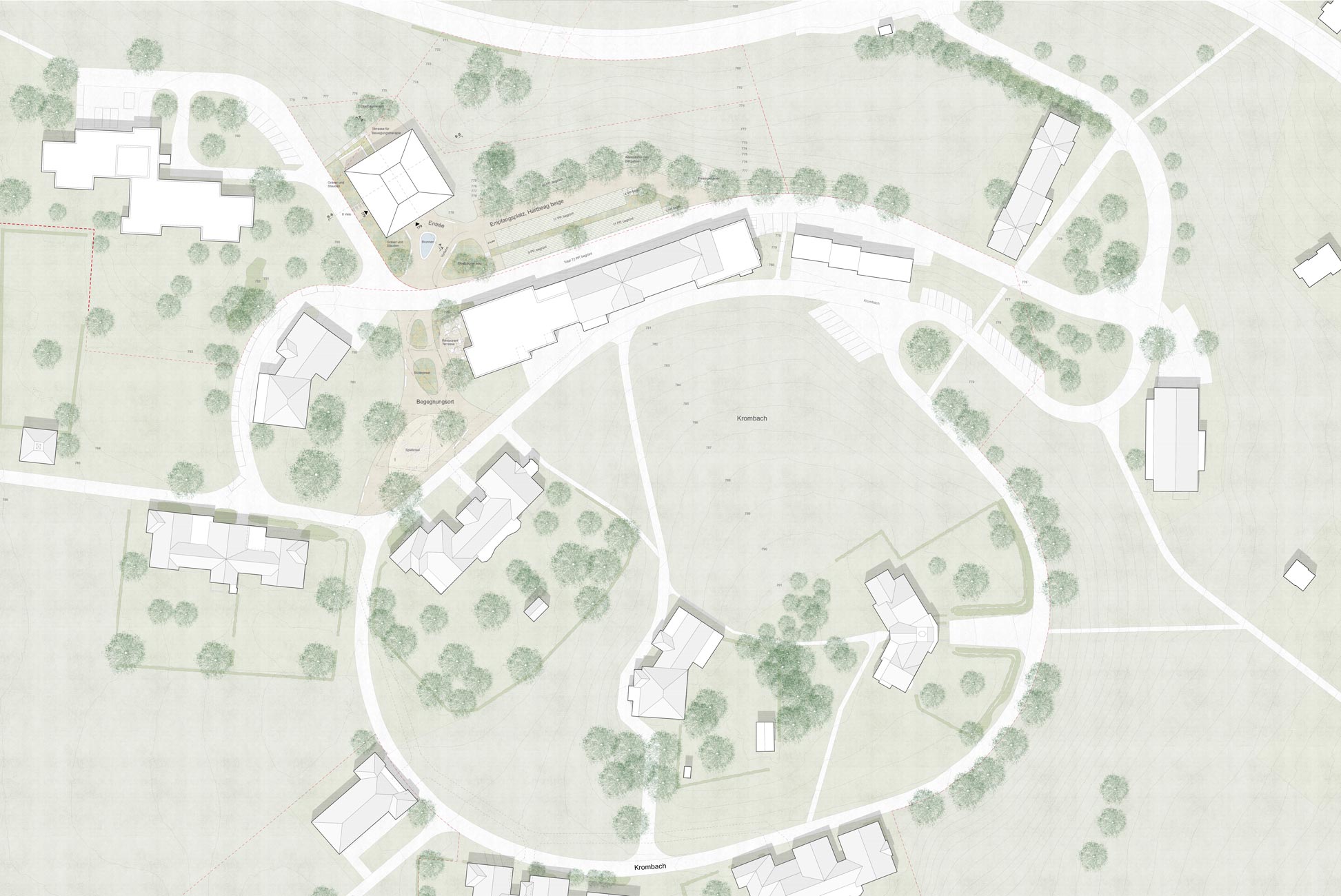 Die eindrücklich, in einem die Kuppe des Krombachhügels umziehenden Ring organisierte Anlage der Psychiatrischen Klinik ist heute noch in weiten Teilen in ihrer ursprünglichen Absicht erlebbar. Von der Topographie bestimmt, von Wiesenlandschaft durchzogen ist der Ort wohltuend intakt. Mit dem nördlich des Hauses 8 angeordneten Parkplatz wurde zwischenzeitlich die Ankunftssituation verändert. Dem ursprünglichen Ring wurde dadurch eine zweite Schicht aussenseitig vorgelagert, welcher der Bezug zum «Innenraum» fehlt. Der Neubau des Besucher- und Therapiezentrums klärt die Ankunft und den Empfang für die Besucher. Zudem ergibt sich die Möglichkeit, mit einer offensiveren Freiraumgestaltung die Verbindung zwischen Besucherzentrum und innerem «Bezirk» nachhaltig zu stärken.