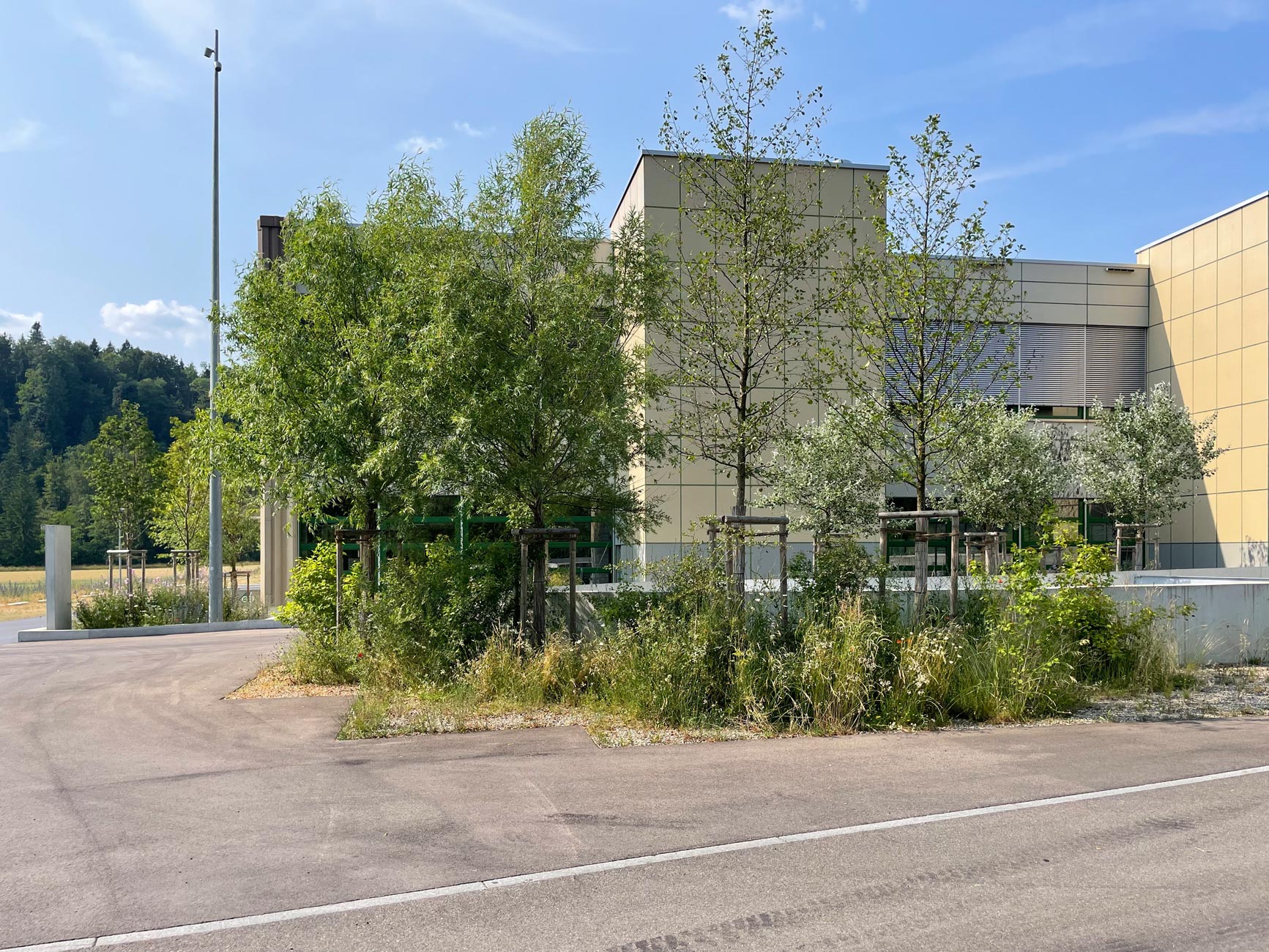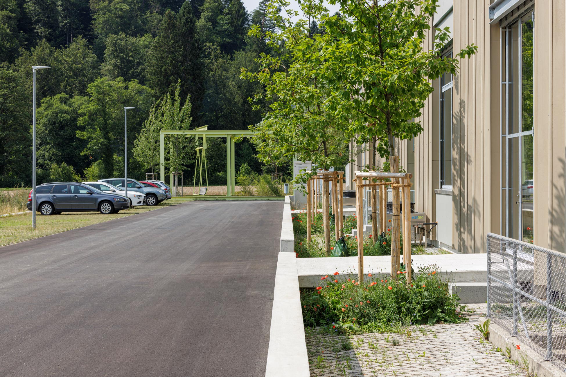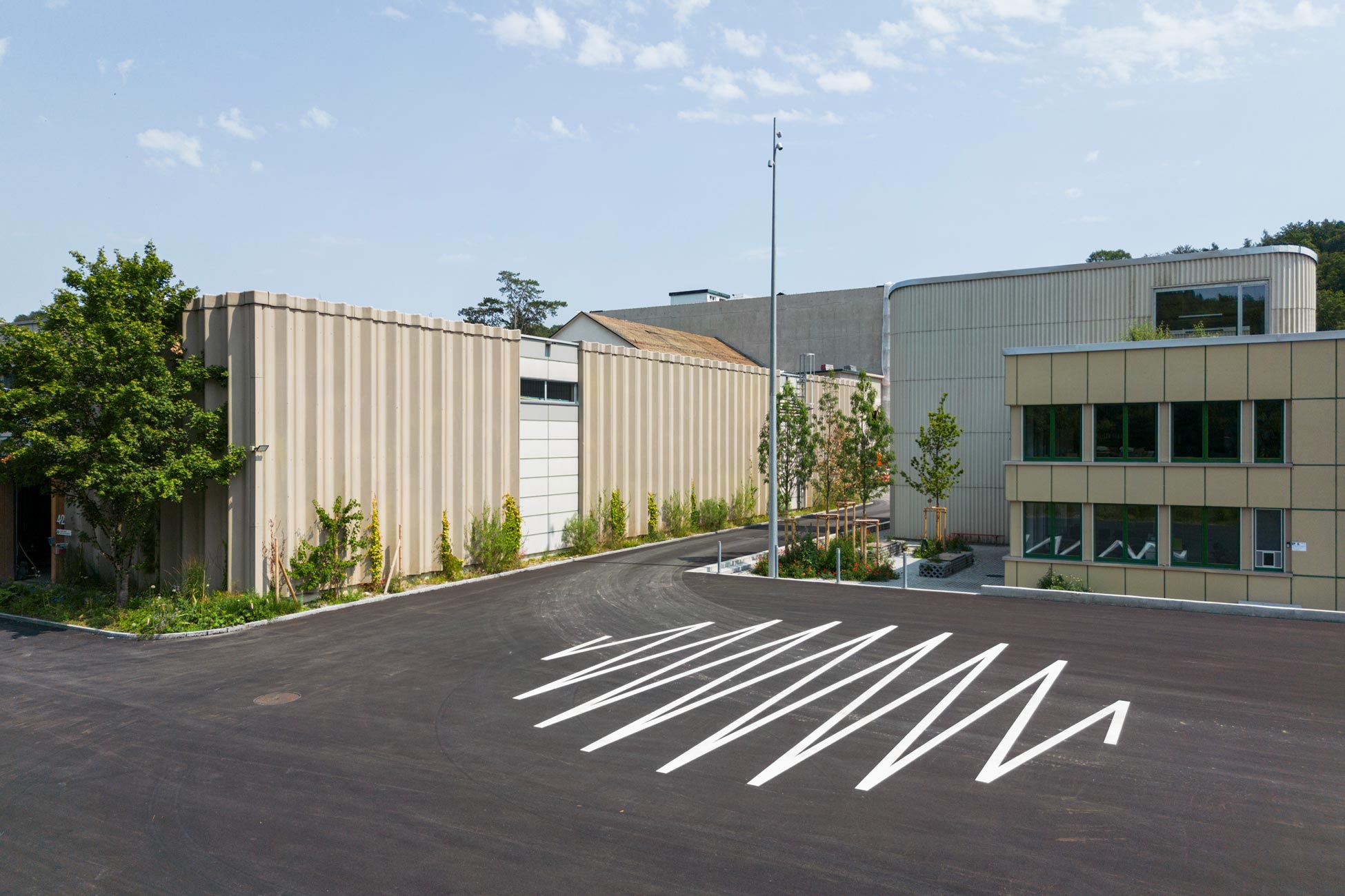 Am äusseren Rand des Areals liegen, zu den anschliessenden Wiesen und Feldern, die Besucher- und Nutzerparkplätze. Aus einem zeichnenden, linierten Rasenstein sind sie zu einer graphischen Bordüre gefügt, die einen durchgrünten und robust-befahrbaren Übergang in die Landschaft ausbilden. Die exponierte, in den Landschaftsraum stossende Westecke des Areals wird mit einem farbigen Pavillon als besonderes und überraschendes Objekt ausgezeichnet: Die aus der Demontage eines Bestandsgebäudes angefallenen massiven Stahlträger sind zu einem neuen „Freiraum“ als Rahmenstruktur gefügt. Mit der eingehängten, auf die markante Kyburg im Süden ausgerichteten Landschaftsschaukel lässt der Pavillon einen unvermuteten Ort für Passanten wie Beschäftigten entstehen.