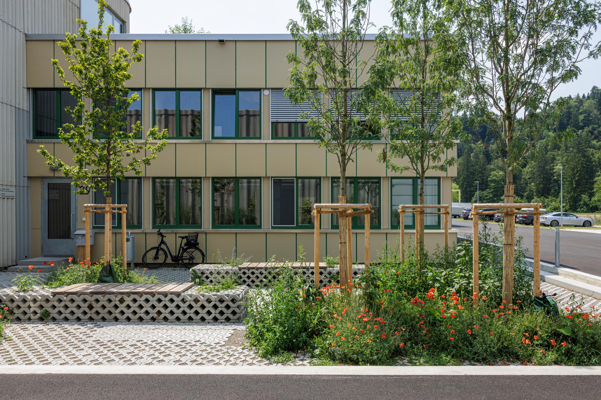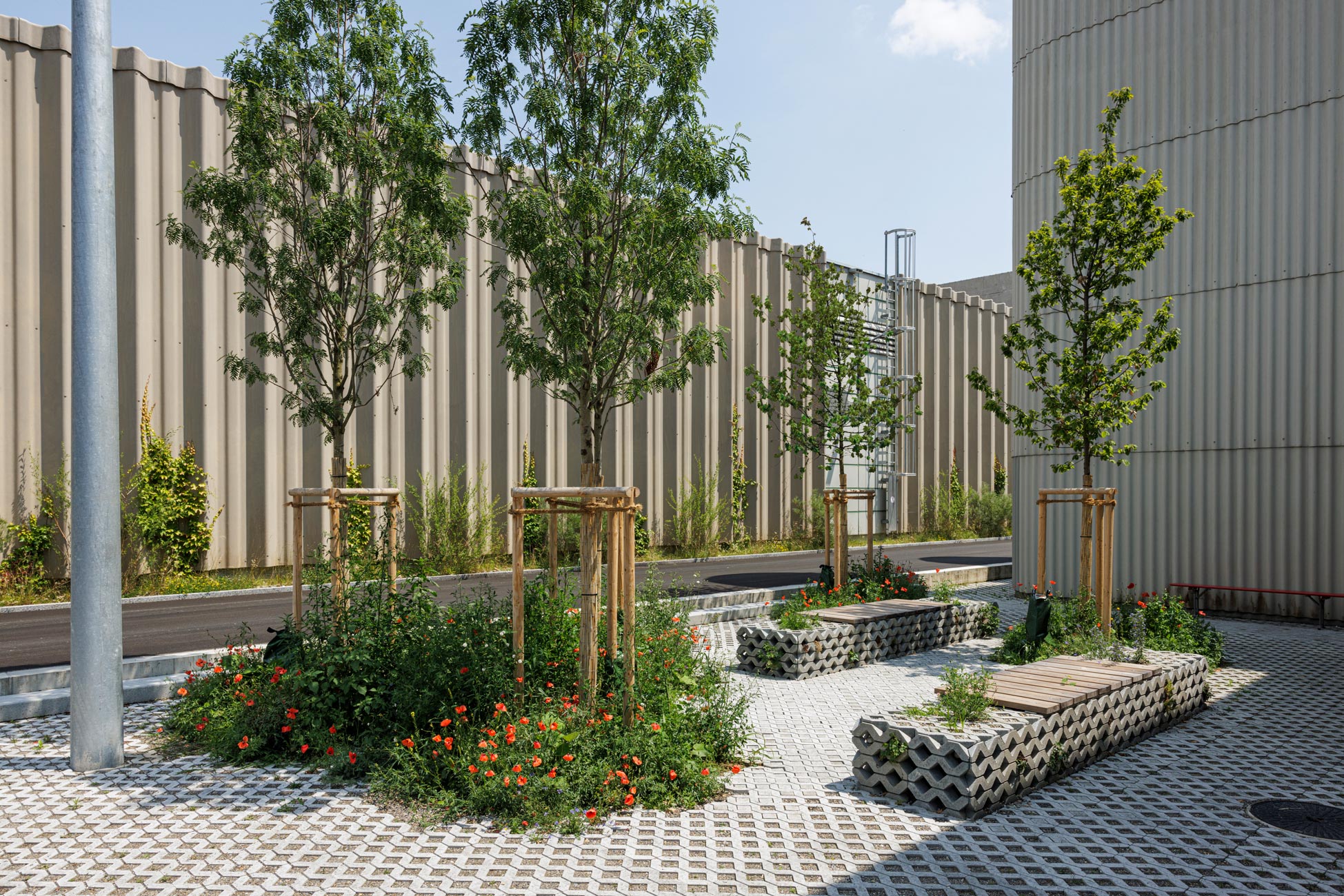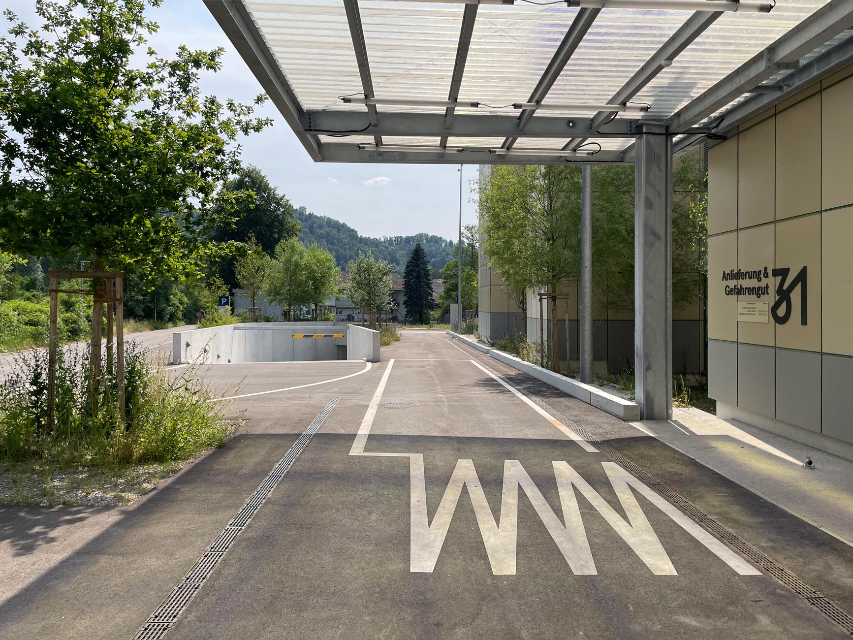Am äusseren Rand des Areals liegen, zu den anschliessenden Wiesen und Feldern, die Besucher- und Nutzerparkplätze. Aus einem zeichnenden, linierten Rasenstein sind sie zu einer graphischen Bordüre gefügt, die einen durchgrünten und robust-befahrbaren Übergang in die Landschaft ausbilden. Die exponierte, in den Landschaftsraum stossende Westecke des Areals wird mit einem farbigen Pavillon als besonderes und überraschendes Objekt ausgezeichnet: Die aus der Demontage eines Bestandsgebäudes angefallenen massiven Stahlträger sind zu einem neuen „Freiraum“ als Rahmenstruktur gefügt. Mit der eingehängten, auf die markante Kyburg im Süden ausgerichteten Landschaftsschaukel lässt der Pavillon einen unvermuteten Ort für Passanten wie Beschäftigten entstehen.