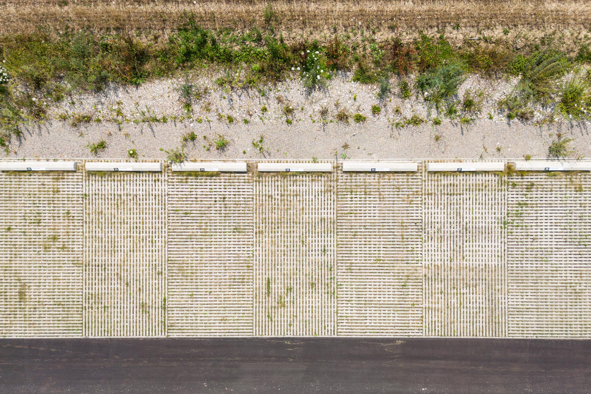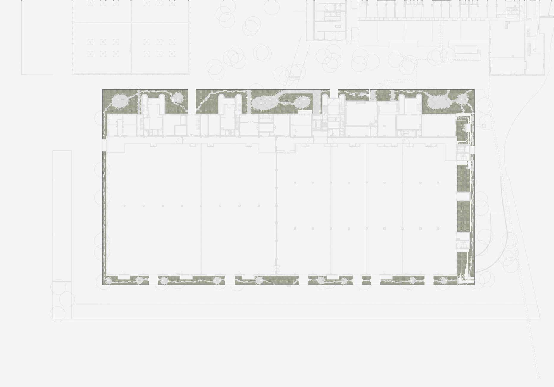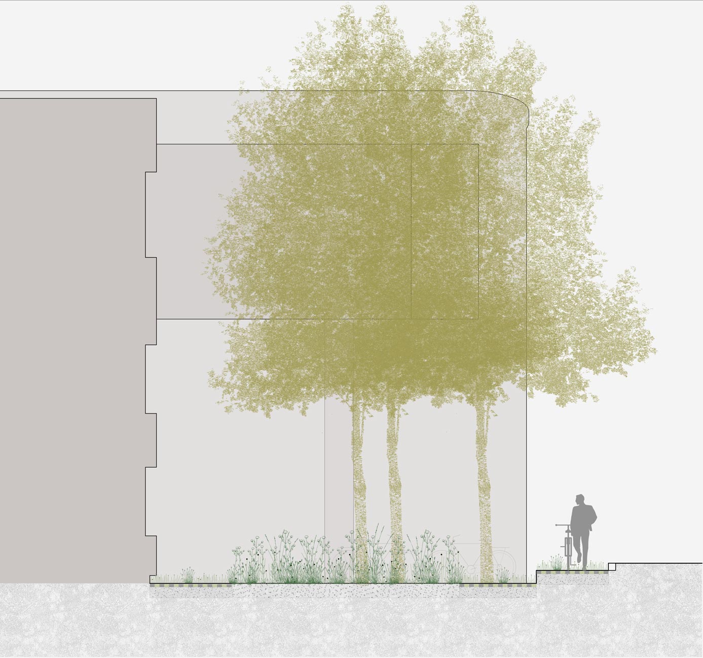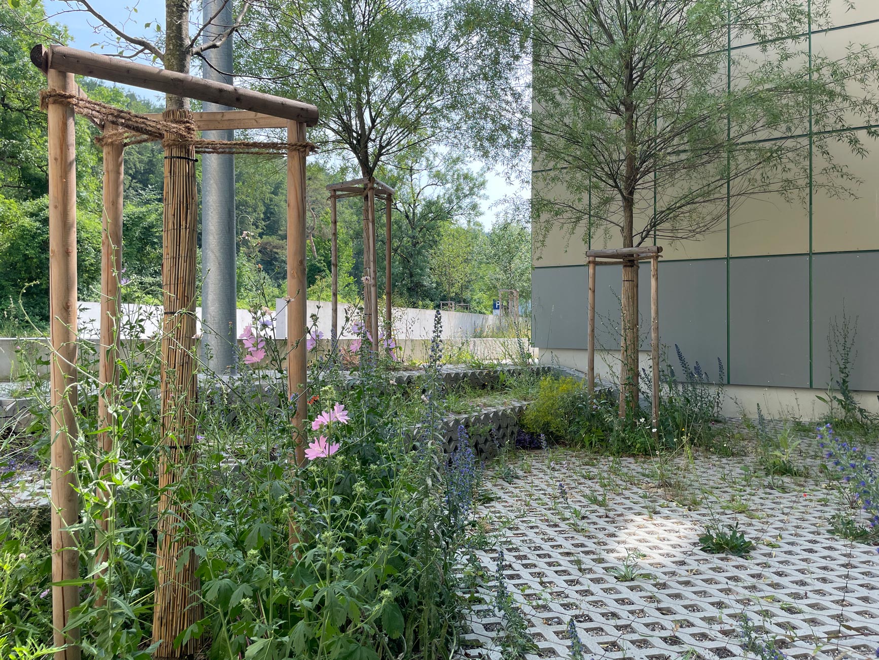 Die Spinnereihallen sowie das ehemalige Ballenlager erhalten je einen schmalen individuellen Saum um den Gebäudekörper gelegt. Ist es beim Ballenlager mit einer flächigen Fassadenbegrünung die schmalstmögliche Vegetationsschicht, so umfasst die Spinnereihallen ein Aufenthalts- und Natursaum. Dieser Saum ermöglicht den höhenmässigen Abgleich der umliegenden Erschliessungsflächen mit den Eingangsniveaus des Gebäudes, ohne wesentliche Anpassungen an der bestehenden Fassade vornehmen zu müssen. Der Saum ist dadurch mal niveaugleich zur Umgehung, mal 20 bis 60cm tiefer liegend. Der Saum wird mit einem Rasengitterbelag ausgelegt, in den mit Füllsteinen Pfade und Aufenthaltsbereiche eingeschrieben sind. Bäume spriessen aus dem Belag und bieten Pflanzinseln für Ruderalvegetation, die auch in den Rasengitterbelag eingesät wird. Es entsteht eine hybride Situation aus naturnaher, spriessender Vegetation und seriell fabriziertem, trittfestem Bodenbelag. Brückenartige Rampen gewährleisten den ebenerdigen Zutritt ins Gebäude.