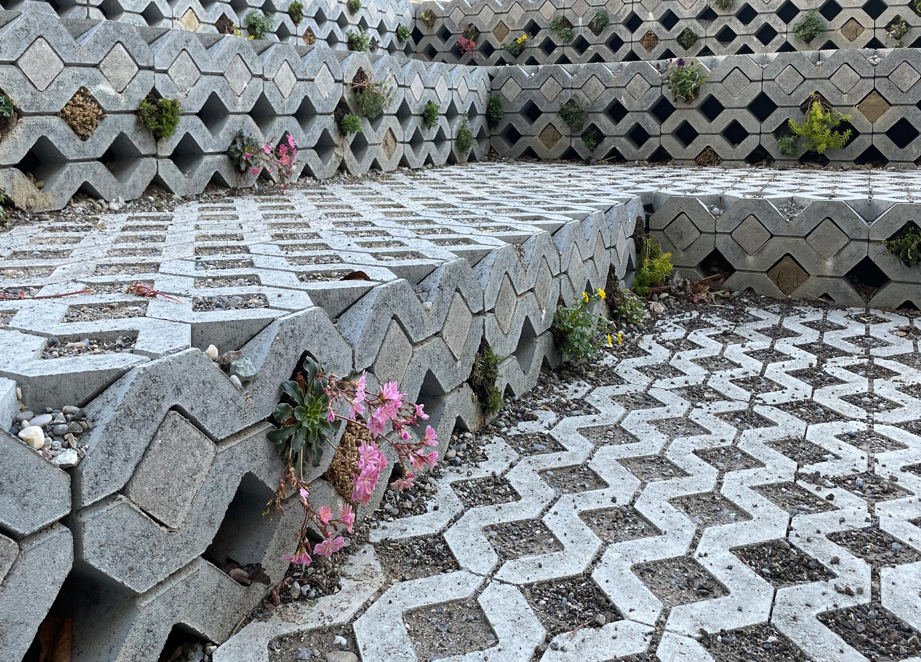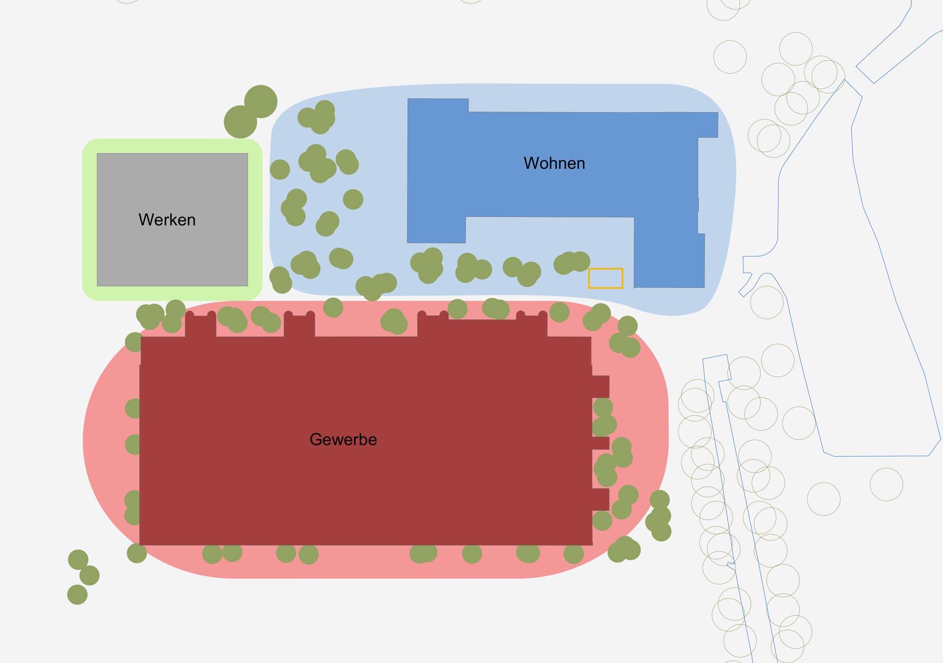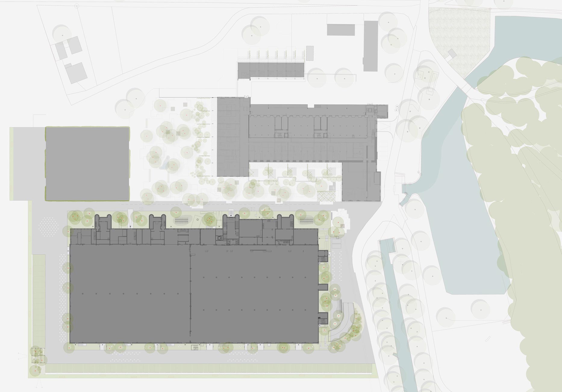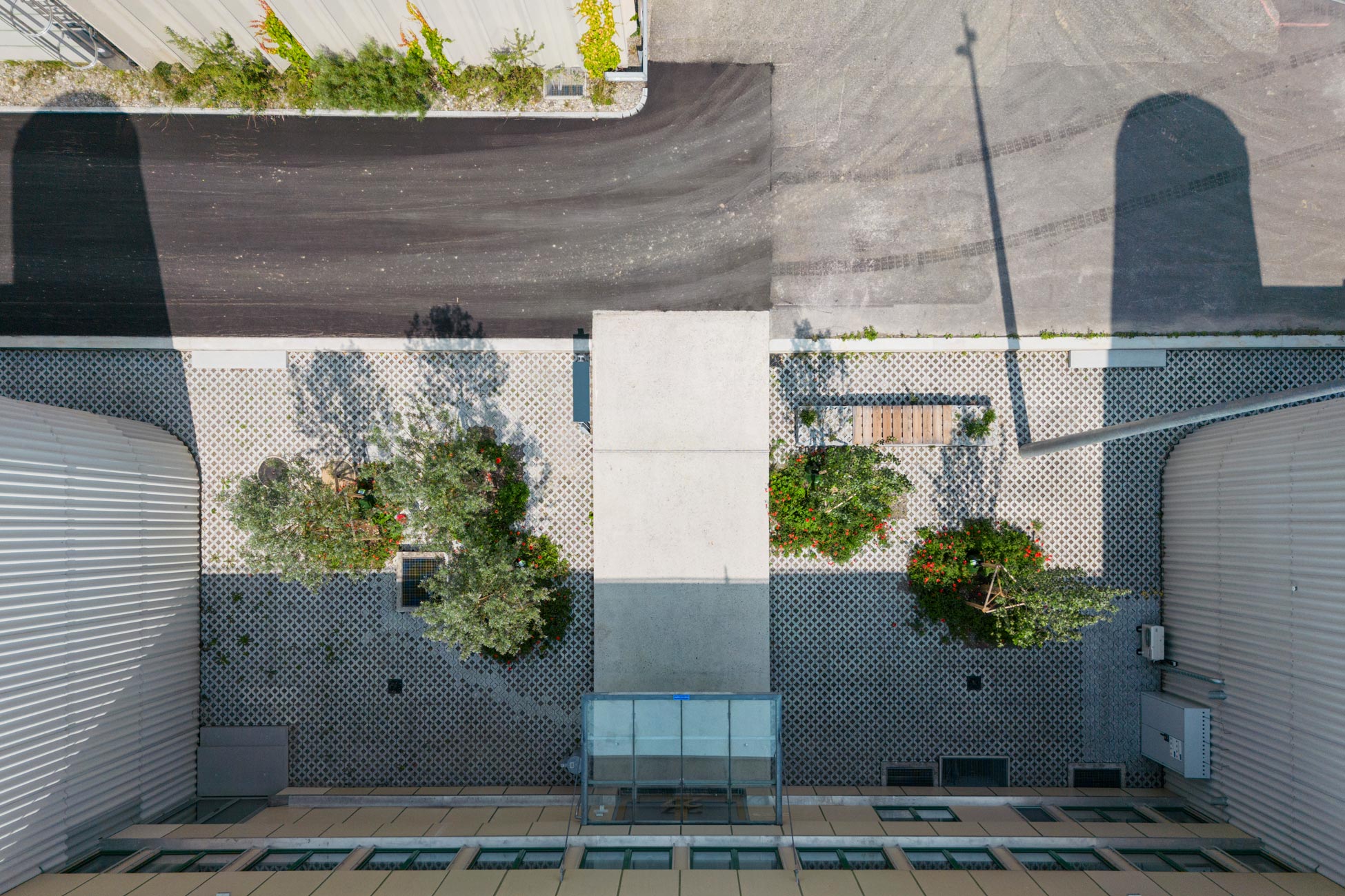 Die Spinnereihallen sowie das ehemalige Ballenlager erhalten je einen schmalen individuellen Saum um den Gebäudekörper gelegt. Ist es beim Ballenlager mit einer flächigen Fassadenbegrünung die schmalstmögliche Vegetationsschicht, so umfasst die Spinnereihallen ein Aufenthalts- und Natursaum. Dieser Saum ermöglicht den höhenmässigen Abgleich der umliegenden Erschliessungsflächen mit den Eingangsniveaus des Gebäudes, ohne wesentliche Anpassungen an der bestehenden Fassade vornehmen zu müssen. Der Saum ist dadurch mal niveaugleich zur Umgehung, mal 20 bis 60cm tiefer liegend. Der Saum wird mit einem Rasengitterbelag ausgelegt, in den mit Füllsteinen Pfade und Aufenthaltsbereiche eingeschrieben sind. Bäume spriessen aus dem Belag und bieten Pflanzinseln für Ruderalvegetation, die auch in den Rasengitterbelag eingesät wird. Es entsteht eine hybride Situation aus naturnaher, spriessender Vegetation und seriell fabriziertem, trittfestem Bodenbelag. Brückenartige Rampen gewährleisten den ebenerdigen Zutritt ins Gebäude.