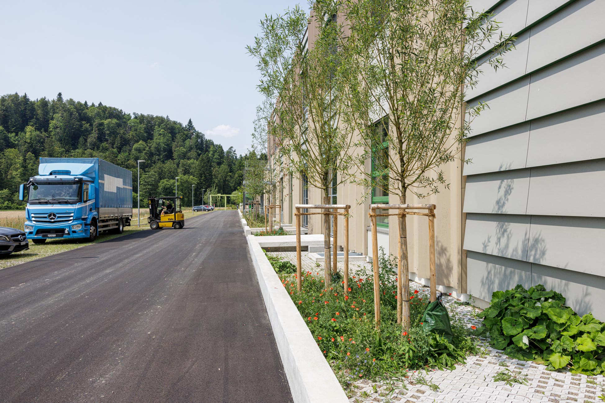 Die Spinnerei Bühler erhält neues Leben eingehaucht. Mit der Sanierung und Umnutzung der ehemaligen Fabrikationshallen zu Büro- und Gewerbeeinheiten wird der umliegende Freiraum zur maximal funktionalen Verkehrsfläche für LKW-Anlieferung und Mitarbeiterparkplätze ausgebaut. Gleichwohl wird dem limitierten Freiraum ein den Nutzern dienender, atmosphärischer Aussenraum „abgewonnen“.