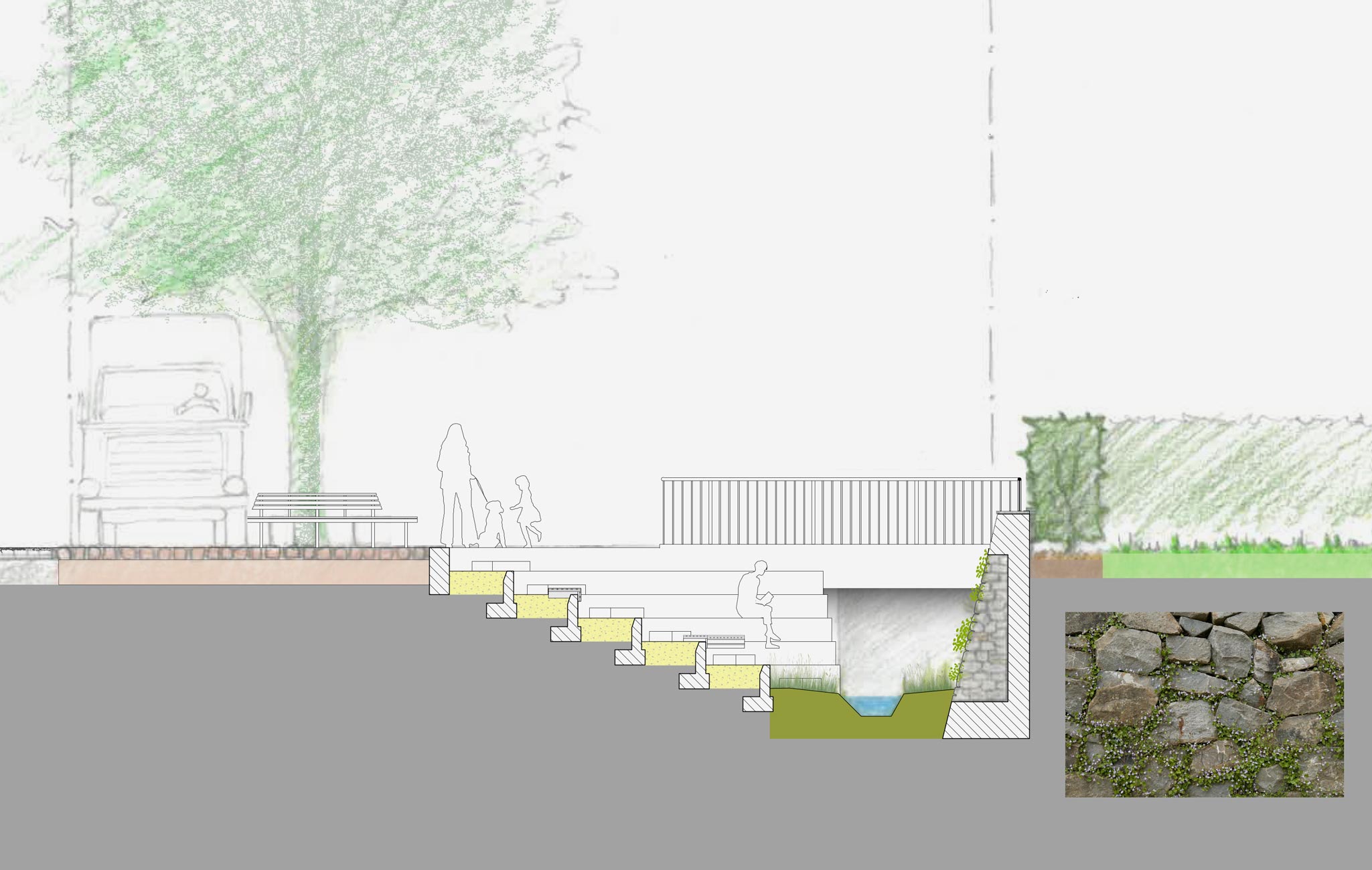 Das angrenzende Bachfenster als Öffnung zum unter dem Platz verlaufenden Bach ist auf der linken Uferseite mit Sitzstufen von der Platzfläche bis zum vegetationsgesäumten Bachbett abgestuft und ermöglicht mit seiner sich in den Platz ausdehnenden Öffnung das Bacherlebnis für alle. In seiner hydraulisch optimierten Formgebung weiten sich die Uferwände des Tunnels stufenförmig in Fliessrichtung aus, und bieten sich als grosszügige gekieste Stufen für den Aufenthalt und das Hinuntergehen zum Wasser an. Zum Auslauf der Bachöffnung verengen sich die Stufen wieder bis zur Senkrechte der Tunnelwand. Die rechte Uferseite sowie die Fassungen des zweiten Bachfensters bestehen aus geschichteten und in ihren Fugen begrünten Natursteinmauern.