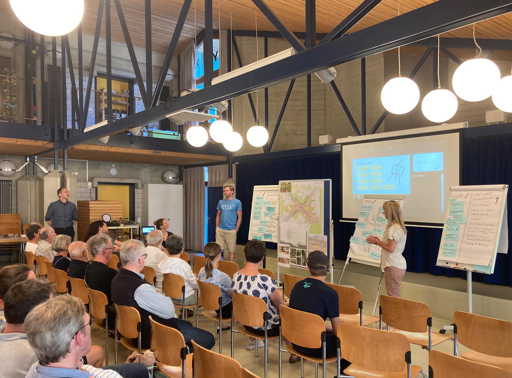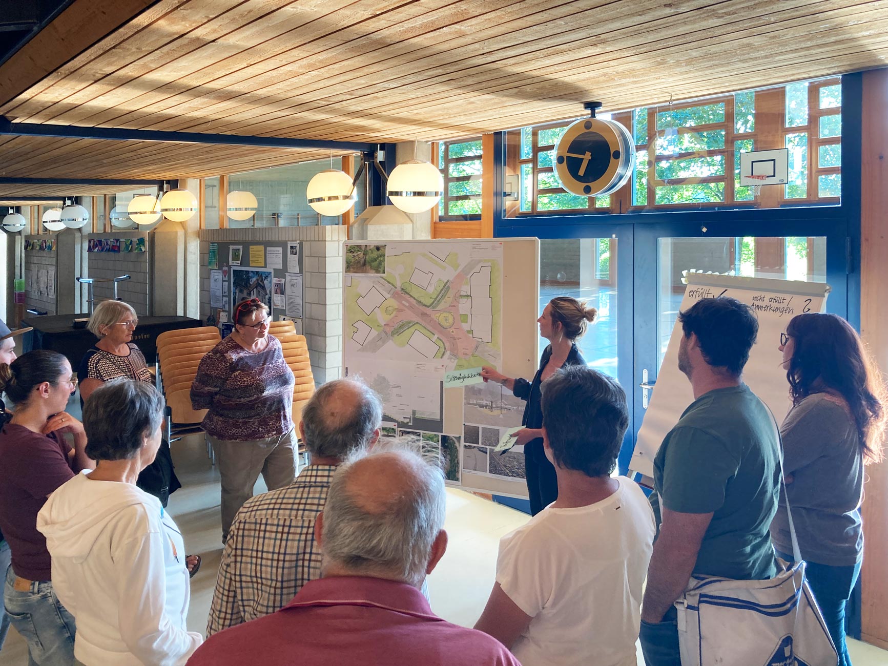 Der Dorfbrunnen erhält seine neue Verortung in der Süd-West-Ecke des Platzes und bezieht so den Platzrand mit ein. Zwischen Linde und Brunnen spannt ein mehrköpfiger Kandelaber als Dorflaterne bei Dunkelheit die Platzsphäre auf.
