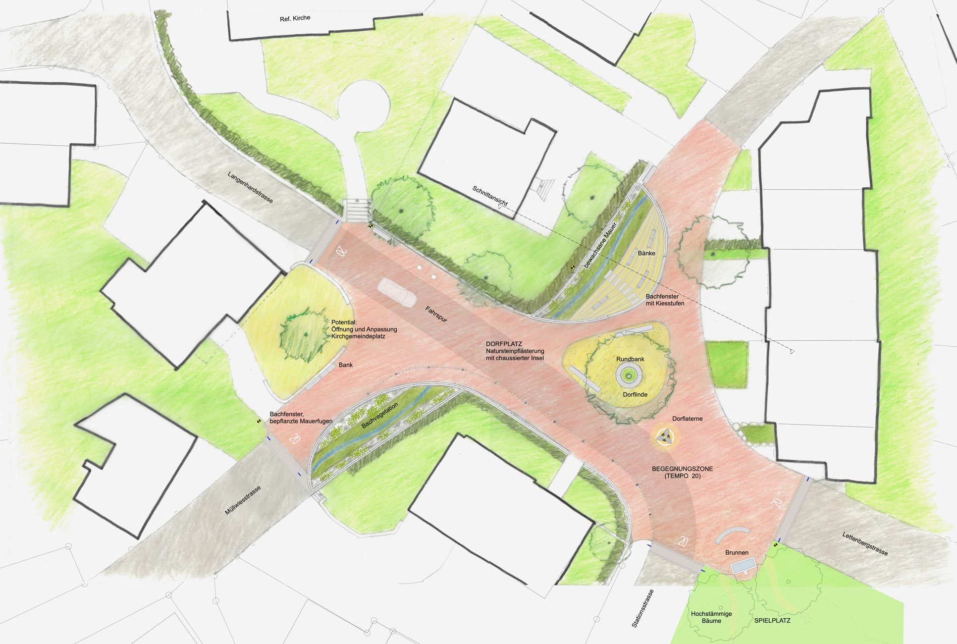 Der Platz mit seinen Verästelungen in die angrenzenden Strassen erhält daher einen eigenständigen Belag aus regionaltypischem Natursteinpflaster, der ihn vom umliegenden Strassenraum abgrenzt und als Begegnungszone (Tempo 20) kennzeichnet. Innerhalb der Platzfläche definiert eine neue Dorflinde auf einer chaussierten Belagsinsel den Mittelpunkt des Geschehens und ist mit Sitzbänken ausgestattet.