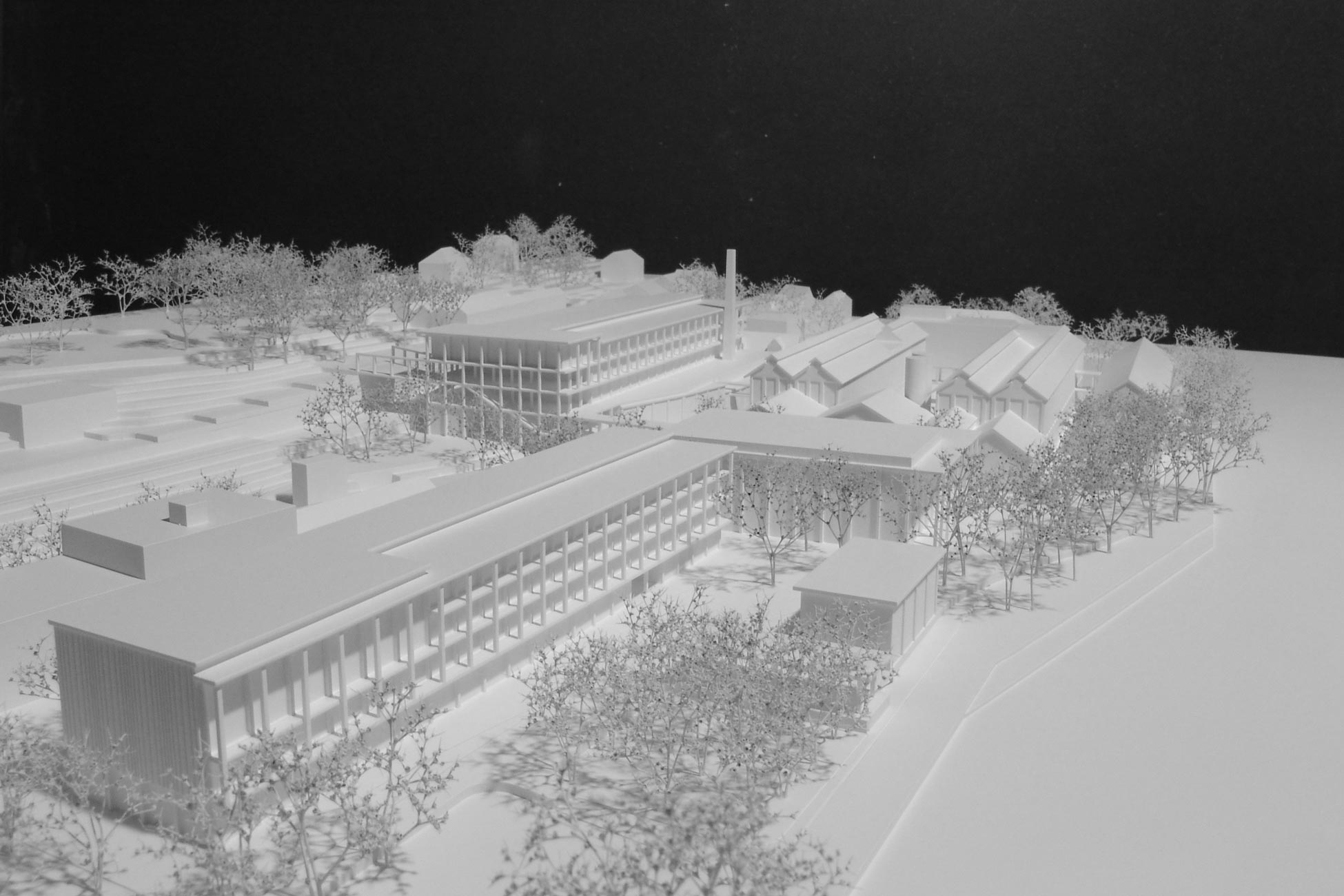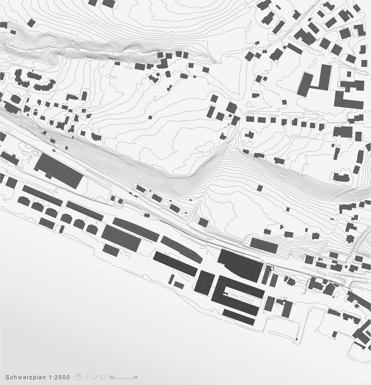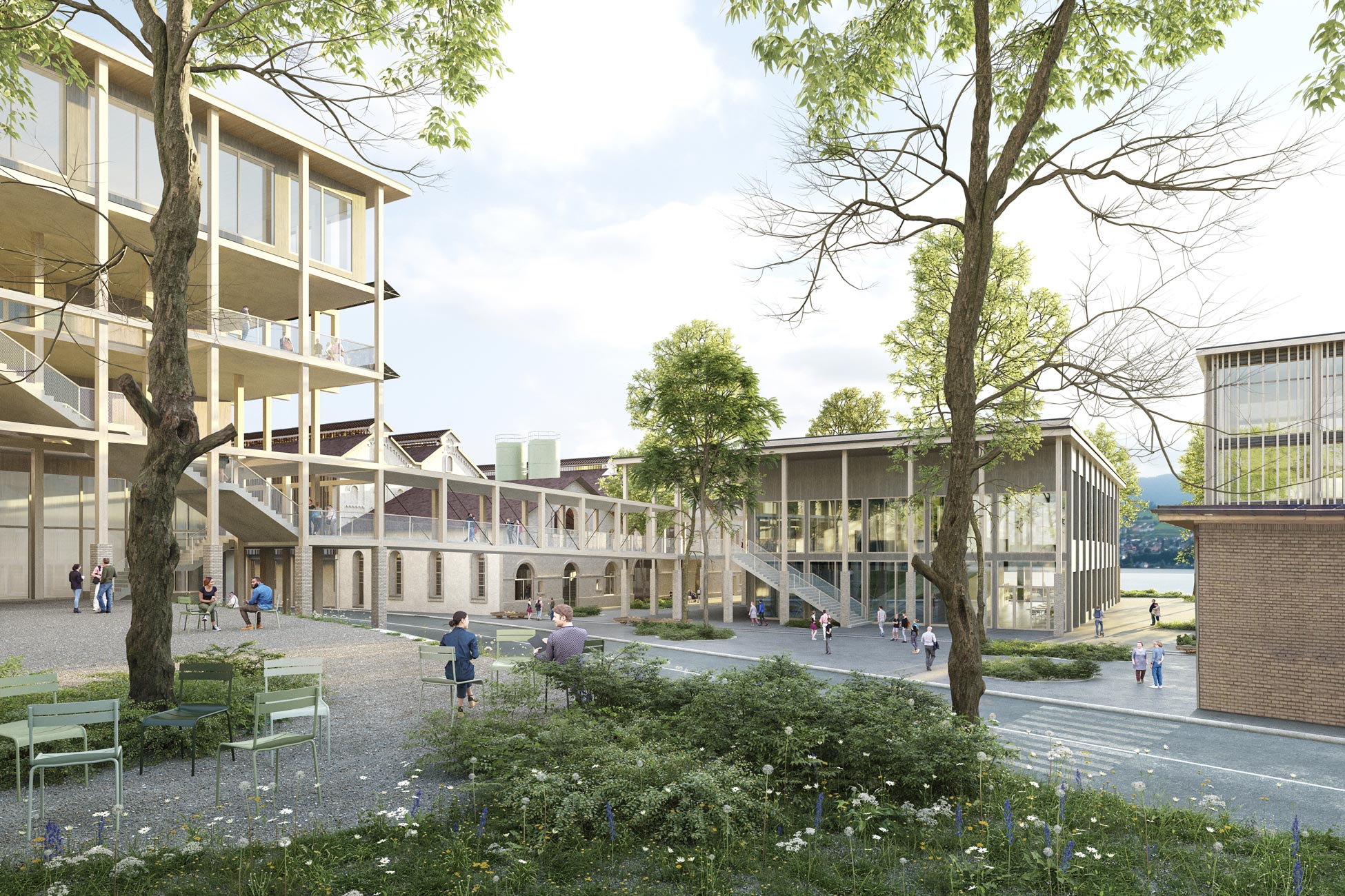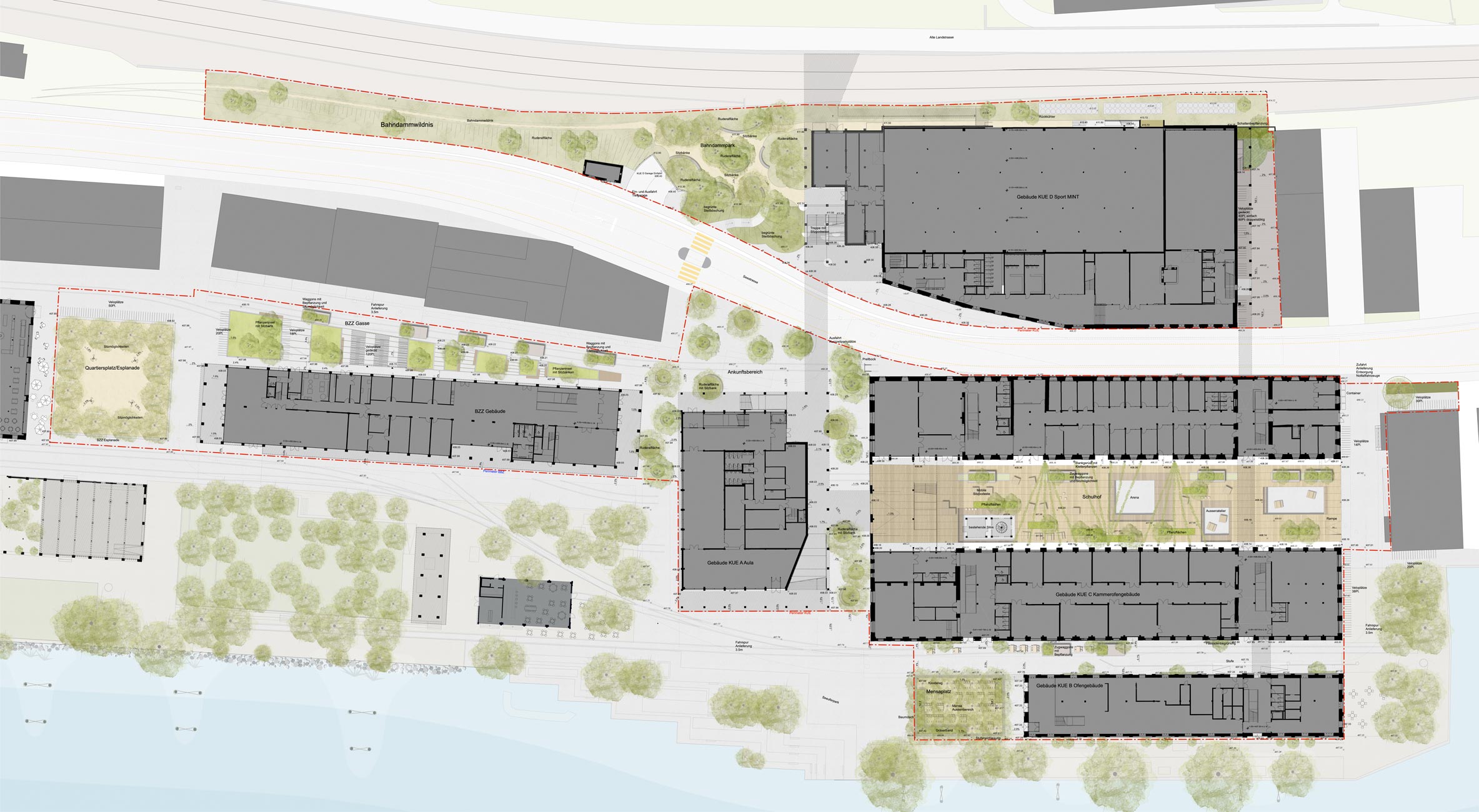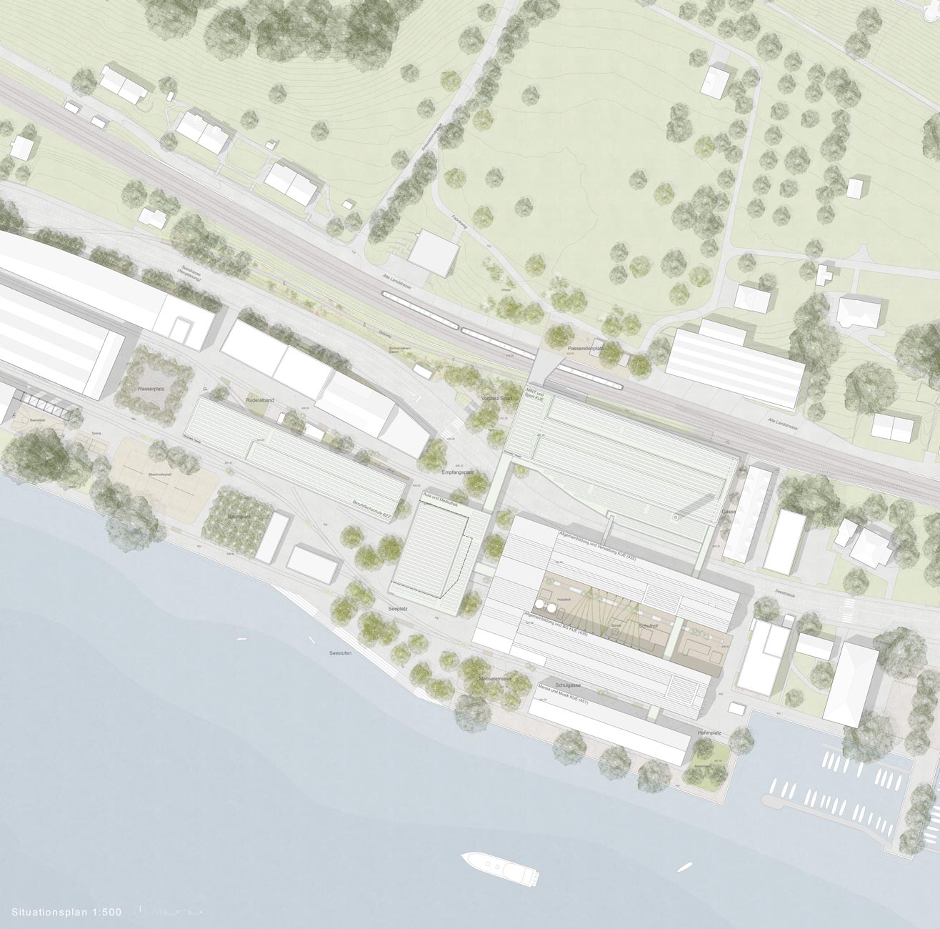 Das Ensemble aus Kantonsschule, Berufsfachschule und Aula fügt sich zusammen mit den zugehörigen Freiräumen in den langgestreckten, linearen Kontext des neu entstehenden Ortsteils ein. Gleichzeitig wird die Aula mit der quer zur Uferlinie liegenden Passerelle zum Kopf der neuen Verbindungsachse zwischen Dorf und See.