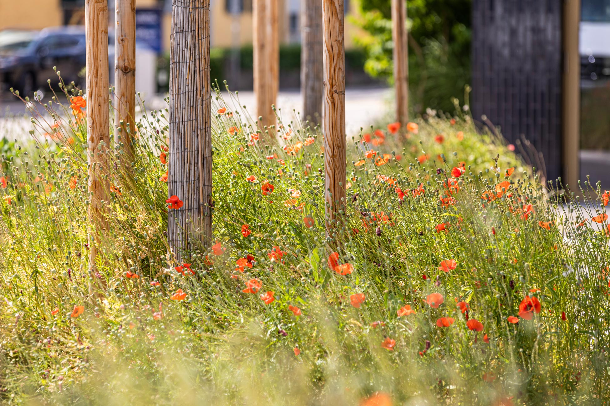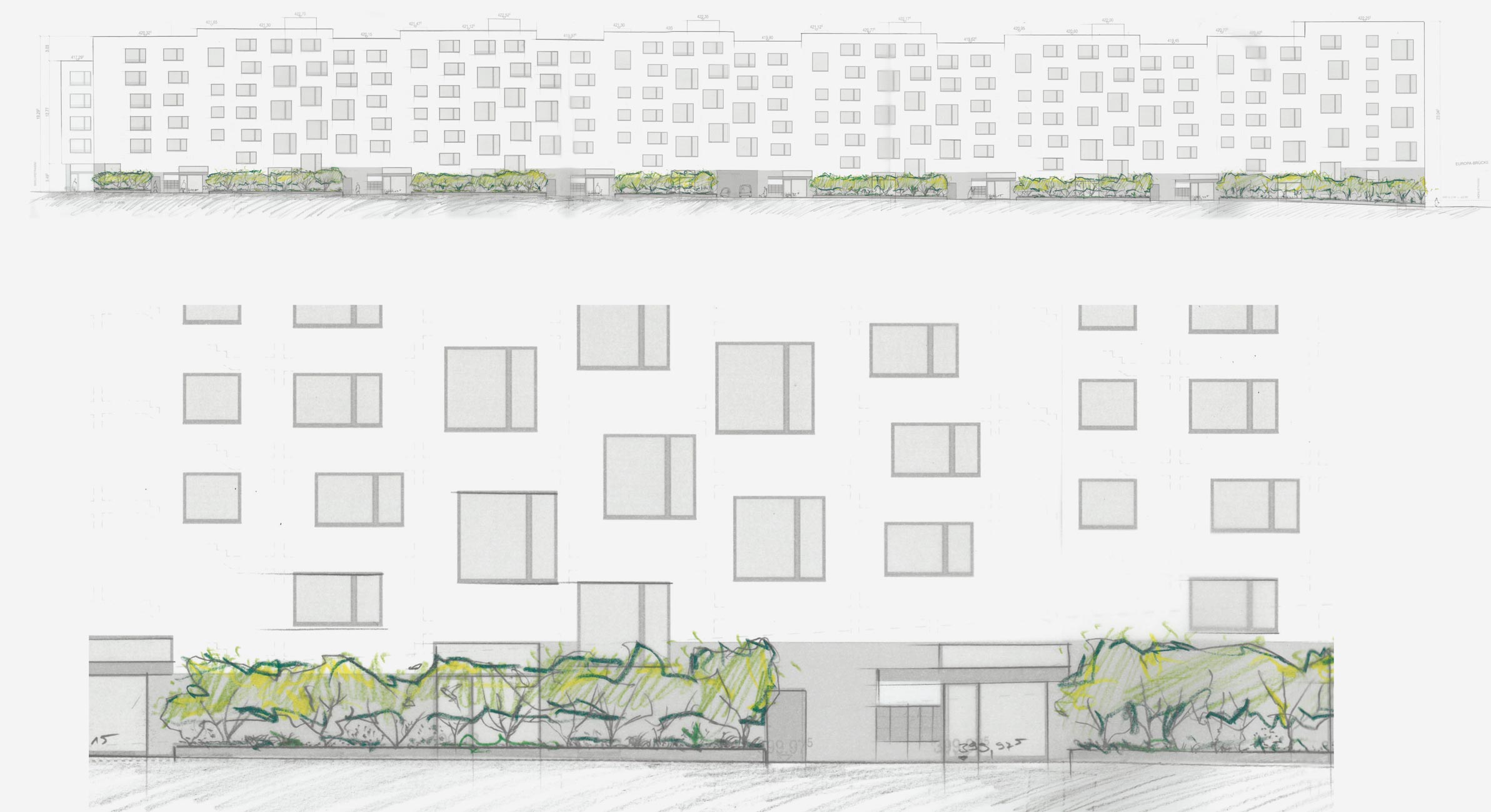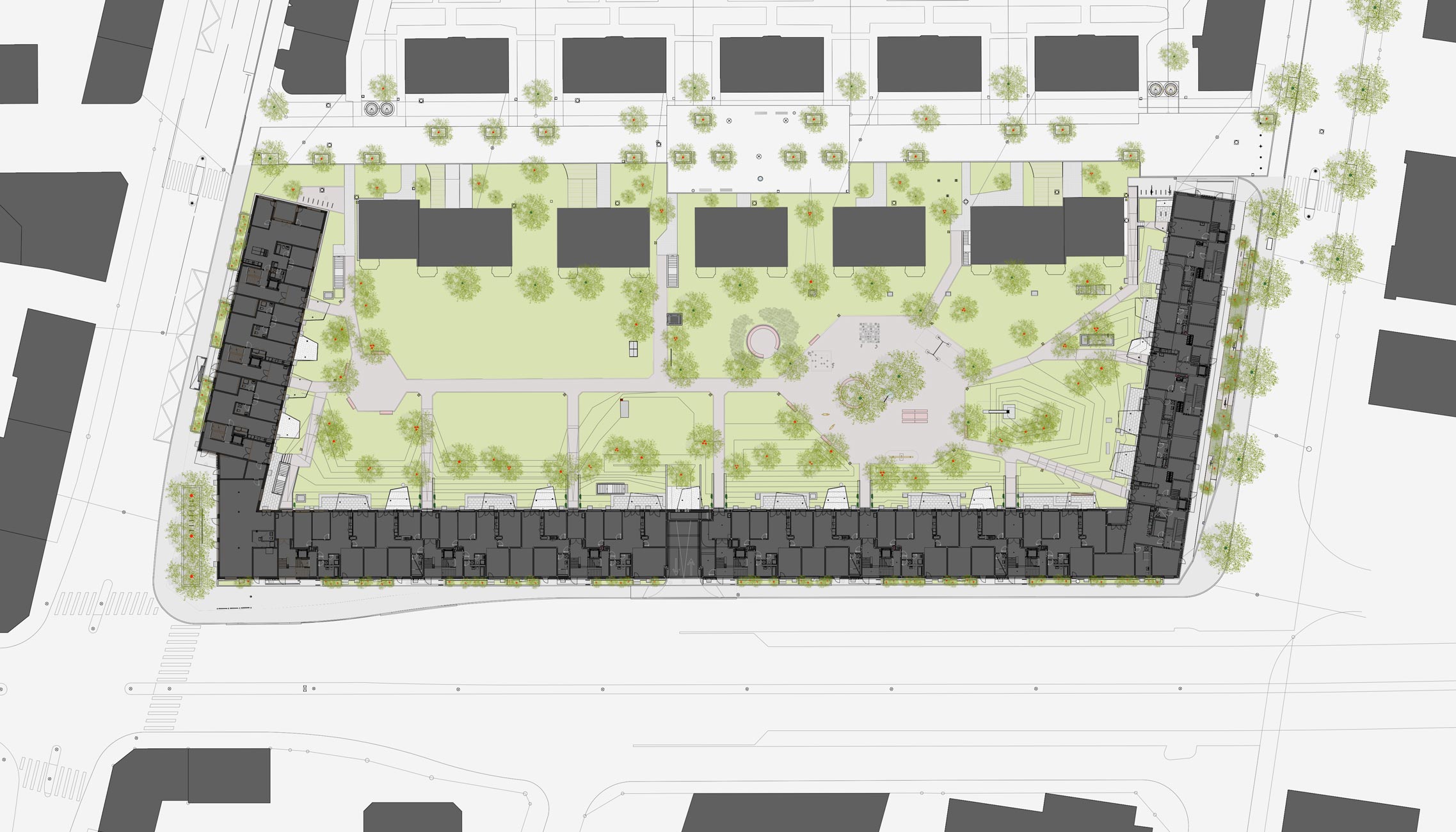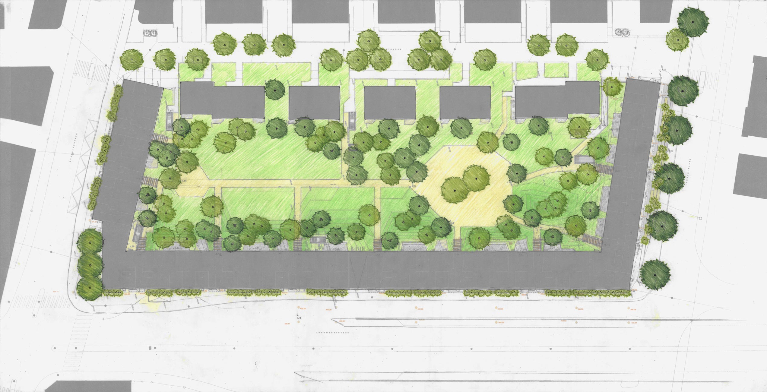 Mit dem Ersatzneubau werden 144 Wohnungen bei Erhaltung der ursprünglichen Hofsituation geschaffen. Dem flankierenden urbanen Strassenraum wird mit üppig bepflanzten Fassadensockeln ein schmalstmöglicher Vorgartenbereich entgegengestellt. Die Vielfalt an Ziergehölzen und Stauden kontrastieren mit ihrer Opulenz das harte Stadtumfeld und lassen eine ganz eigene Qualität von Stadtlandschaft entstehen.