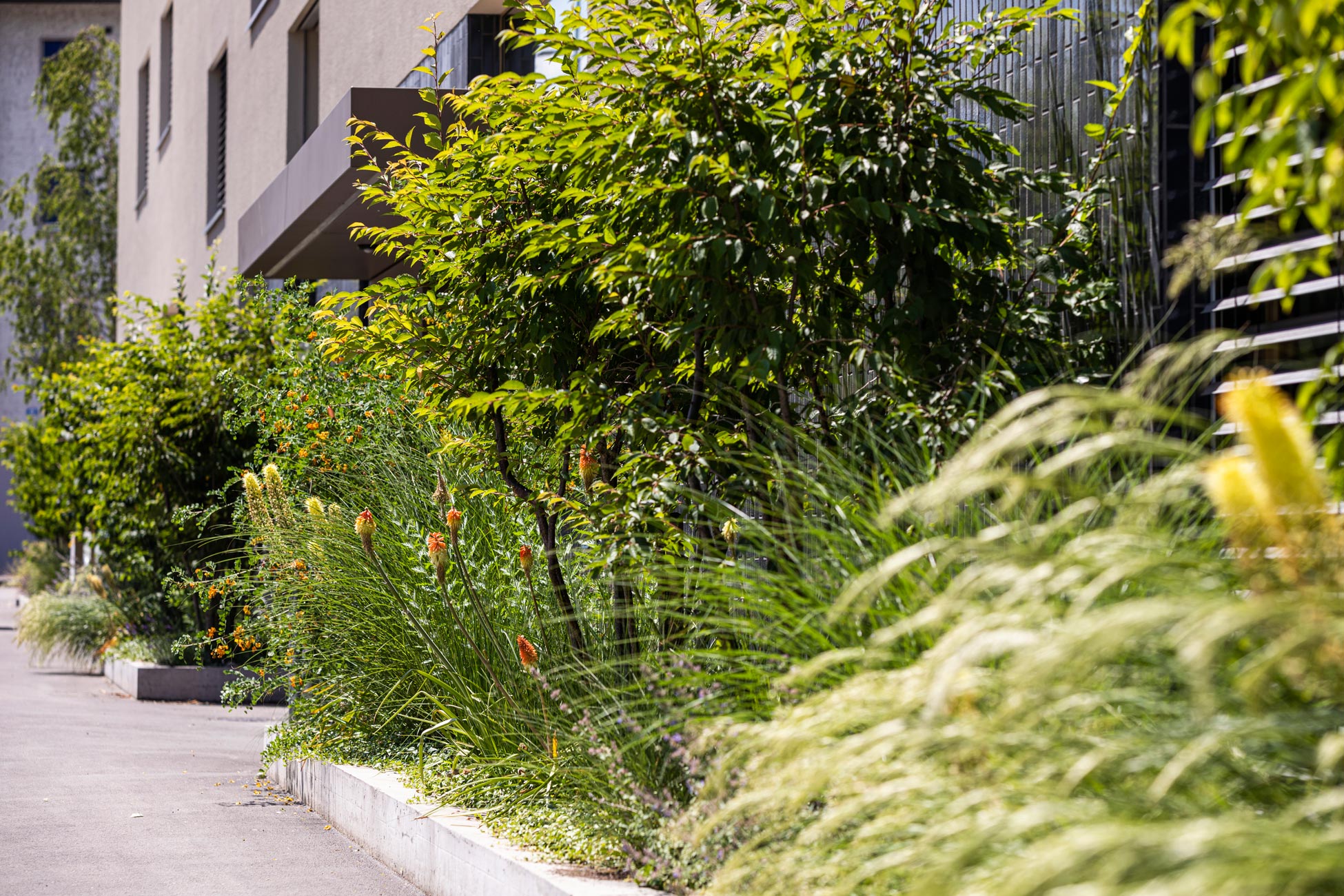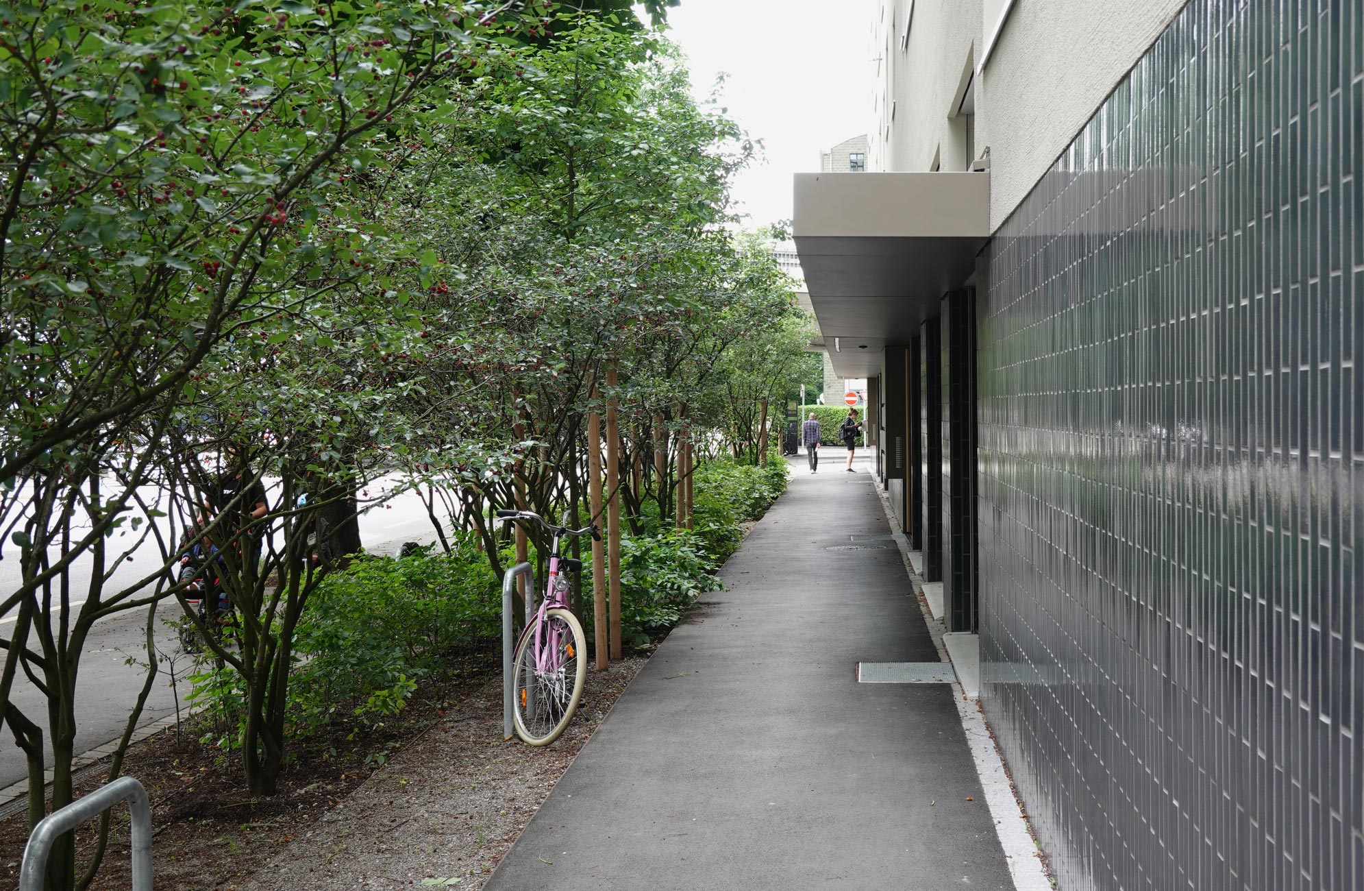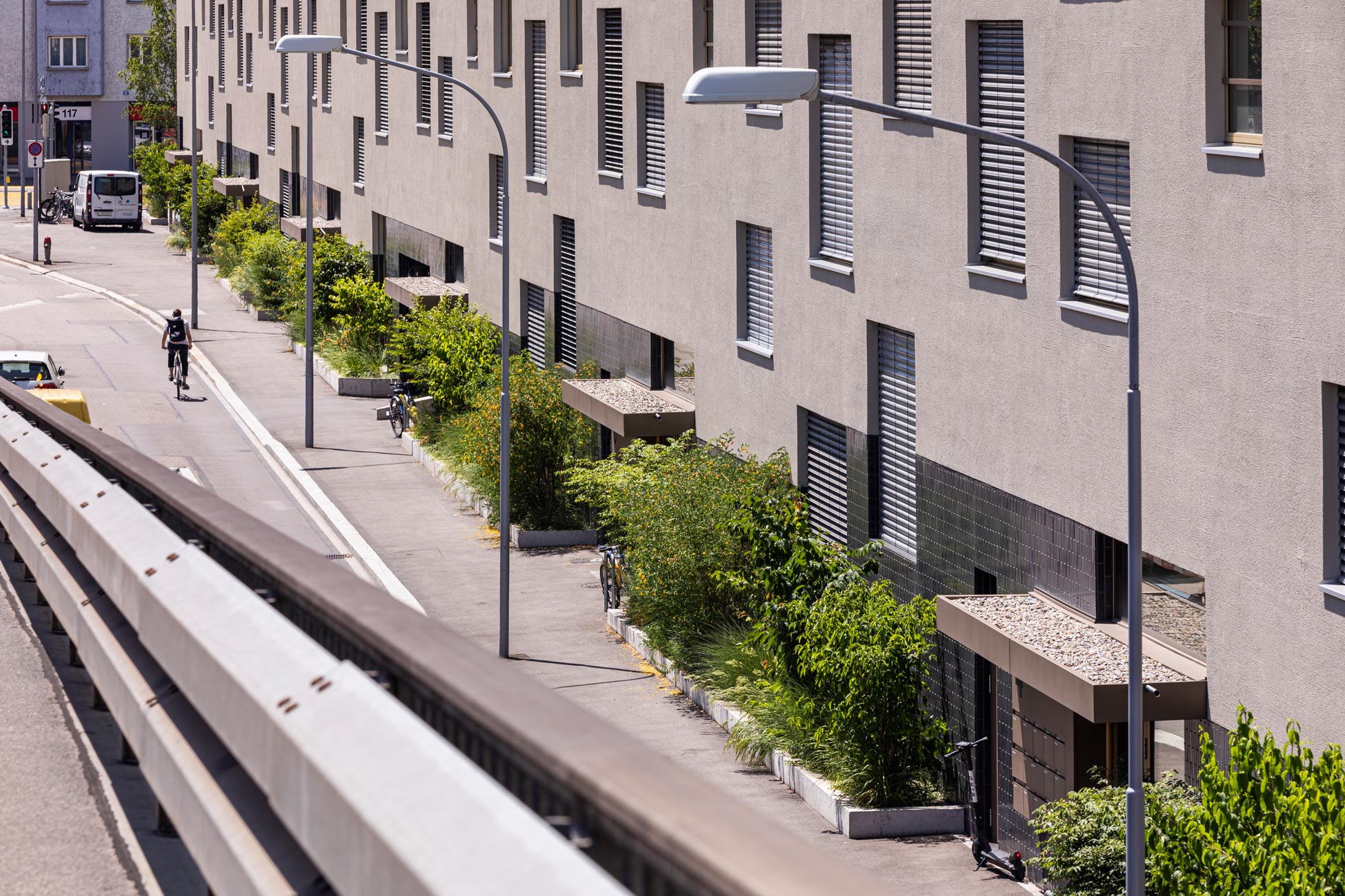 Zur Hohlstrasse löst sich das Vorgartenband von der Fassade und wird zum durchlässigen Grünfilter zwischen Trottoir und Hauserschliessung.