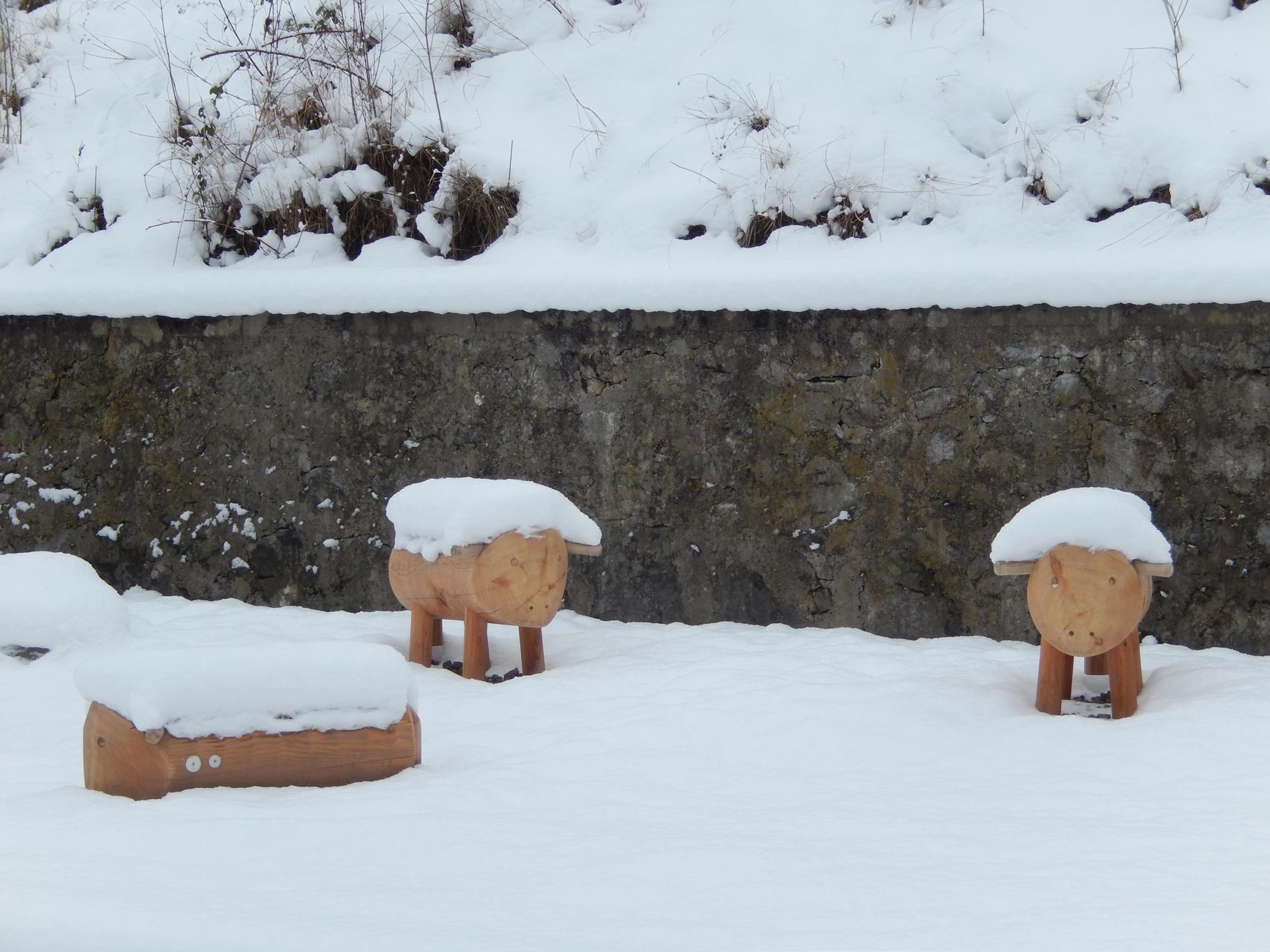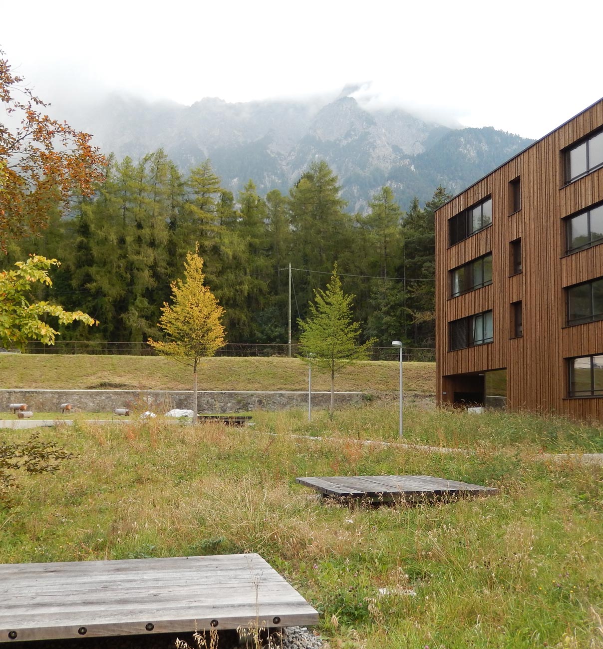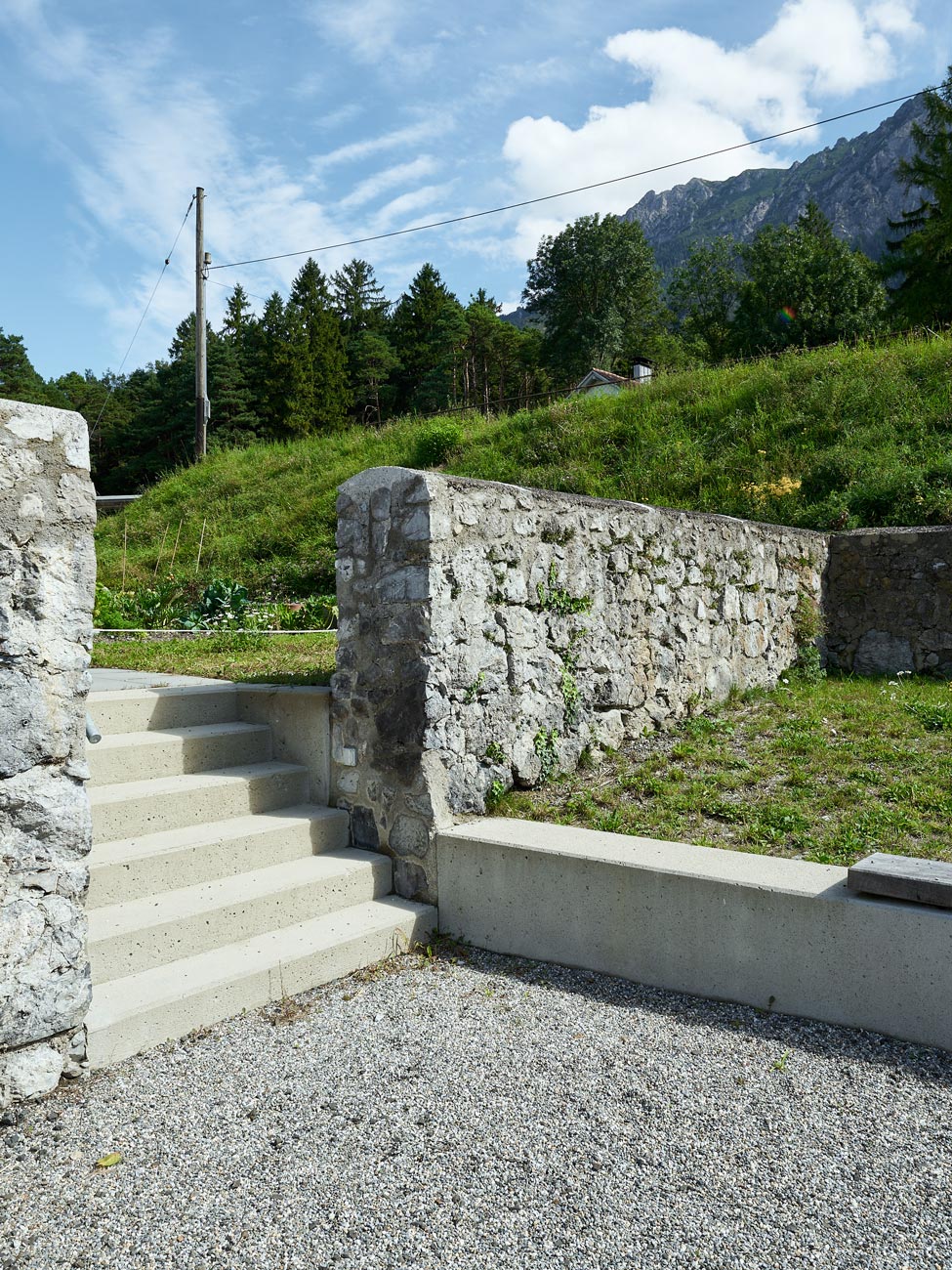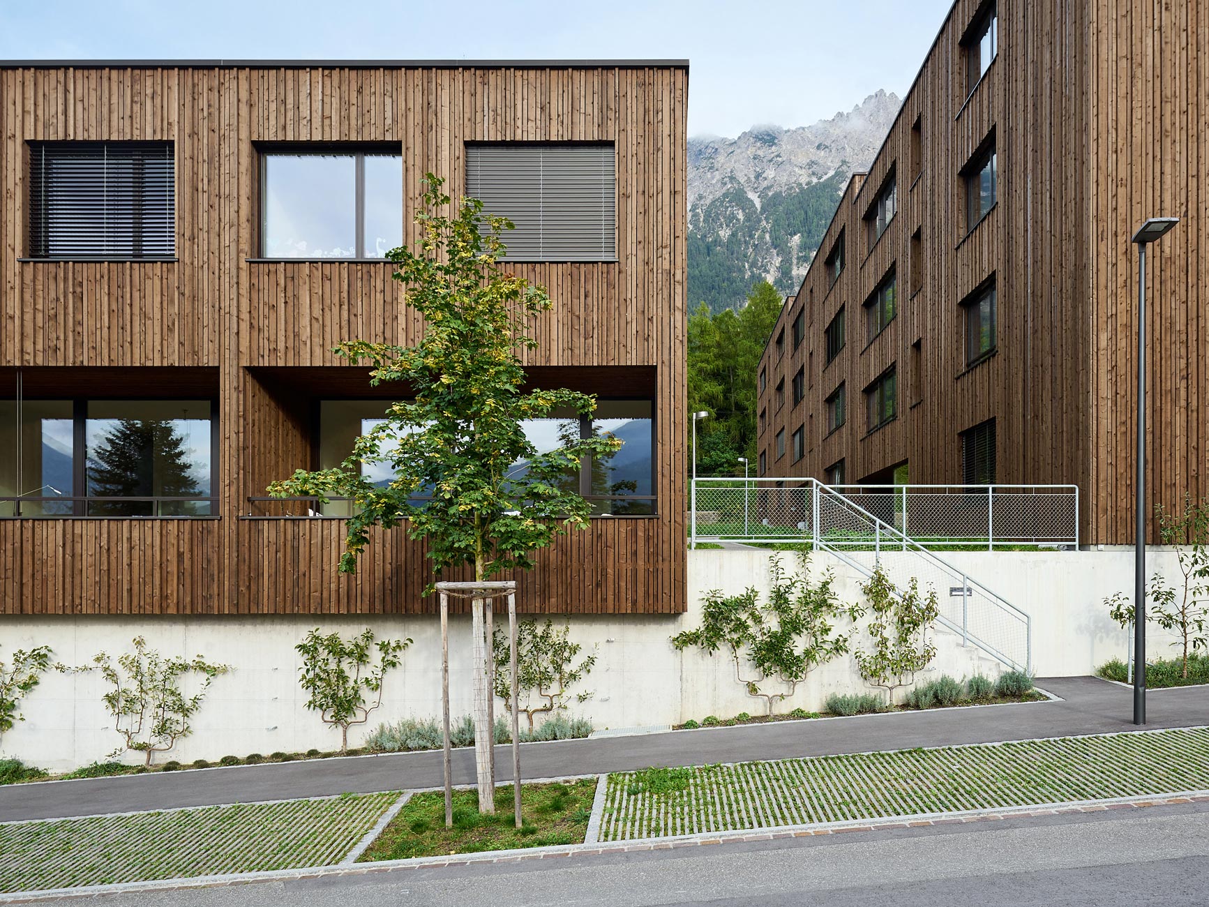 Zur talseitigen Strasse grenzen die Wohnbauten mit einer verbindenden sockelartigen Stützmauer an, die als Rücken für Spalierapfelbäume dient. Die auf dem Sockel aufsitzenden und auskragenden Häuser erscheinen dem Passanten so wie von einer Obsthecke getragen. Eine kleine Platzsituation mit Brunnen an der Zufahrtsstrasse bietet dem Spaziergänger oder Radfahrer die Gelegenheit zu einer kleinen Rast, bevor er den Ort verlässt und die raue Gebirgswelt hinter dem baumbestandenen Muren-Schutzwall betritt.