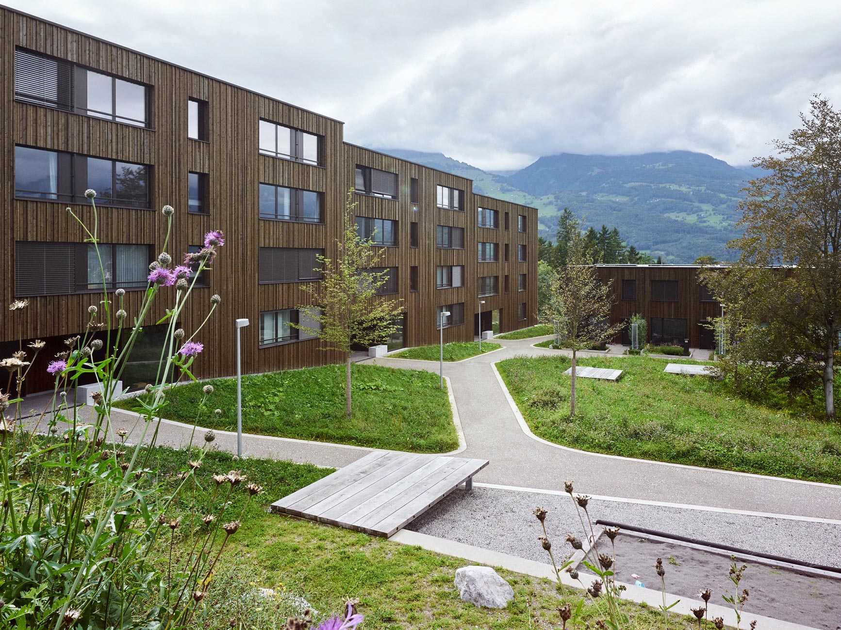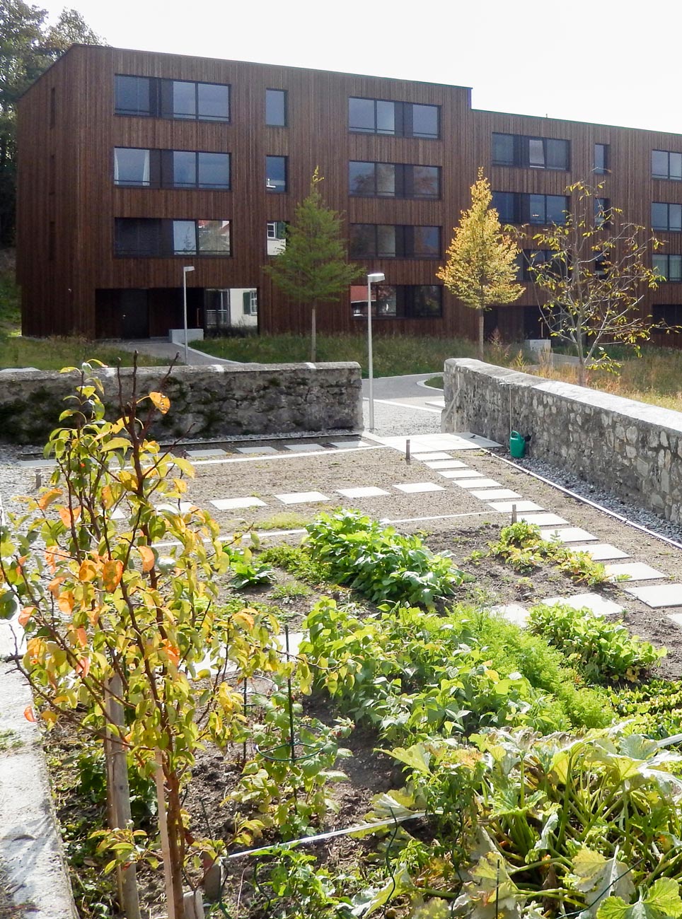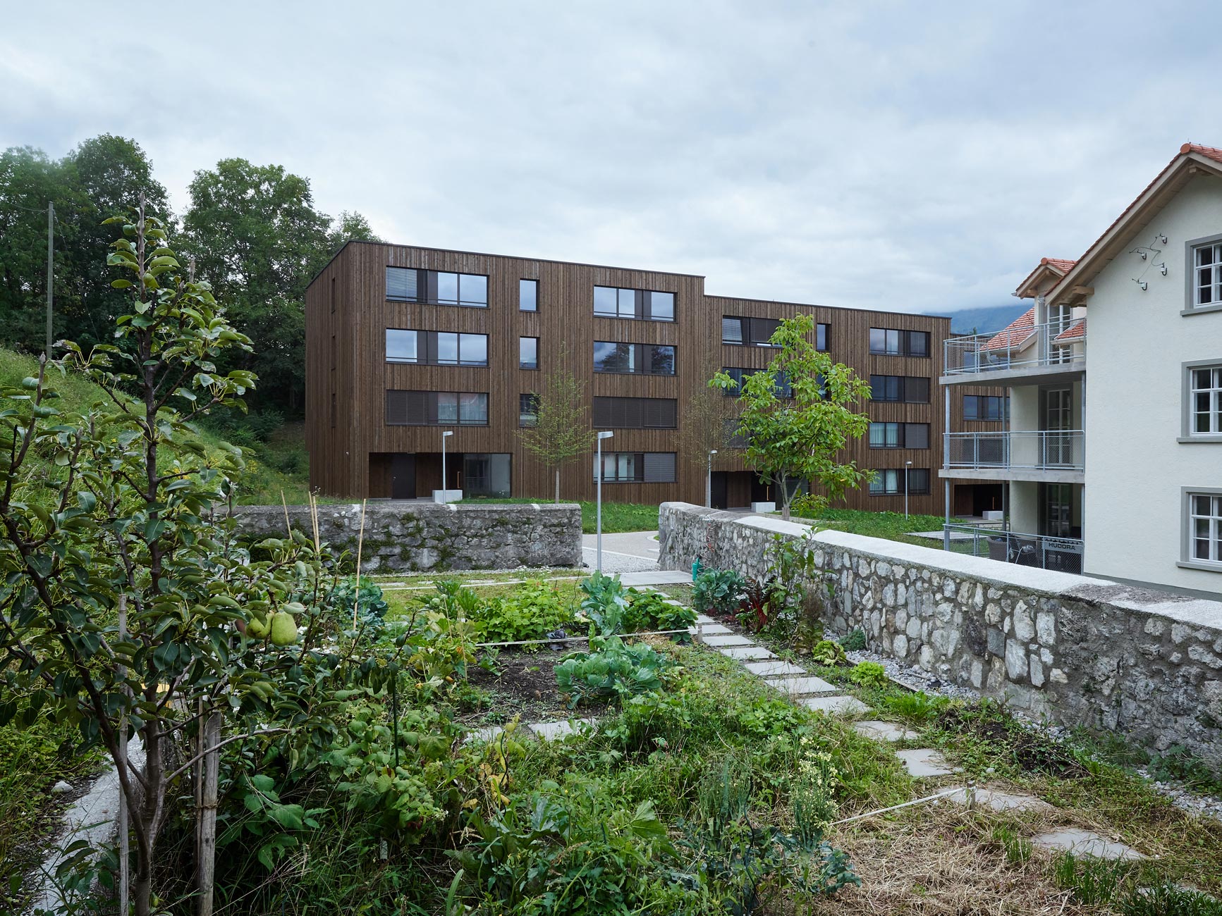 Die Umgebungsgestaltung zu den neuen, ein denkmalgeschütztes Wohnhaus ergänzenden Wohnbauten nimmt die vorhandenen Themen der fast idyllischen Situation vor Ort auf: Am hangseitigen Ortsrand mit dörflichen Strukturen gelegen entsteht ein ländlicher Hofraum mit einem fliessenden Wiesengrund, in den lediglich der Erschliessungsweg, der Topographie folgend, eingebettet ist. An die zeichnende, den Hof umlaufende Wegefigur schliesst am höchsten Punkt des Areals ein kleiner Spielbereich sowie ein von mächtigen alten Mauern gefasster, kanzelartiger Potager – ein Gemüsegärtlein für Bewohner mit grünem Daumen – an. Einzelne Solitärbäume setzen Akzente auf der Wiese und bieten zusammen mit Holzflössen beschattete Sitzbereiche im Sommer.