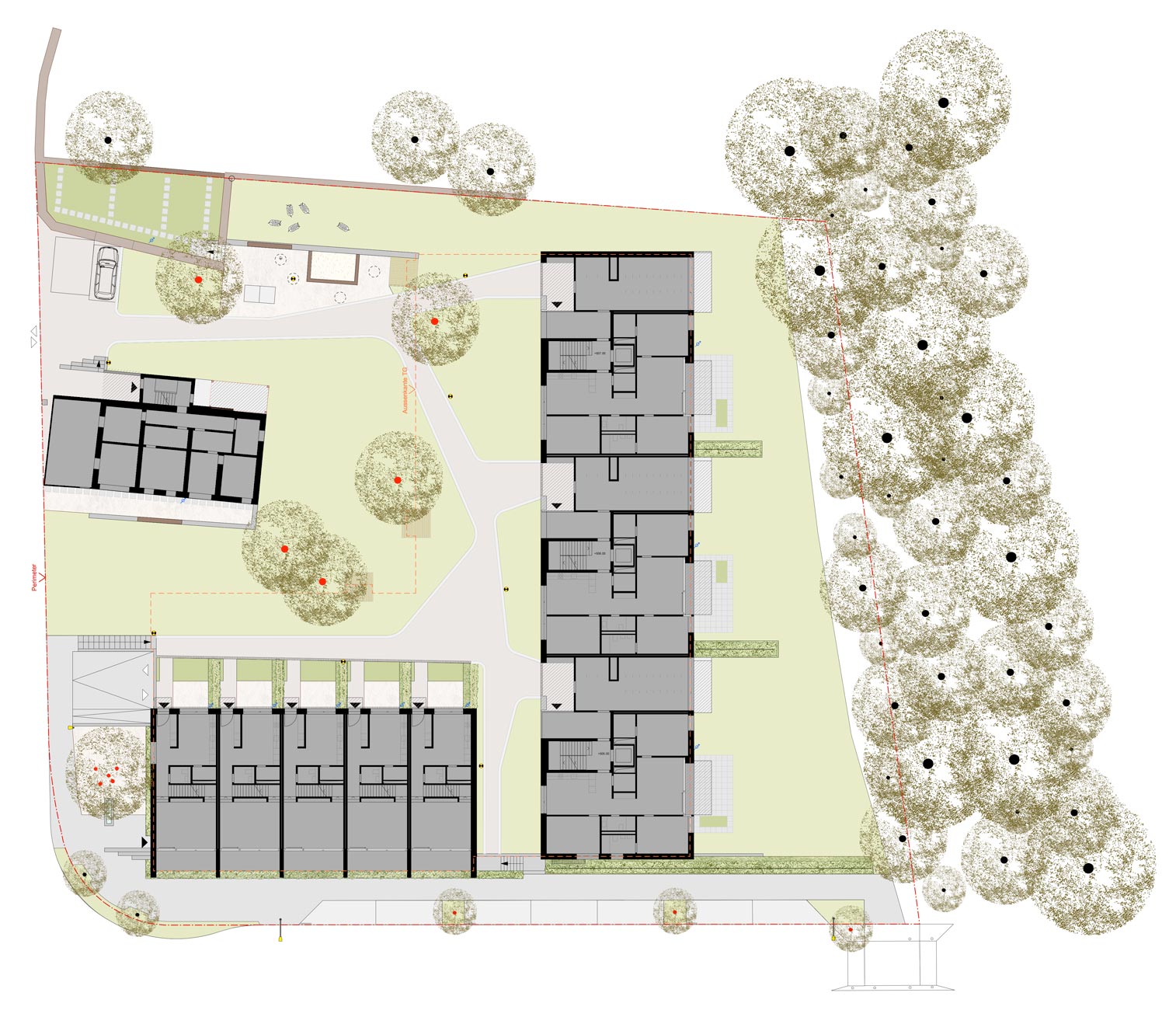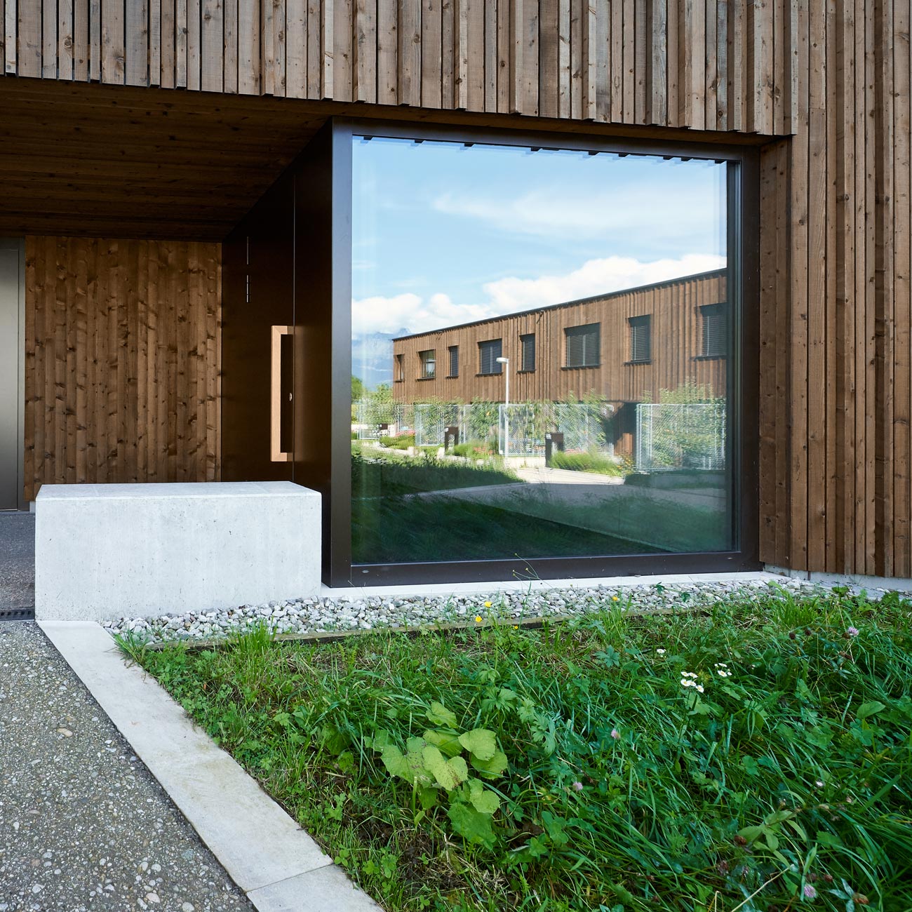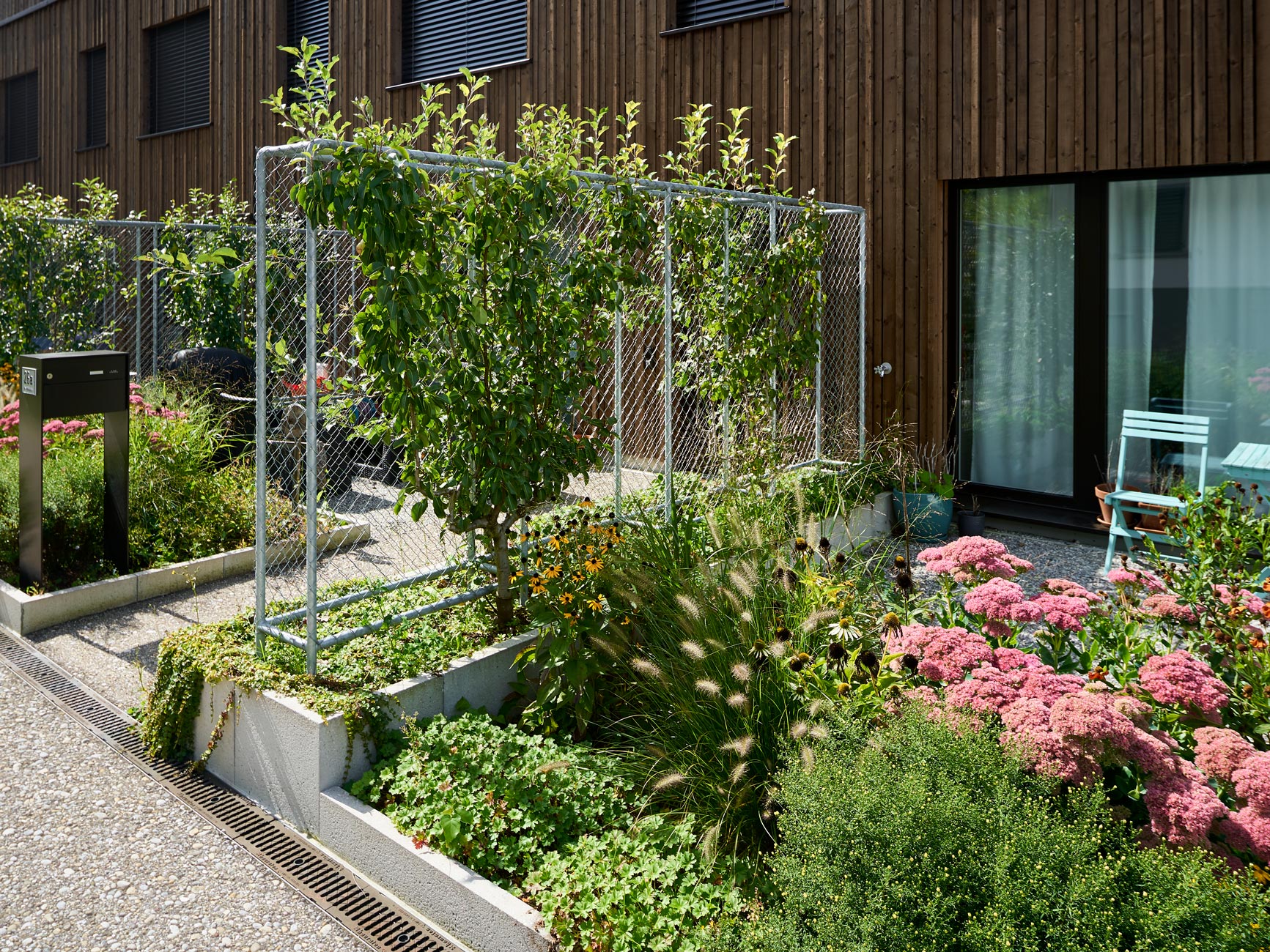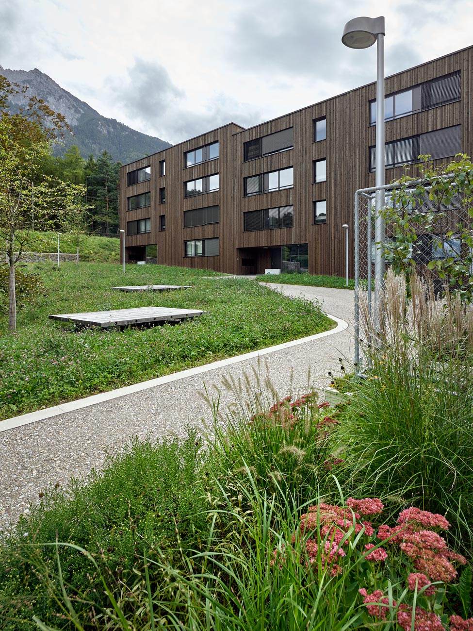 Die Umgebungsgestaltung zu den neuen, ein denkmalgeschütztes Wohnhaus ergänzenden Wohnbauten nimmt die vorhandenen Themen der fast idyllischen Situation vor Ort auf: Am hangseitigen Ortsrand mit dörflichen Strukturen gelegen entsteht ein ländlicher Hofraum mit einem fliessenden Wiesengrund, in den lediglich der Erschliessungsweg, der Topographie folgend, eingebettet ist. An die zeichnende, den Hof umlaufende Wegefigur schliesst am höchsten Punkt des Areals ein kleiner Spielbereich sowie ein von mächtigen alten Mauern gefasster, kanzelartiger Potager – ein Gemüsegärtlein für Bewohner mit grünem Daumen – an. Einzelne Solitärbäume setzen Akzente auf der Wiese und bieten zusammen mit Holzflössen beschattete Sitzbereiche im Sommer.