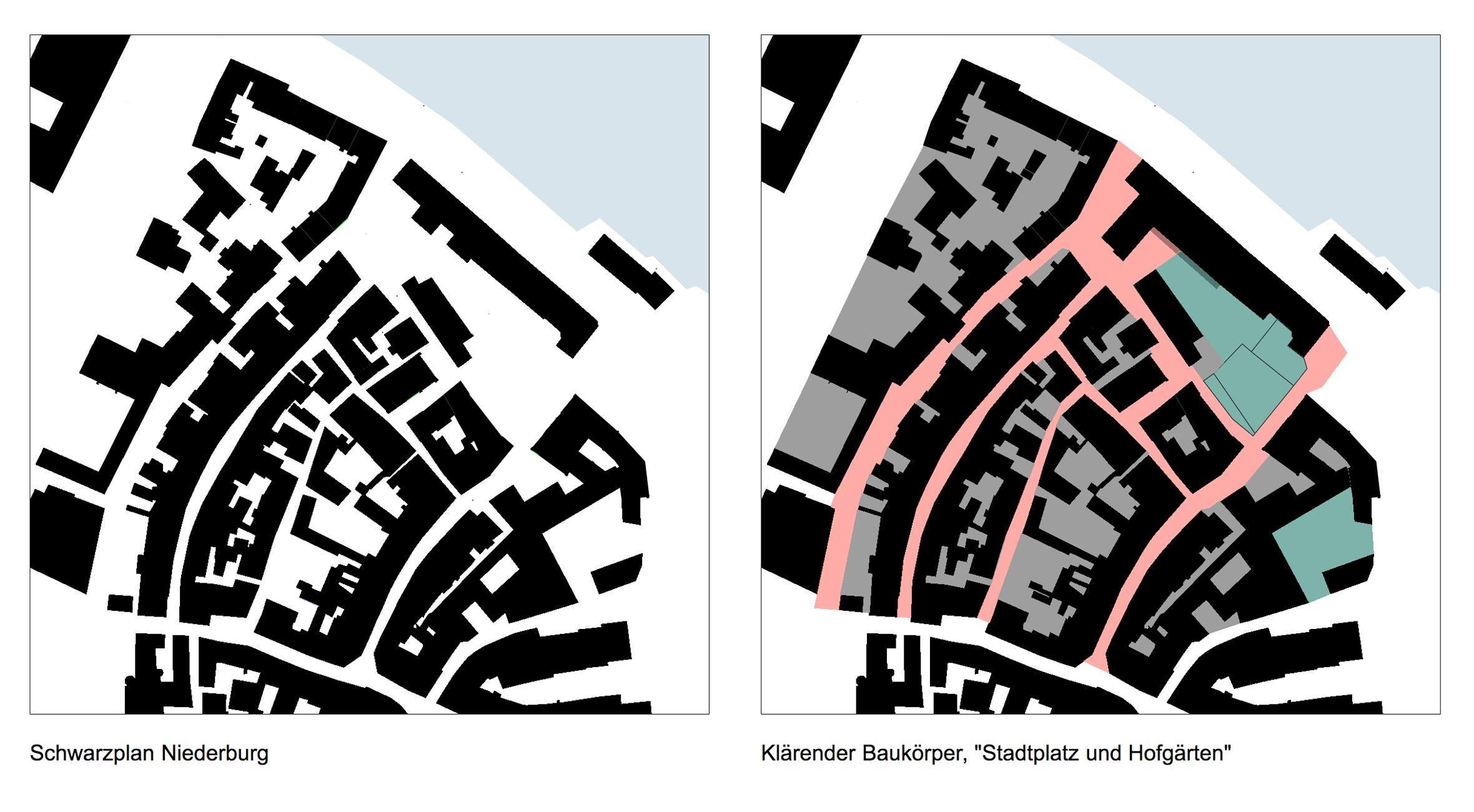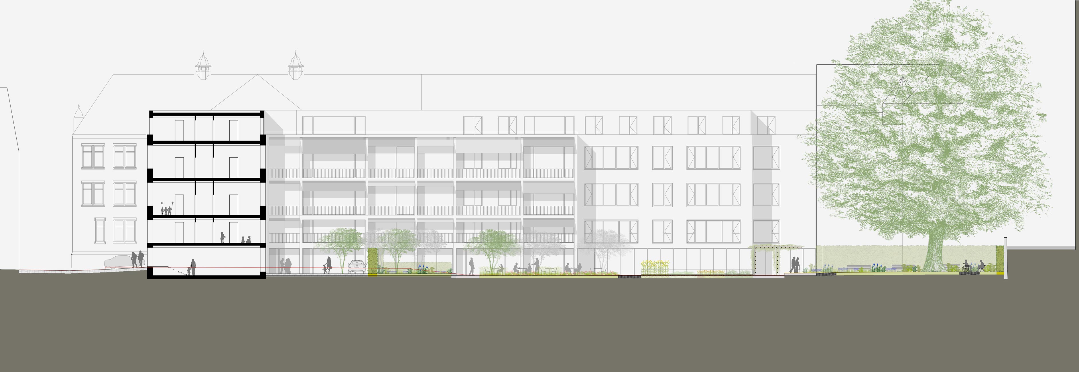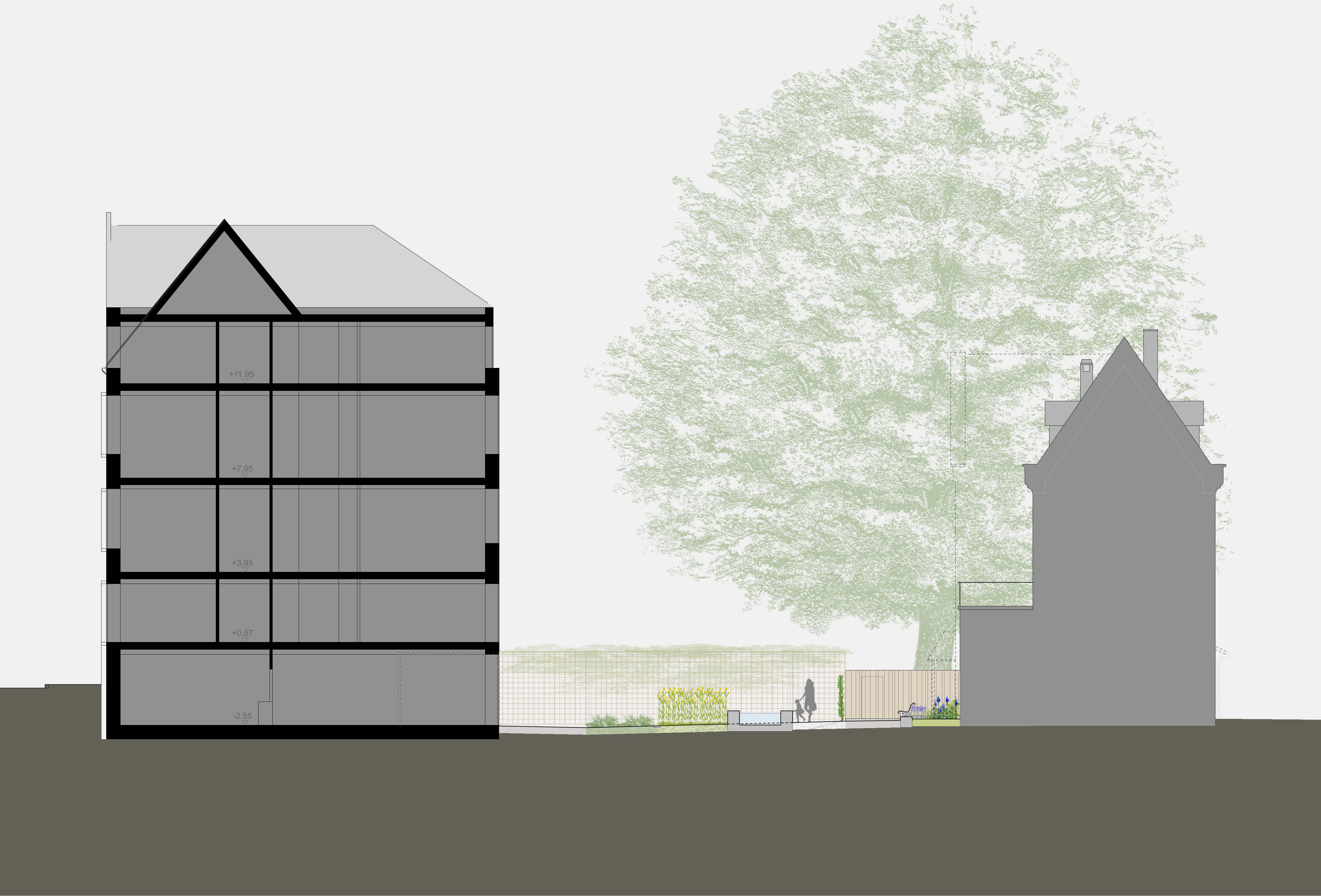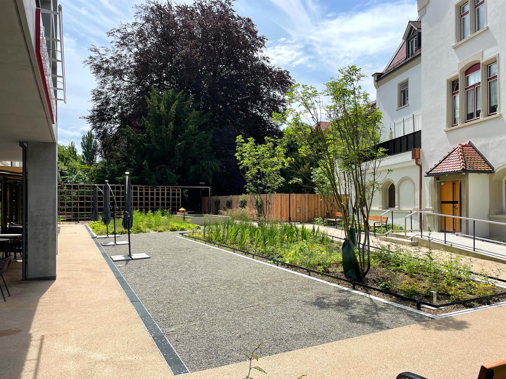Durch die Setzung des neuen Kopfgebäudes gelingt eine Klärung der Stadt- und Freiraumkonstellation: Es redimensioniert die Klostergasse und bildet im Vorbereich des Haupteingangs einen Entrée-Platz aus, der als Teil des öffentlichen Gassenraumes erlebt wird. An der Verengung zwischen Neubau und dem bestehenden Wohnhaus erfolgt der Übergang in den Hofraum, der sich zum bestehenden Garten mit der grossen, 150-jährigen Blutbuche öffnet und als Hofgarten zur Erweiterung desselben wird. Als gefasster, von Vegetation bestimmter Raum ist er Reminiszenz an den ehemaligen Klostergarten und steht damit in Abfolge zu den mauergefassten Gärten, die im Verlauf der Zeit die Parzelle bestimmten.