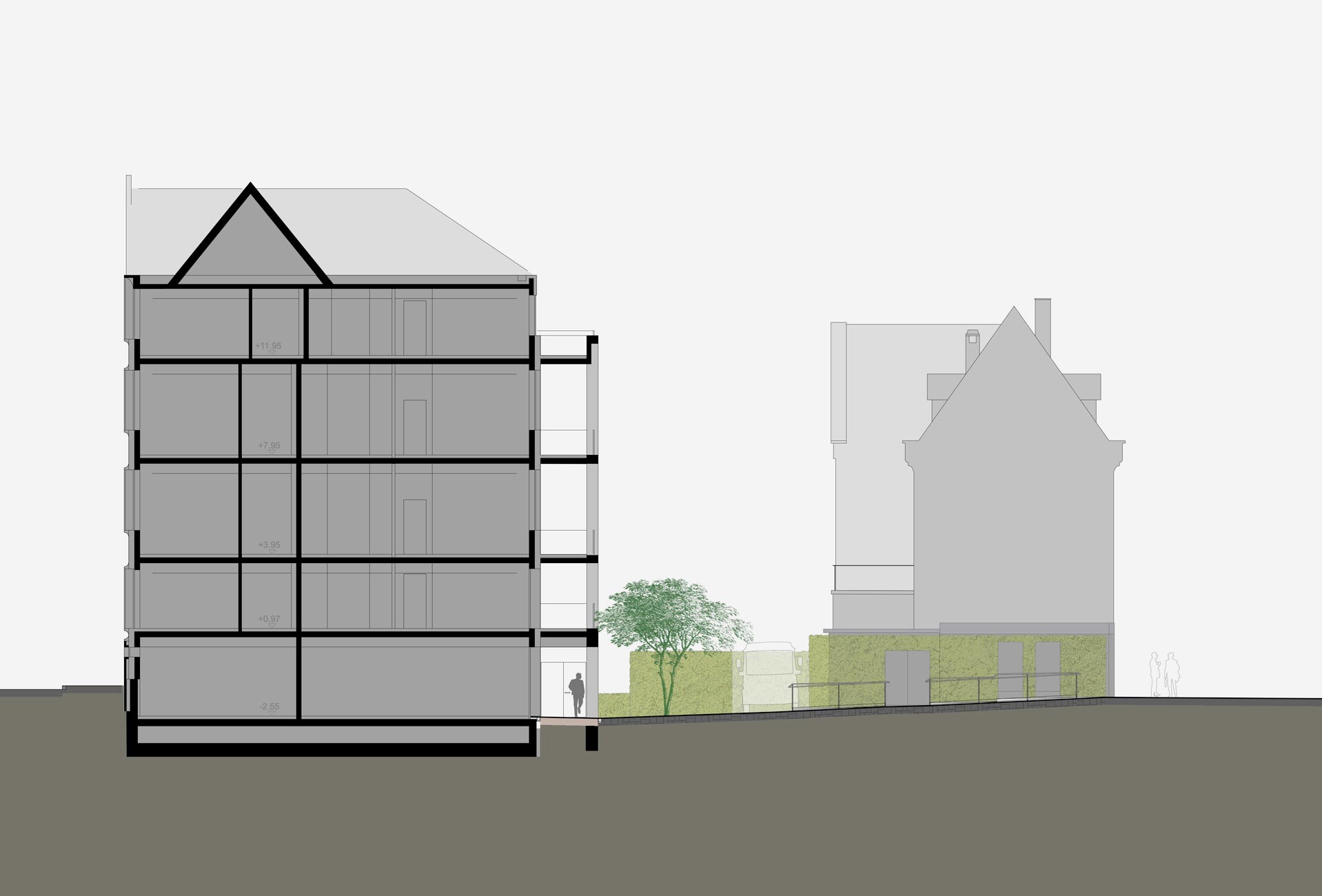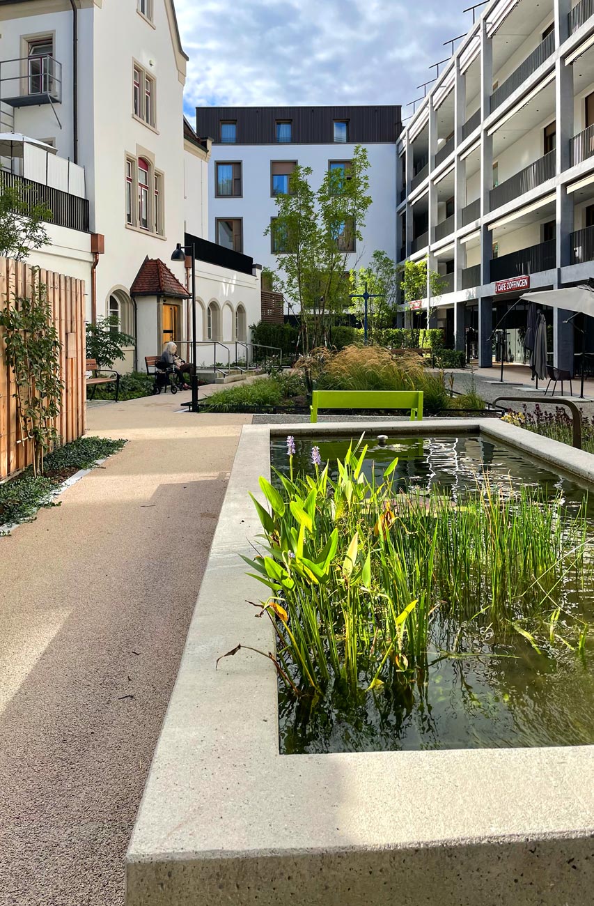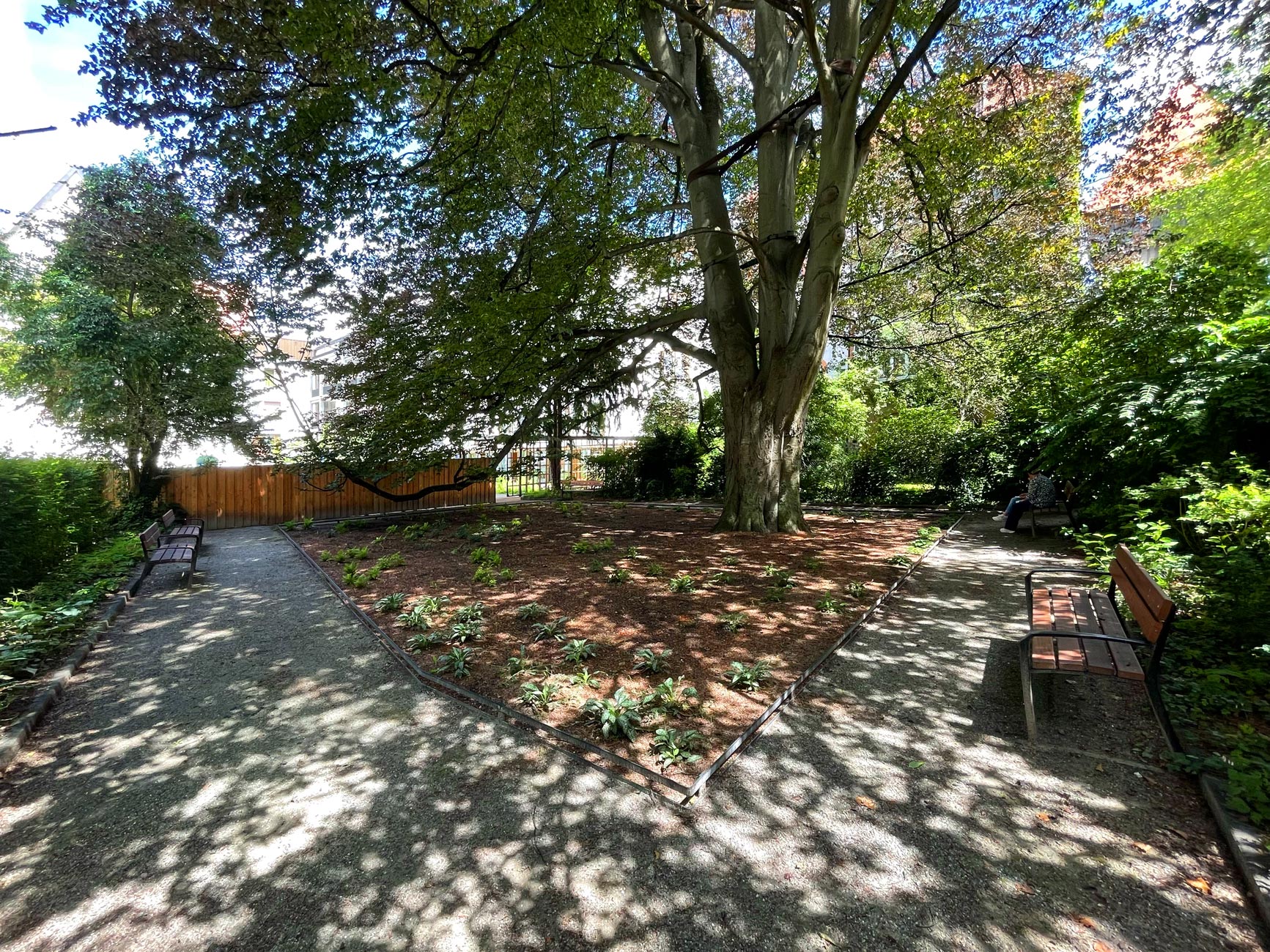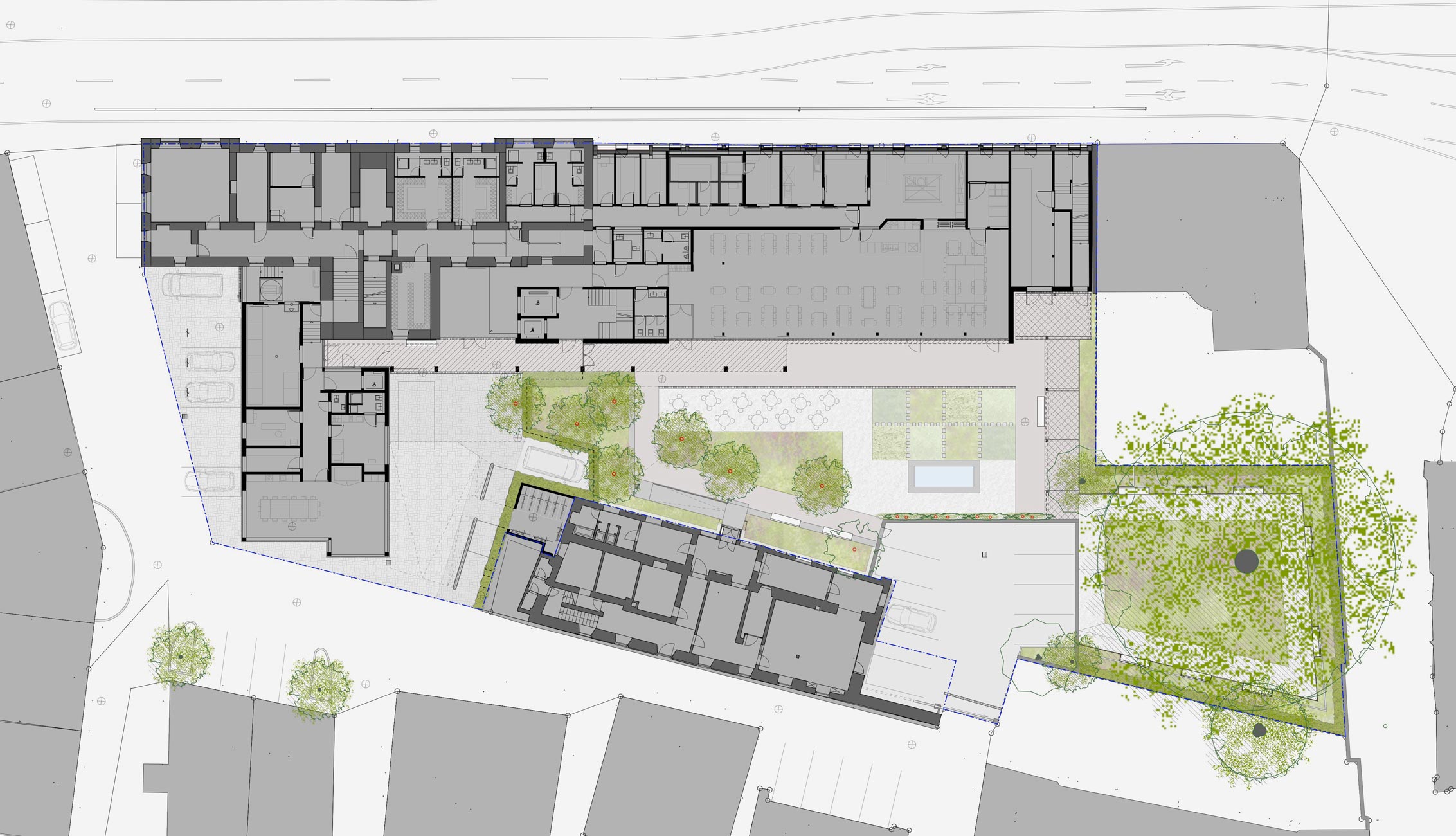 Durch die Setzung des neuen Kopfgebäudes gelingt eine Klärung der Stadt- und Freiraumkonstellation: Es redimensioniert die Klostergasse und bildet im Vorbereich des Haupteingangs einen Entrée-Platz aus, der als Teil des öffentlichen Gassenraumes erlebt wird. An der Verengung zwischen Neubau und dem bestehenden Wohnhaus erfolgt der Übergang in den Hofraum, der sich zum bestehenden Garten mit der grossen, 150-jährigen Blutbuche öffnet und als Hofgarten zur Erweiterung desselben wird. Als gefasster, von Vegetation bestimmter Raum ist er Reminiszenz an den ehemaligen Klostergarten und steht damit in Abfolge zu den mauergefassten Gärten, die im Verlauf der Zeit die Parzelle bestimmten.