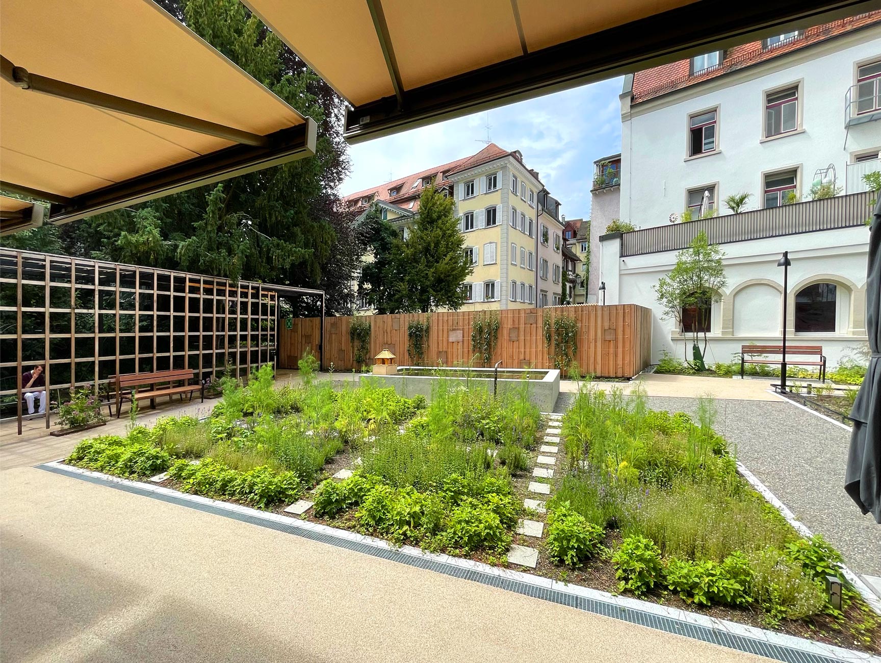 Die Hofgärten dienen als Aufenthaltsbereiche für die Bewohner. Der Cafeteria und der Kapelle vorgelagert, bietet der Hofgarten mit Kaffee-Terrasse, verschiedenen Gartenbereichen und Sitzplätzen den Bewohnern stimmungsvolle Aufenthaltsorte und Treffpunkte. Geometrisch angelegt, enthält er mit üppigen Staudenpflanzungen, Kräutergarten, Spalierobst und einem Goldfischbecken eine Vielfalt an gärtnerischen Eindrücken und kurzweiligen Beobachtungsmöglichkeiten. Mehrstämmige Blumeneschen bieten einen schattenspendenden Schleier ohne den Hofraum zu verstellen. Ein Treillagegerüst ist separierender und gleichzeitig verbindender Laubengang zwischen den beiden Gärtenbereichen. Sein beranktes Gitterwerk ist „blickfangender“ Filter, ohne hermetisch zu trennen. Der geschützte Garten unter der mächtigen Buchenkrone ist den Demenzkranken Bewohnern vorbehalten und wird zu den Nachbarparzellen mit einer hohen Heckenwand abgeschirmt. Das entstehende „Kabinett“ beinhaltet einen Rundweg mit Sitzbänken und von Schattenstauden geprägte Pflanzflächen.