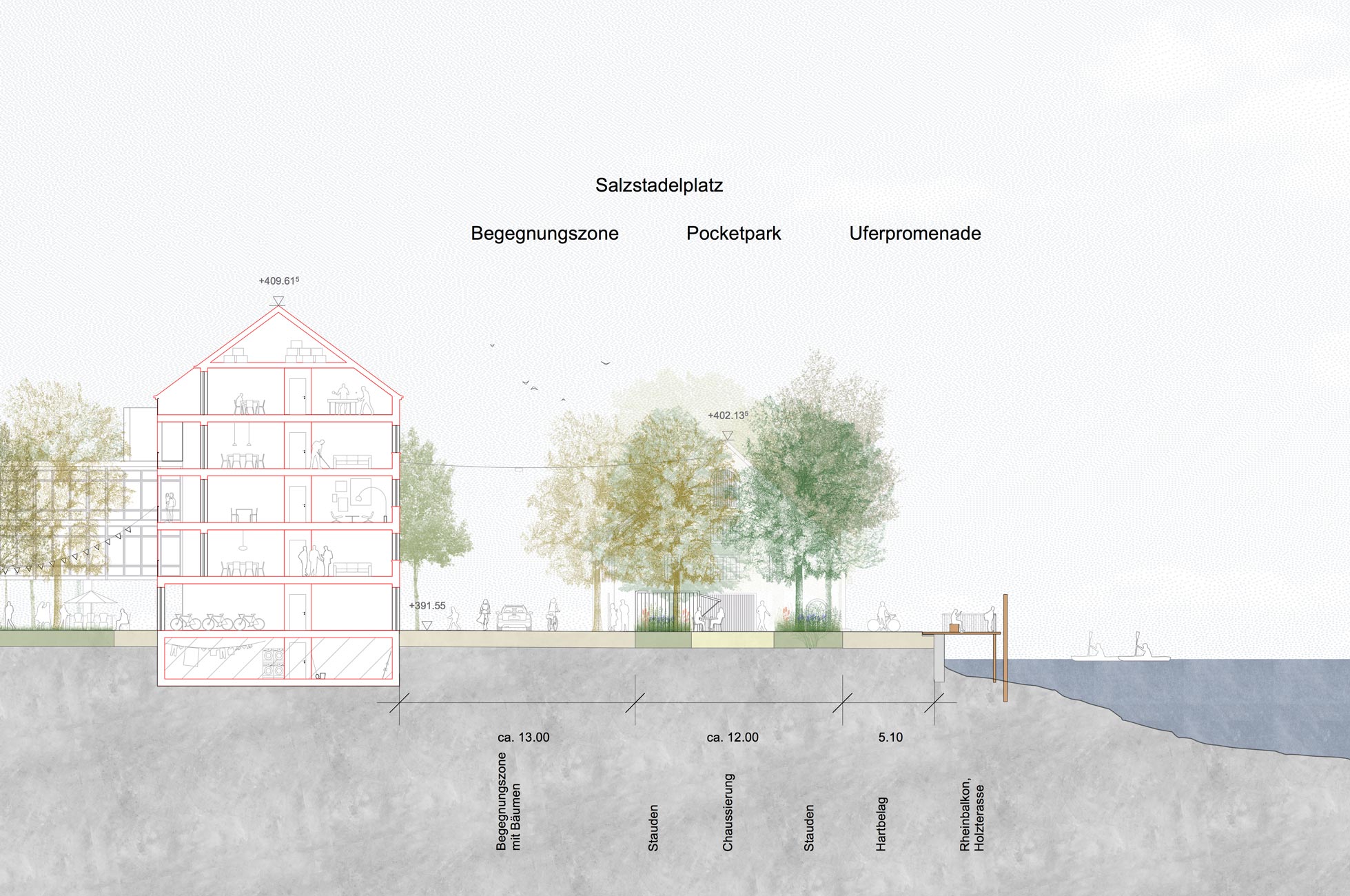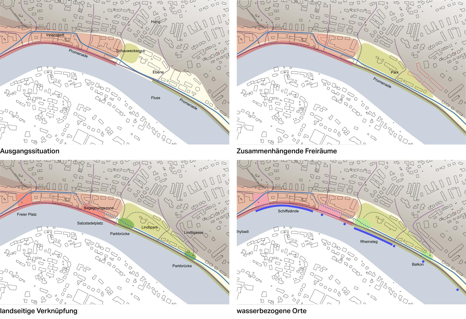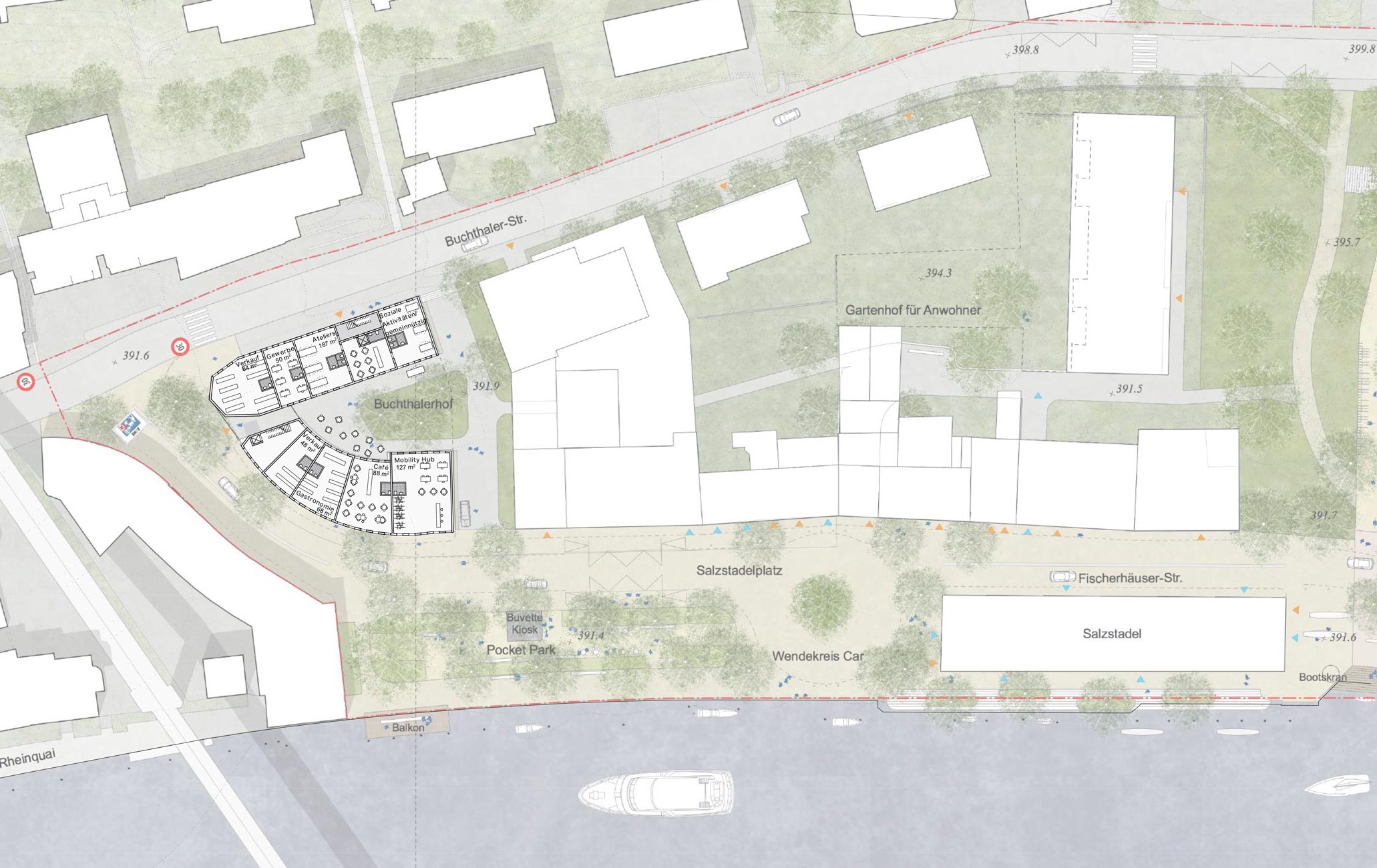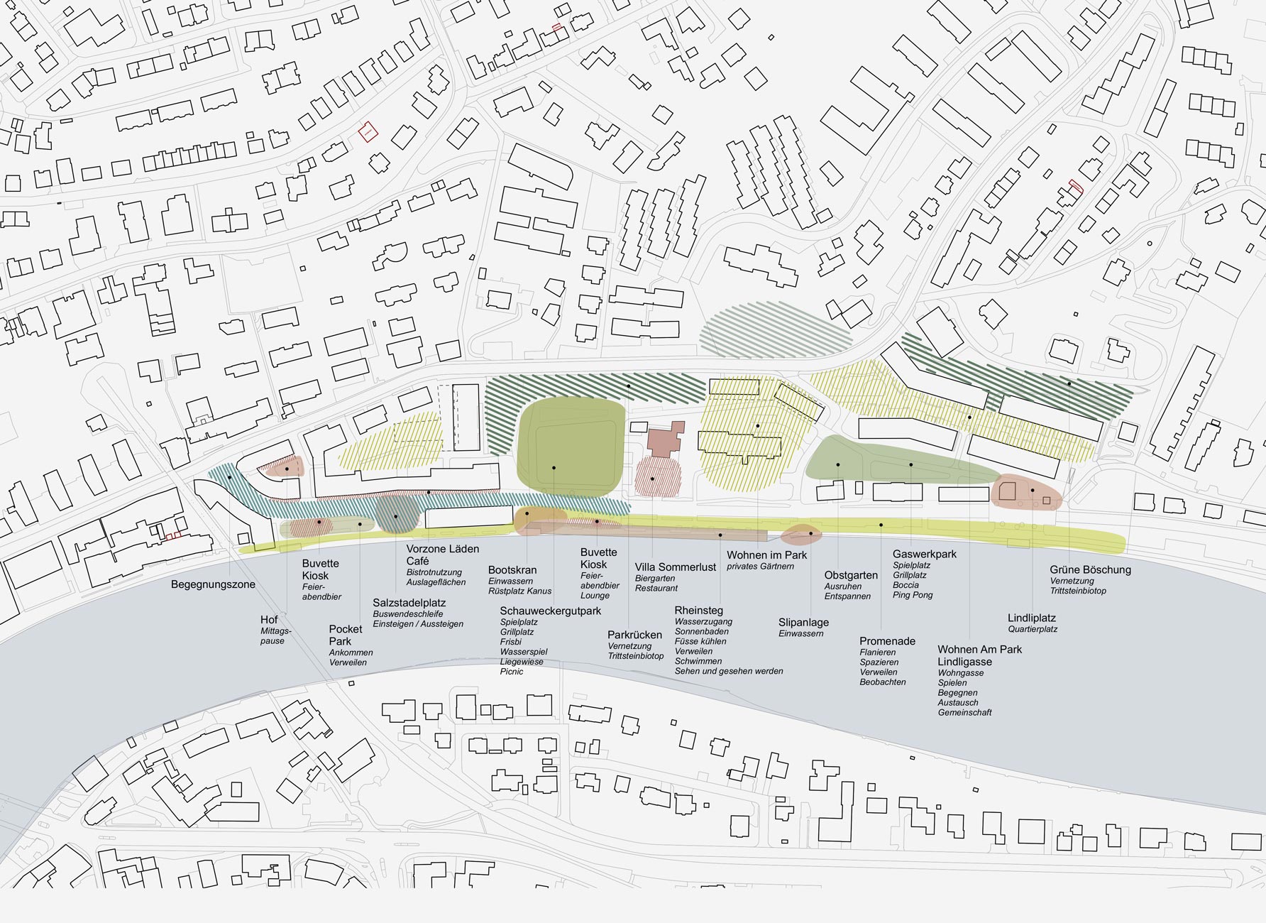 Der bestehende Uferweg erreicht von Osten kommend im Bereich des Salzstadels die dicht bebaute Stadtstruktur Schaffhausens. Mit dem Freie-Platz und dem neuen Salzstadelplatz öffnet sich die dichte Bebauung zum Rhein und bildet Ankunftsorte für Schaffhauser und externe Besucher. Das Prinzip der uferwegbegleitenden Plätze wird für die flussaufwärts anschliessende Rheinufergestaltung aufgegriffen und zum Bestandteil eines neuen Rheinuferparks, der Schauweckergut und Gaswerkareal miteinander verbindet. Die unmittelbar am Ufer verlaufende Promenade ist dabei übergeordnetes Freiraumelement, an dem sich die unterschiedlichen Situationen und Orte landbezogen oder wasserbezogen aneinanderreihen.