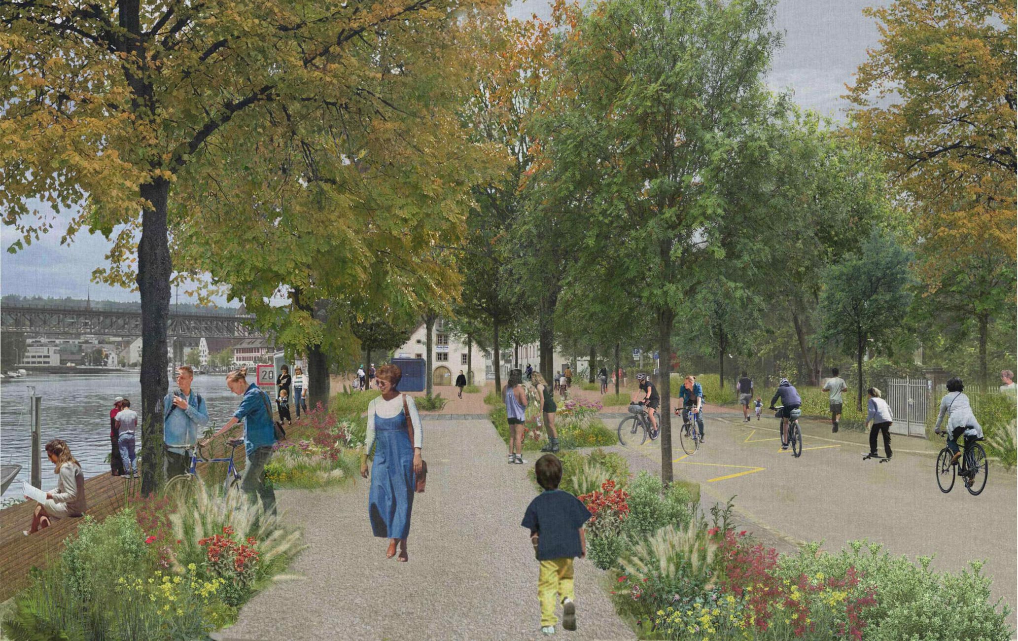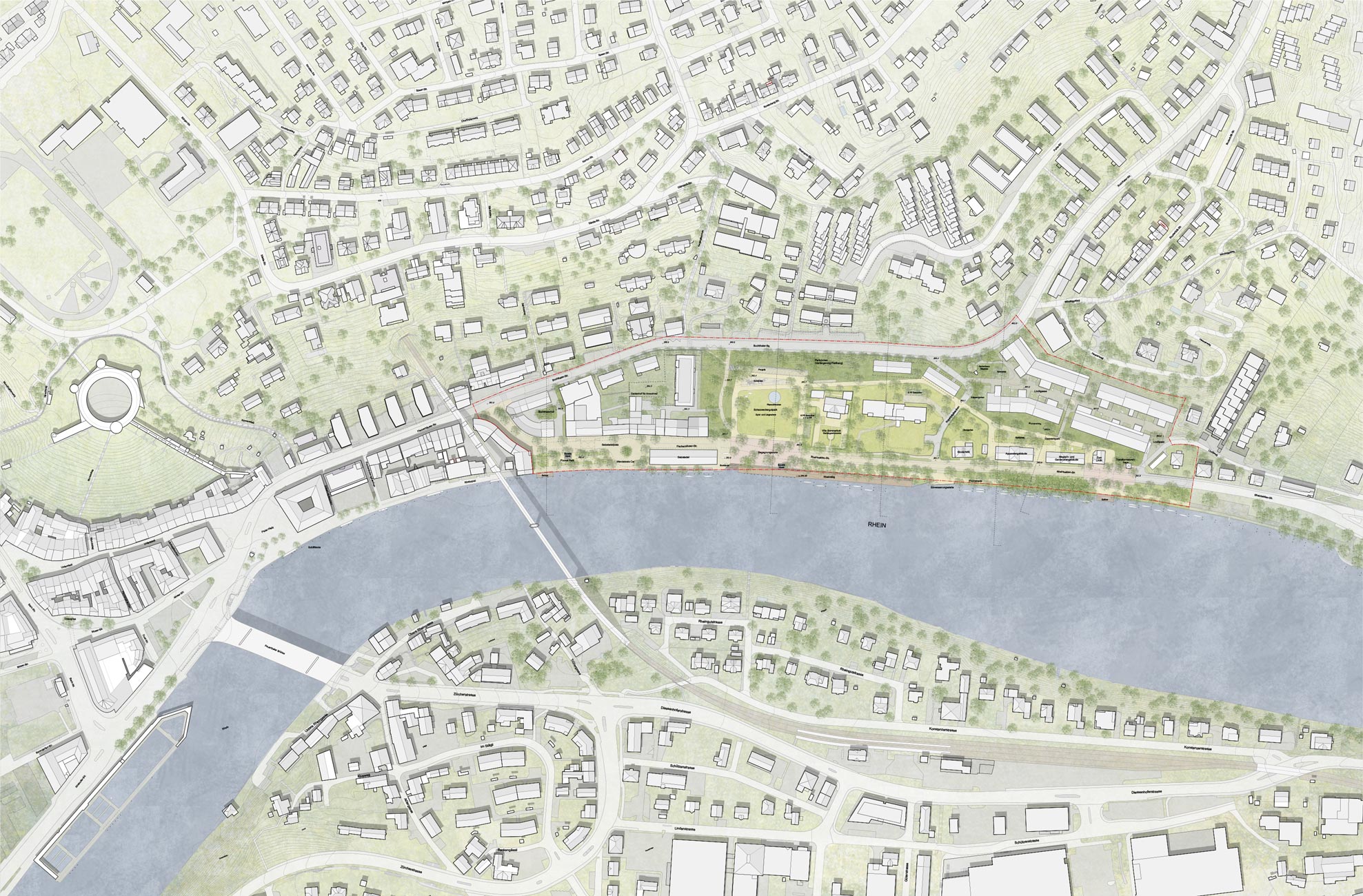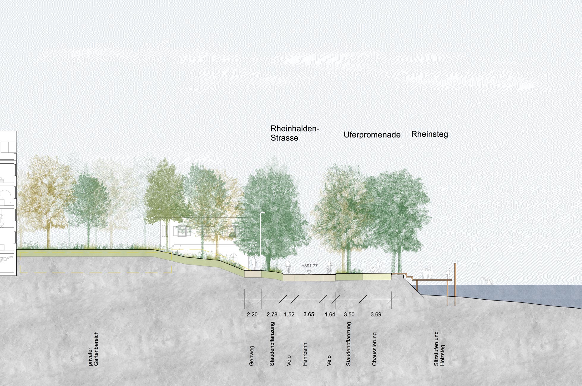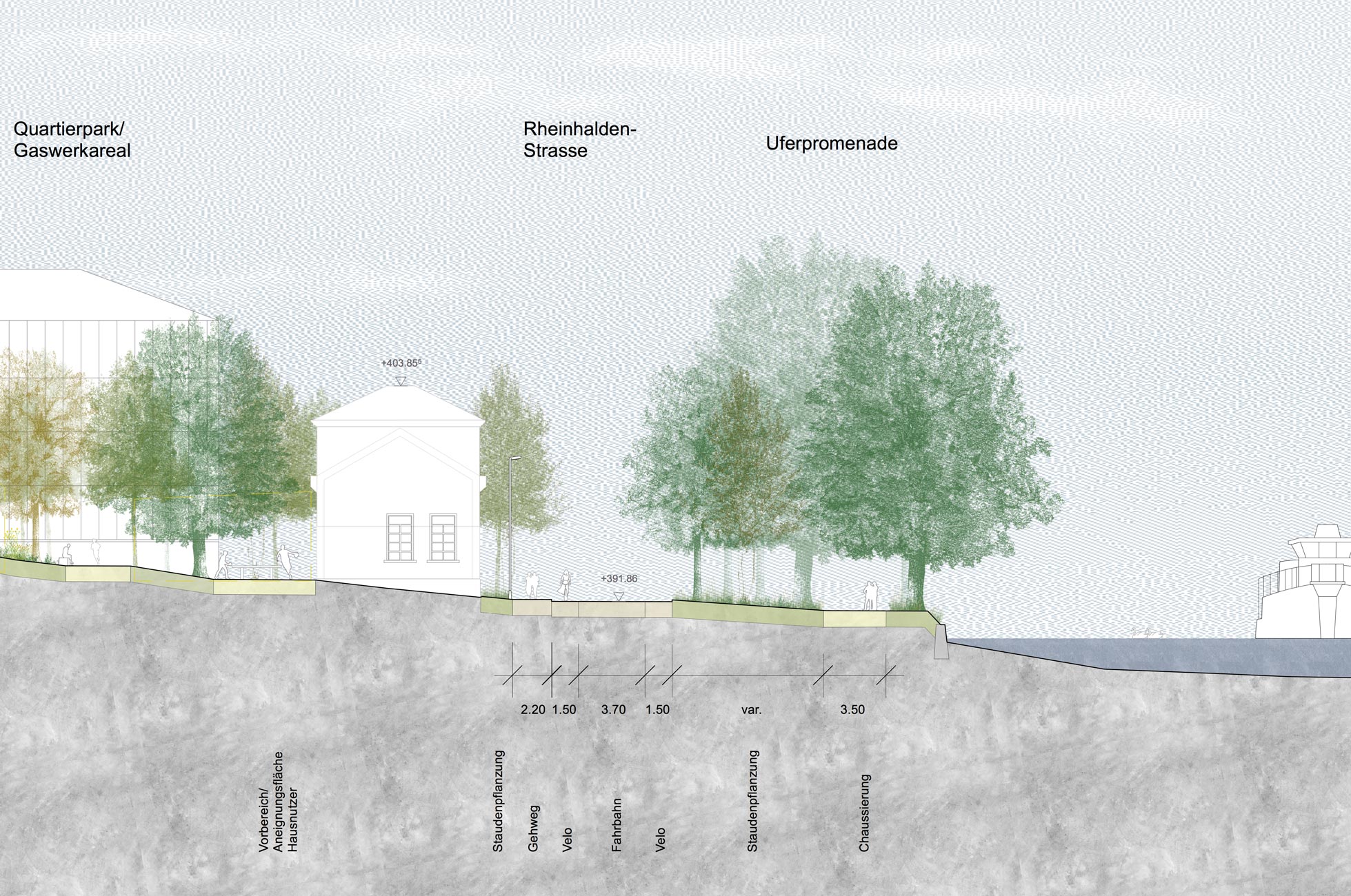 Die bestehende Uferpromenade mit dem prächtigen alten Platanenbestand auf der Höhe des Gaswerks wird in gleicher Art oberhalb des Rheinstegs weitergeführt. Neue Baumpflanzungen erweitern die Promenadenallee und durch die landeinwärtige Verschiebung der Rheinhaldenstrasse kann der Promenade das nötige fortgeführte Vegetationsband beiseitegestellt werden. Die «grüne» Promenade erhält so Kontinuität bis zum Schauweckergut.