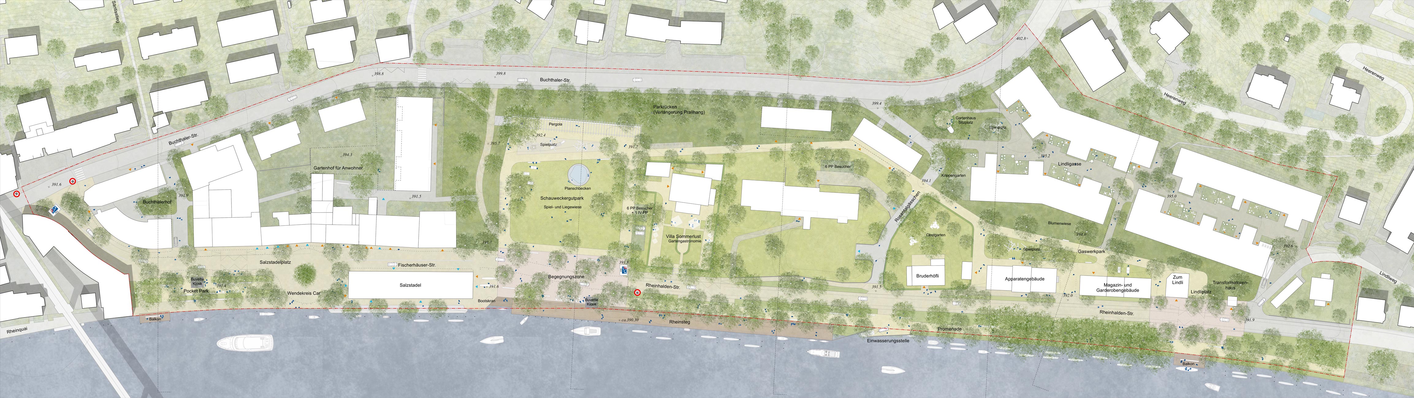 Im Zusammenspiel mit der Entwicklung des Gaswerkareals, der Neuorganisation des Carplatzes bei den Fischerhüsere sowie der Aufwertung des Schauweckergutparks ergibt sich für Schaffhausen die Chance, das Rheinufer als zusammenhängenden Freiraum aufzuwerten. Der heutige Uferabschnitt zwischen Salzstadel und Gaswerkareal ist stark von der Kantonsstrasse bestimmt, so dass das Ufer zum strassenbegleitenden Gehweg degradiert ist und seiner Promenadenfunktion nicht gerecht werden kann. Im Rahmen der Testplanung wurde ein Vorschlag für die Entwicklung eines Rheinuferparks unter Beibehaltung der Kantonsstrassenfunktion zu entwickeln.