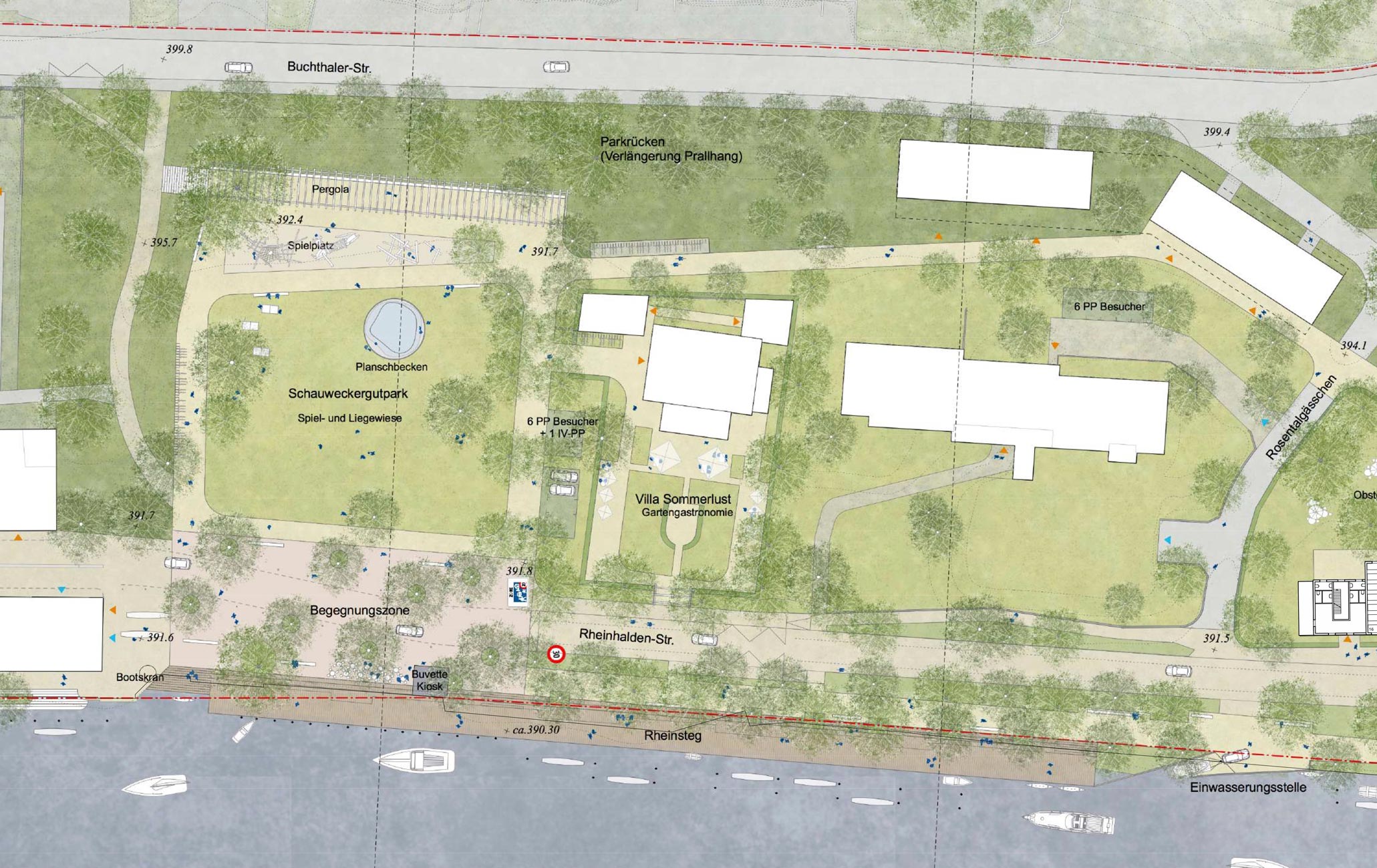Im Bereich des Schauweckerguts wird der Park mit einem gleichartigen Belagswechsel auf ganzer Breite über die Fahrbahn bis an die Uferkante verlängert. Die Rheinhaldenstrasse wechselt hier zur Begegnungszone und ermöglicht die Aufhebung des Strassenprofils. Der baumbestandene Platz wird atmosphärischer Bewegungsraum, der auch die Ein- und Ausbootungen der Kajaksportler aus dem Salzstadel oder die Nutzung des Bootskrans als Teil des Platzgeschehens aufnehmen kann. Entlang der Uferkante kann eine saisonale Buvette/ein Kiosk den Platz für Ufergastronomie nutzen.