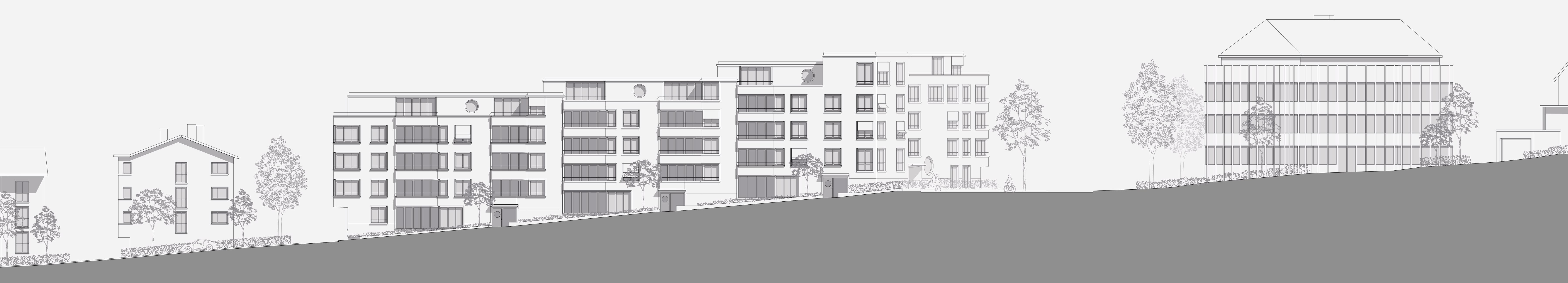 Durch die Hangneigung sind die gekiesten Sitzplätze in der Vorgartenzone über Treppen von den Loggias aus erreichbar. Eine durchgehende Hecke sowie eine einfassende Sockelmauer separieren die Vorgärten vom Gehweg der Strassen, Pflanzpflächen und kleinkronige Bäume sind eingefügt und lassen einen entspannten, städtischen Gartencharakter entstehen. Zudem wäre – auf städtischem Strassenland – bei einer Reduzierung der Parkplätze allenfalls die Pflanzung von grossen Strassenbäumen möglich.