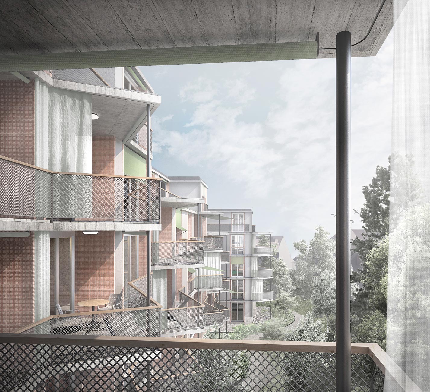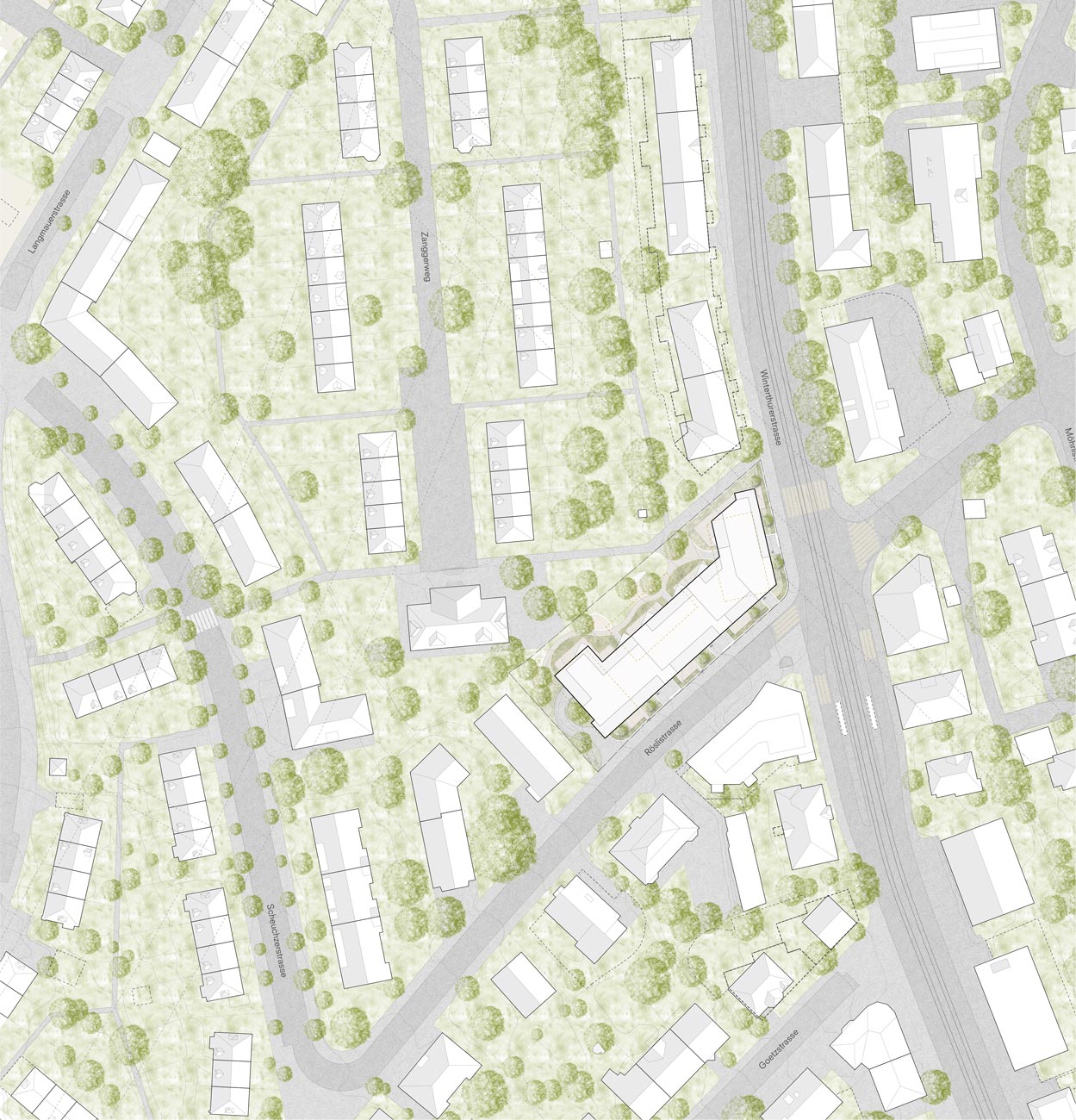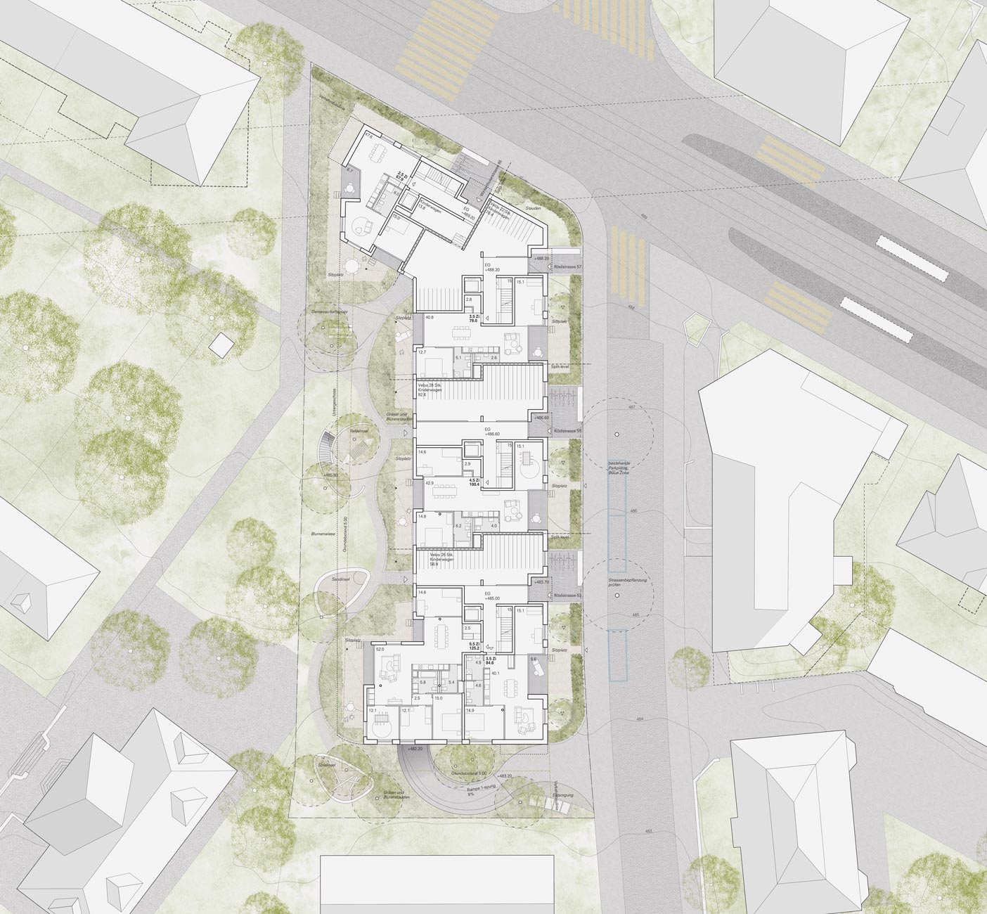 Durch die städtebauliche Ausrichtung des Bauvolumens entlang der flankierenden Strassenräume entsteht eine klare Unterscheidung des Freiraums in ein strassenseitiges Aussen und ein hofseitiges Innen. Das bestehende Ensemble des umfassten Stadtstücks mit dem – zum zentralen Zanggerweg ausgerichteten - «Inneren Gartenraum» wird dadurch logisch komplettiert und typologisch «geschlossen». Entsprechend finden sich entlang der strassenseitigen Fassaden Vorgartenzonen, die sich an den angrenzenden Strassenräumen orientieren und einem tradierten, unaufgeregten Strassenbild verpflichtet sind. Für die EG-Wohnungen beinhalten die Vorgartenzonen Aussensitzplätze als Erweiterungen der Loggias. Zum Hof hin öffnet sich der Freiraum zur dichtgrünen Gartenwelt, die eine «weite» Aussicht bietet und die trotz der nur schmalen Parzelle ein grosszügiges Aussenraumgefühl entstehen lässt.