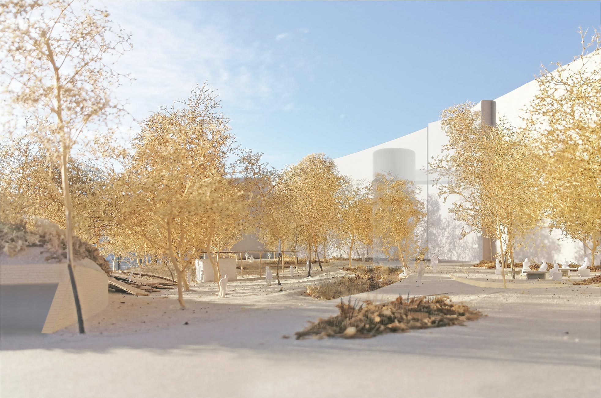 Wenige gross- und viele mittel- und kleinkronige Bäume erzielen die gewünschte dichte Parkatmosphäre, die das Zusammenspiel von Grossarchitektur mit lauschiger Parknutzung erst ermöglicht. Die Baumkronen schützen die Parknutzer vor den «tausend Augen» der Glasfassade und vor deren Spiegelung und Rückstrahlung der Nachmittagssonne. Die Spiegelung und Vervielfachung der Parkbäume in der Fassade ist dabei kalkulierter Effekt.
