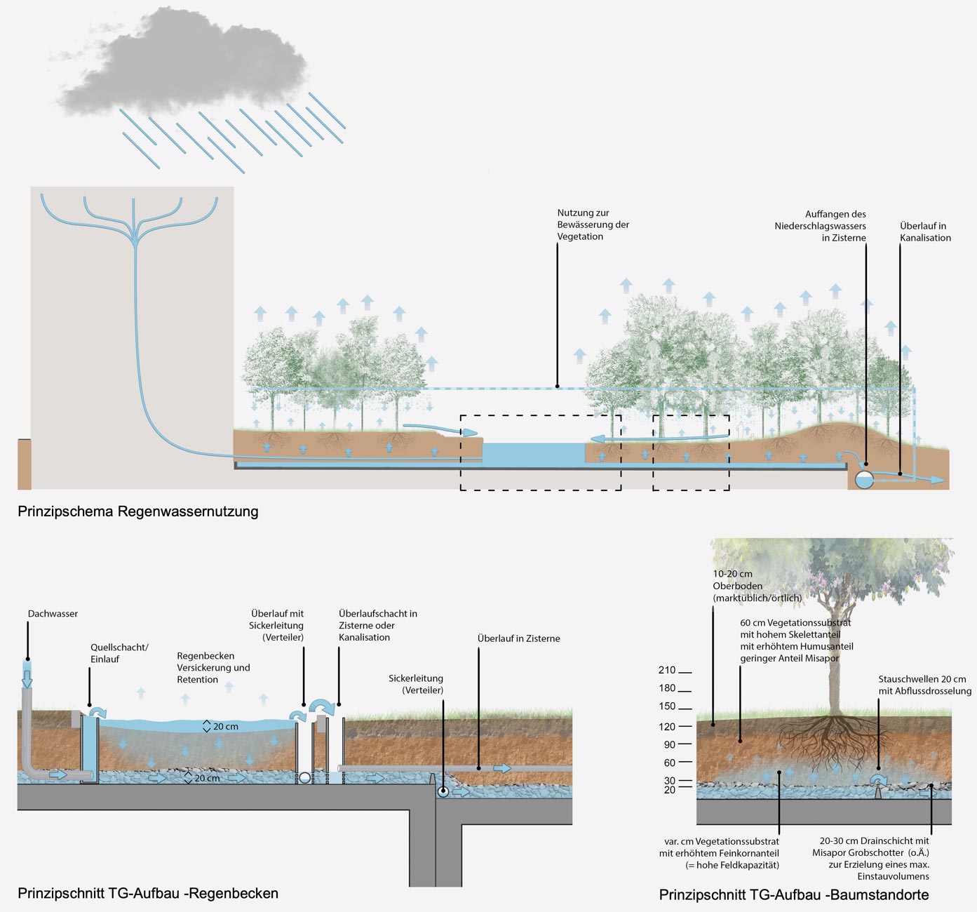 Neben einem hohen Baumkronenanteil zur Beschattung des Parks tragen die Bäume insbesondere durch ihre Verdunstung zur Kühlung des Parks bei. Zudem erhält der Park mit dem Regenwasserbecken ein grosses Verdunstungselement, welches das Dachwasser und Oberflächenwasser sammelt und aufstaut. Durch Versickerung gibt es gedrosselt Wasser in Sickerrohre auf der TG-Decke ab. Diese verteilen das Sickerwasser über die gesamte TG-Decke und geben es an eine Drain- und Speicherschicht ab.