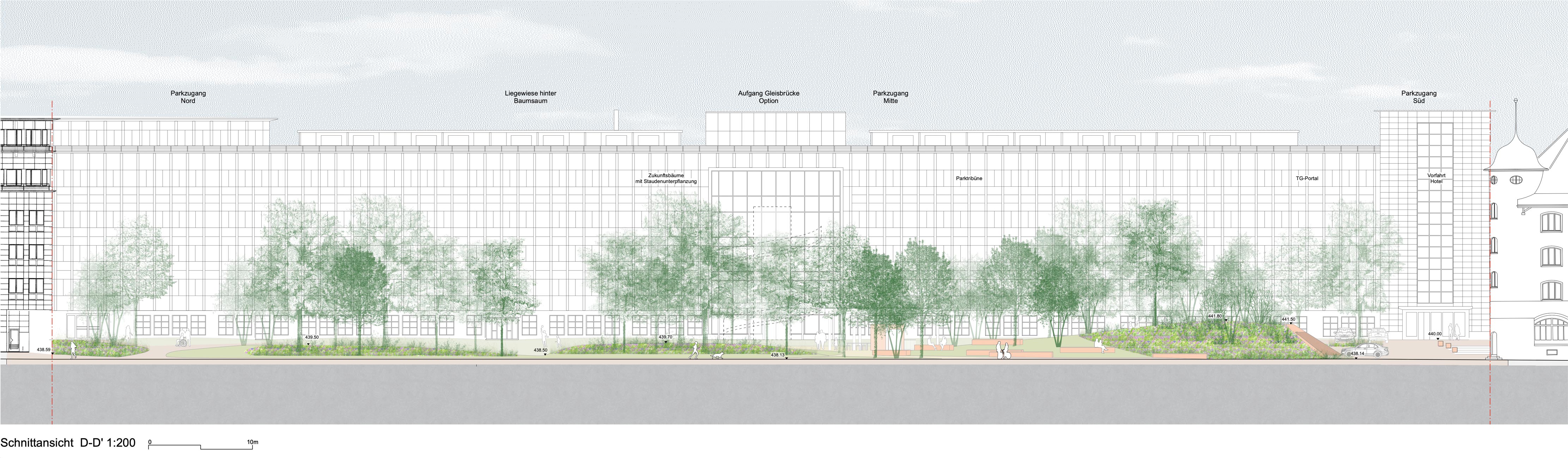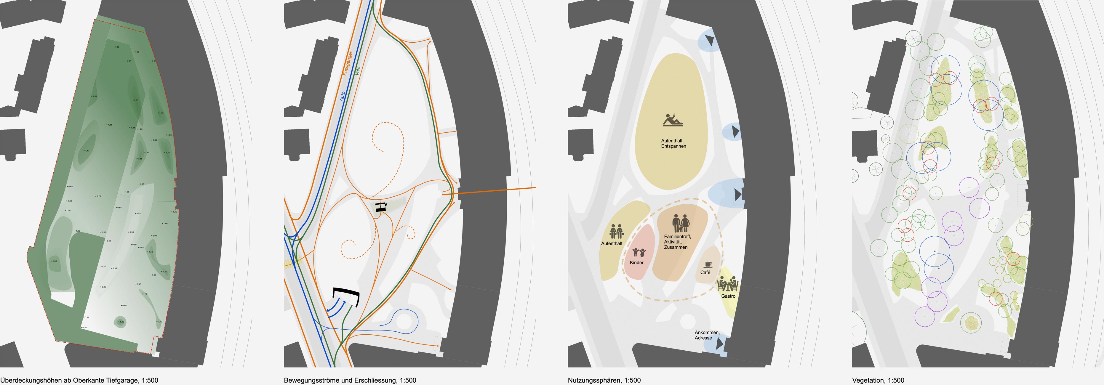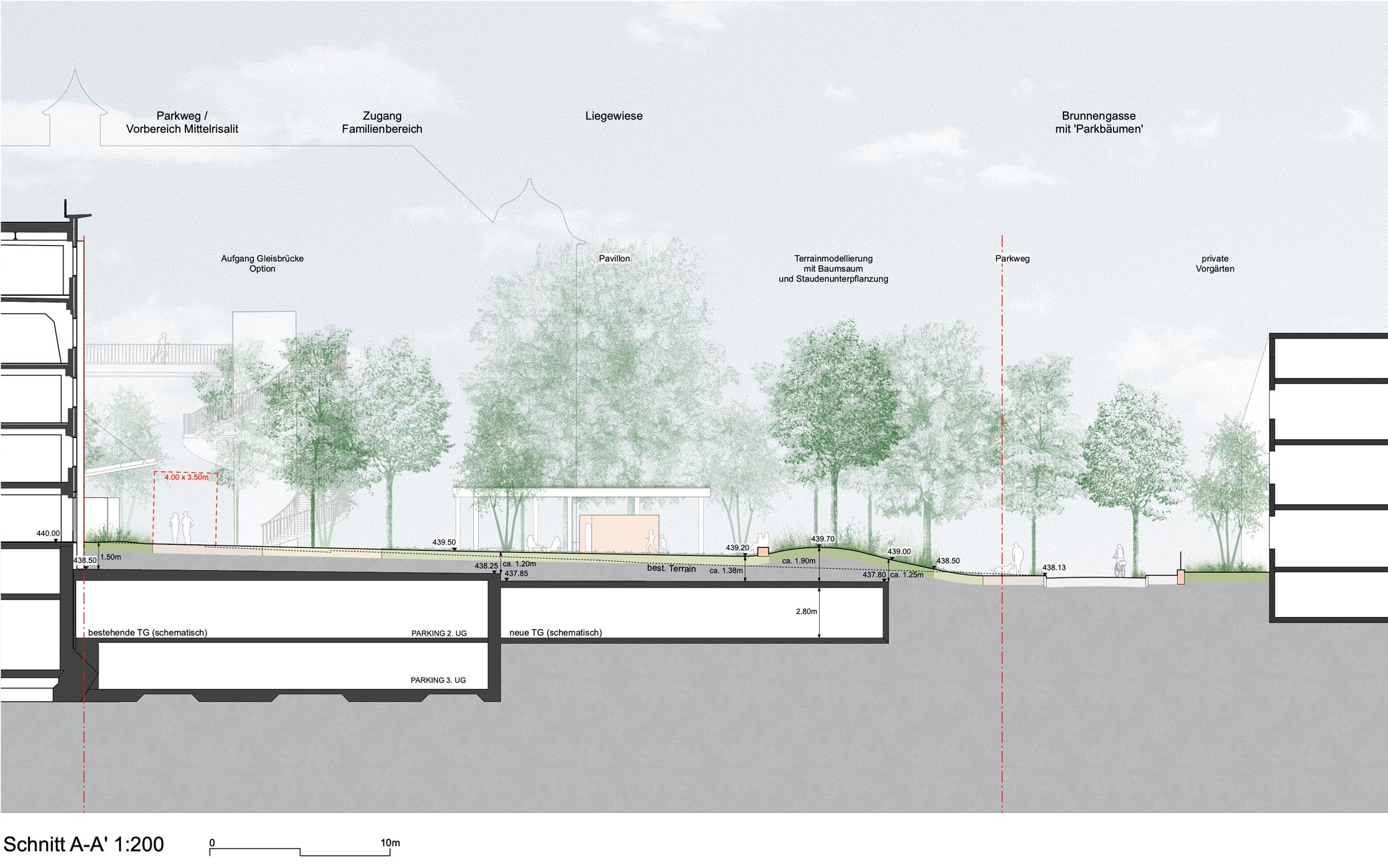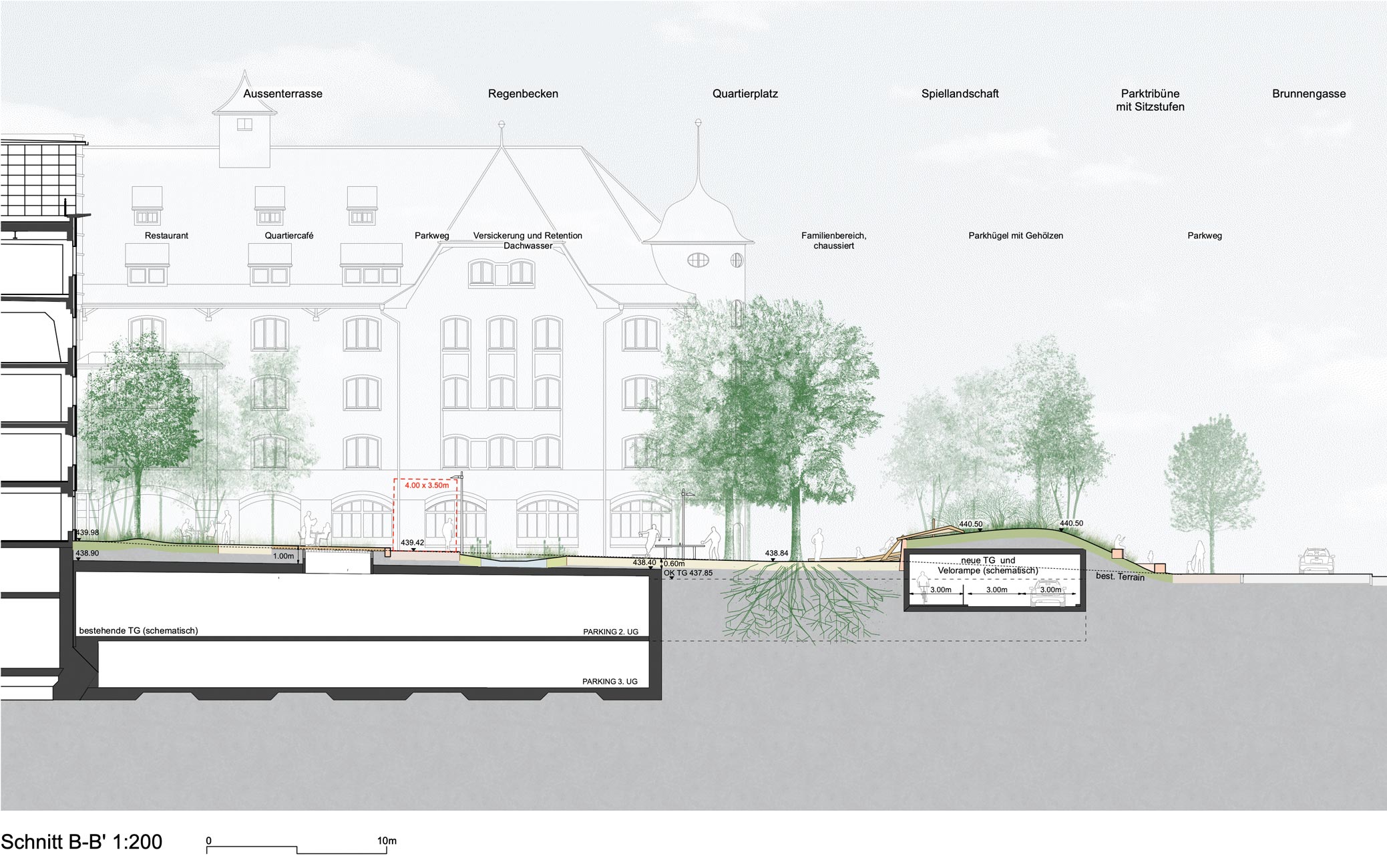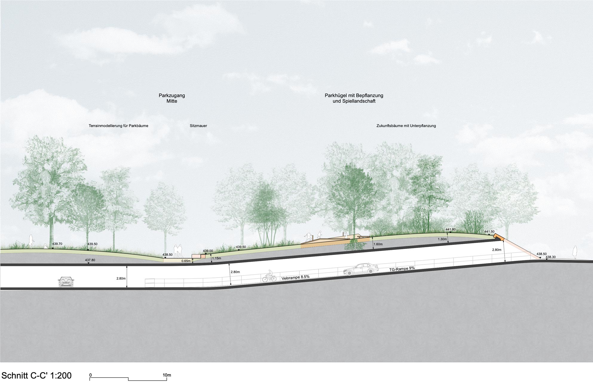 Über die Zugangssituation an der Schaffhauserstrasse erfolgt auf kürzestem Weg die Zufahrt in die Tiefgarage. Diese wird, in Kombination mit der Velozufahrt, topographisch in die Terraingestaltung des Parks eingebunden. Entlang der Parkaussenseite ist die Tiefgaragenrampe als zunehmend flacher werdender vegetationsbedeckter Hügel erlebbar, der in einen mit Sitzstufen bestückten Rasenhang übergeht und zur strassenseitigen Parktribüne wird.