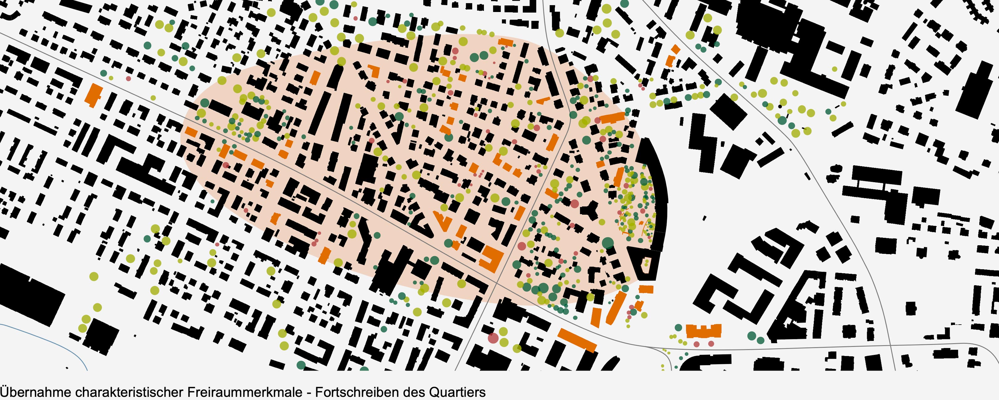Der Freiraum vor dem markanten Banane-Gebäude erfährt eine Umwidmung in einen öffentlichen Raum. Es entsteht ein kleiner Park für die Bewohnerschaft des angrenzenden Quartiers.