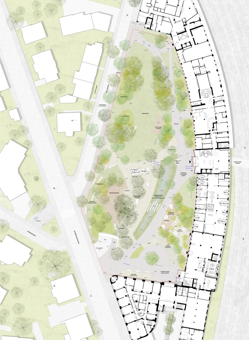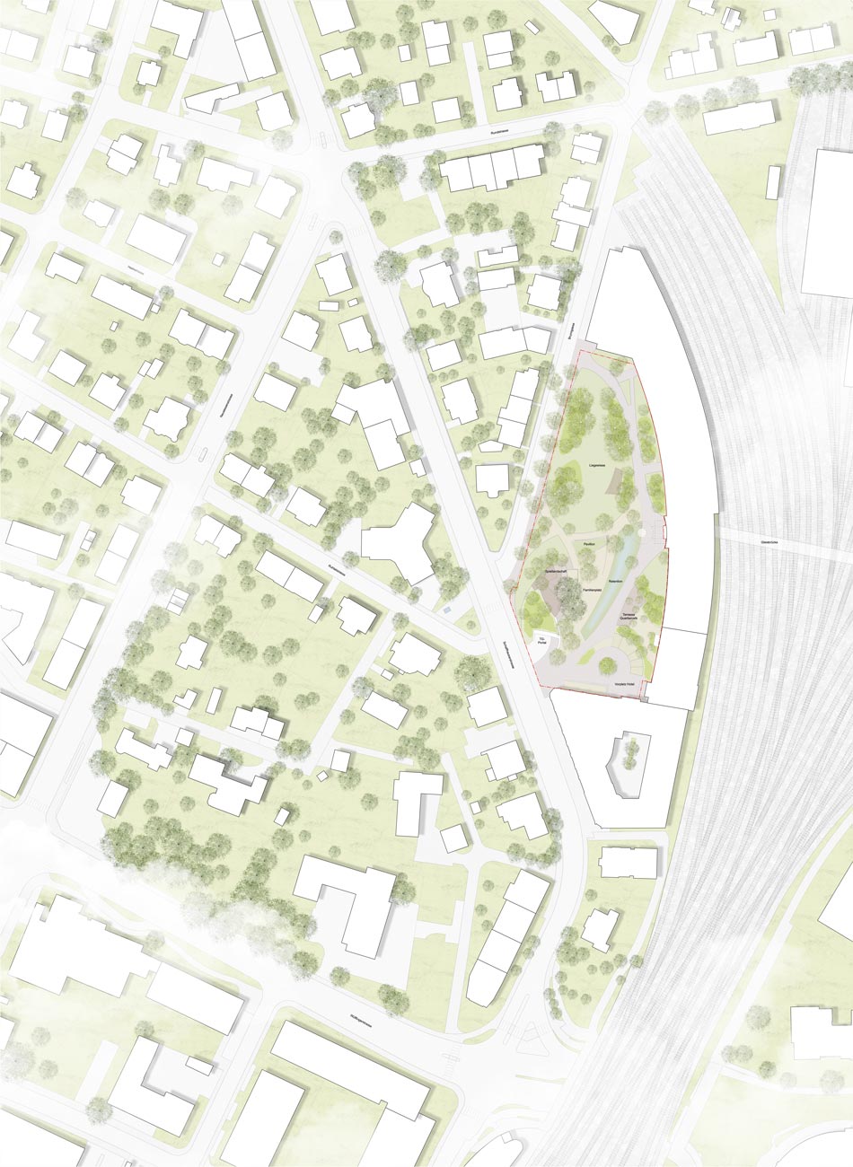 Ein fassender Parkweg verbindet alle Teilbereiche, erschliesst die Gebäudezugänge der Banane und bindet den Gehweg der Brunngasse als Teil des Parks mit ein. Der Parkweg folgt einer raumgreifenden, sich aber von der Fassade der Banane lösenden Bewegung, die am Mittelrisalit der Banane eine Aufweitung erfährt und so der architektonischen Bedeutung Rechnung trägt. Die Einfügung eines künftigen Gleisbrückenaufgangs wäre hier eine unprätentiöse Ergänzung des Parks.