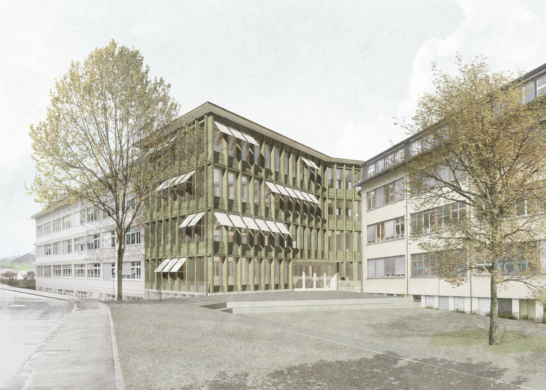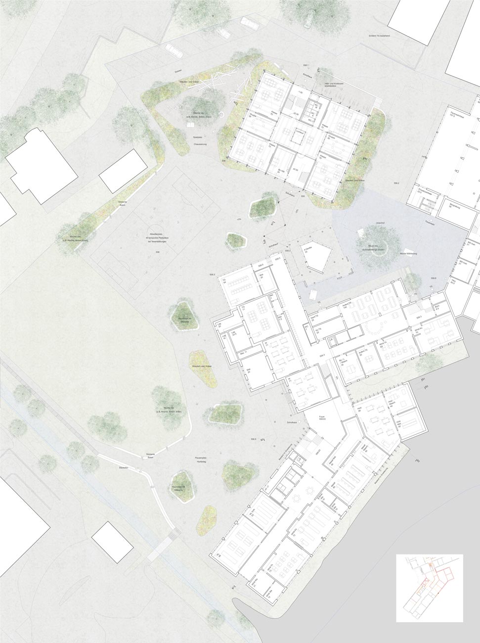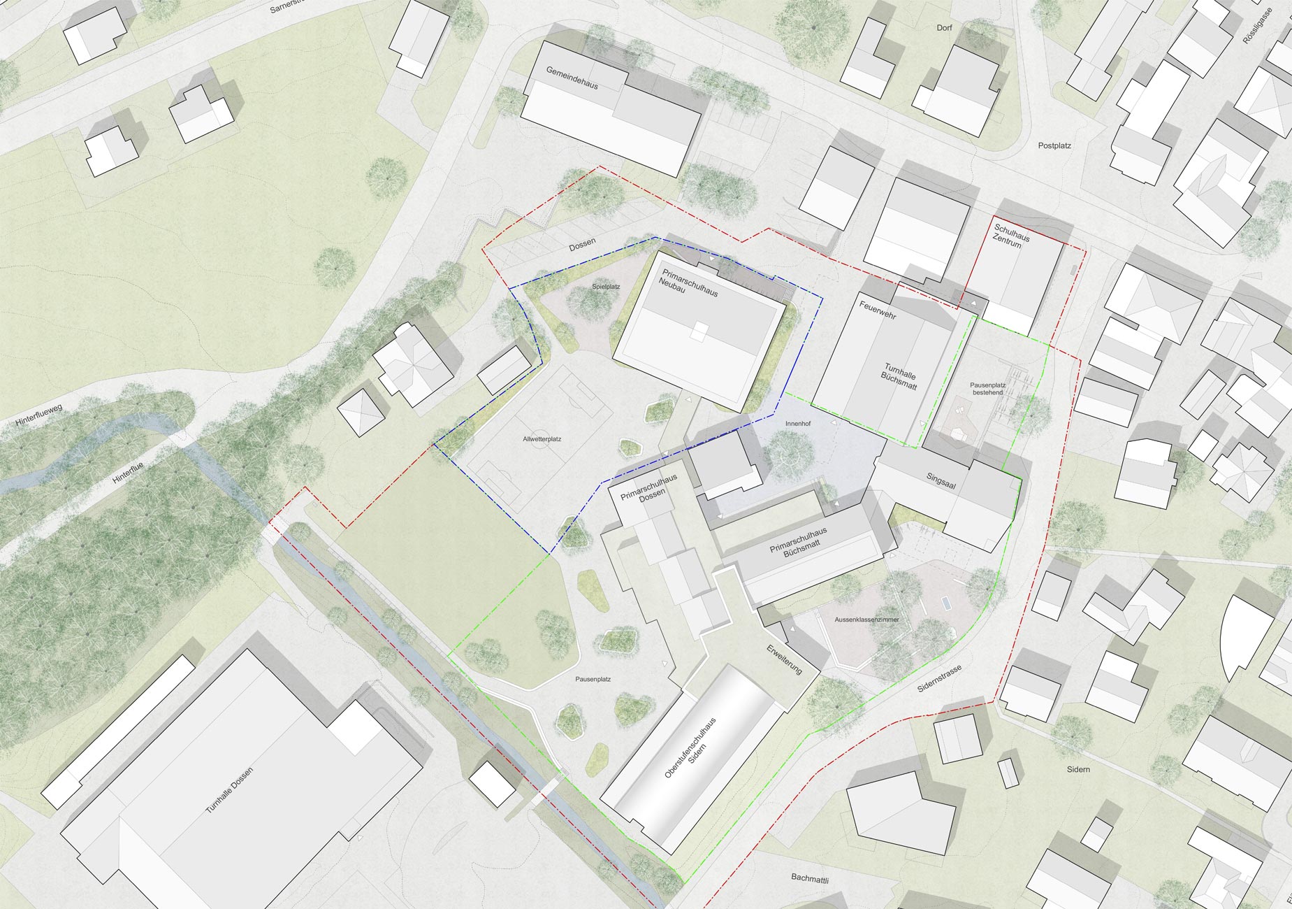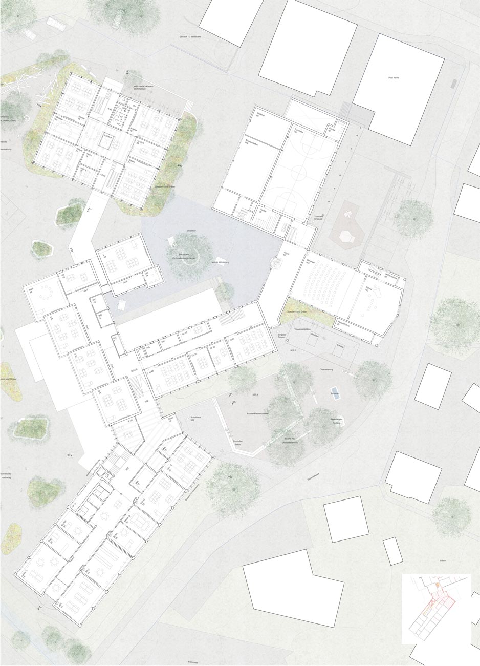 Mit der Erweiterung des Oberstufenschulhauses sowie dem Ergänzungsneubau für die Primarschule erfahren die Zugangssituationen des Schulkomplexes eine selbstverständliche Klärung. Die Pausenflächen werden an die erhöhten Schülerzahlen angepasst und wo nötig überformt, so dass auch künftig jeder Schultyp ihm zugeordnete Freiflächen erhält, die sich aber im Sinne von Synergien im Bereich der Spielwiese und dem Allwettersportfeld überlagern.