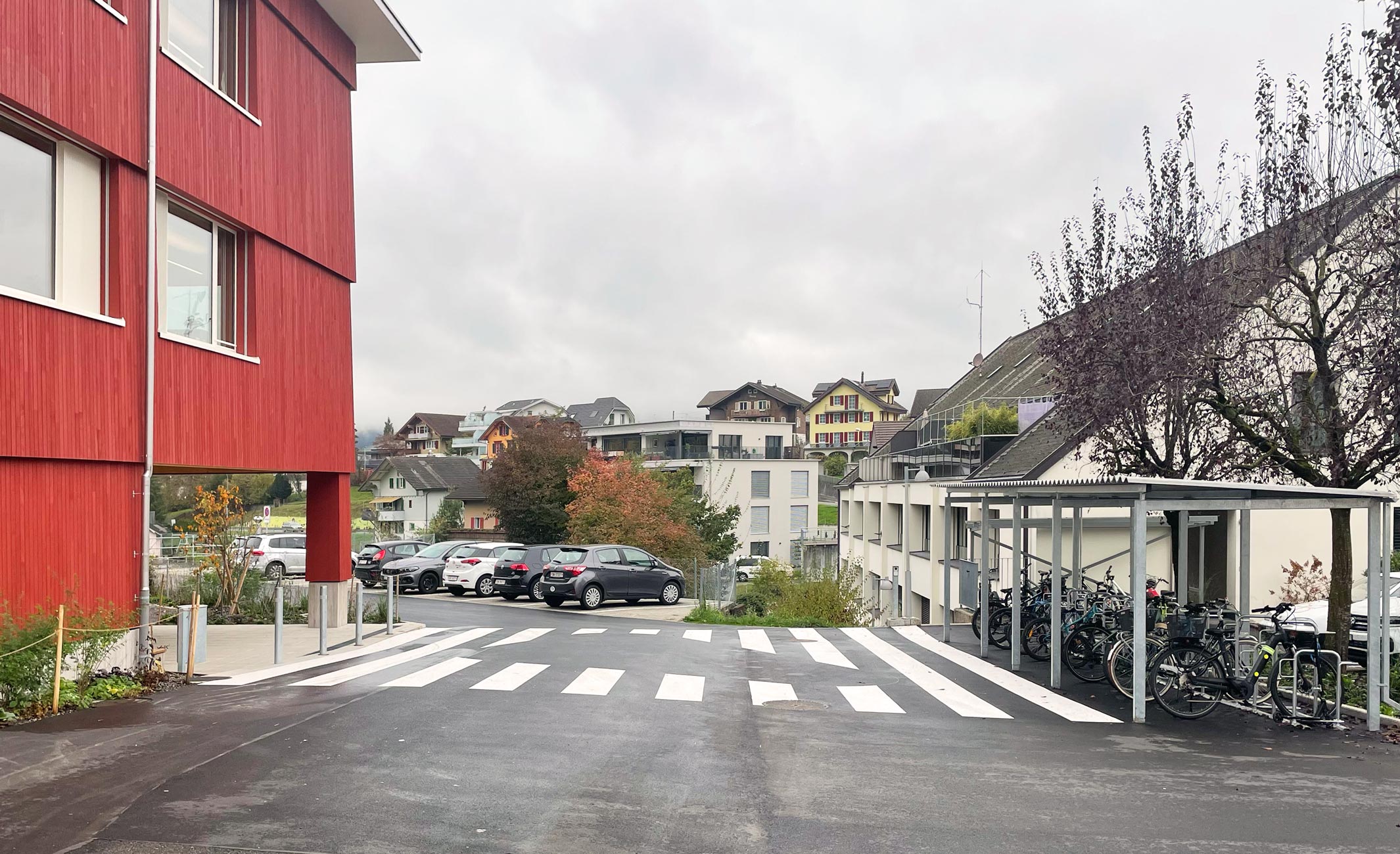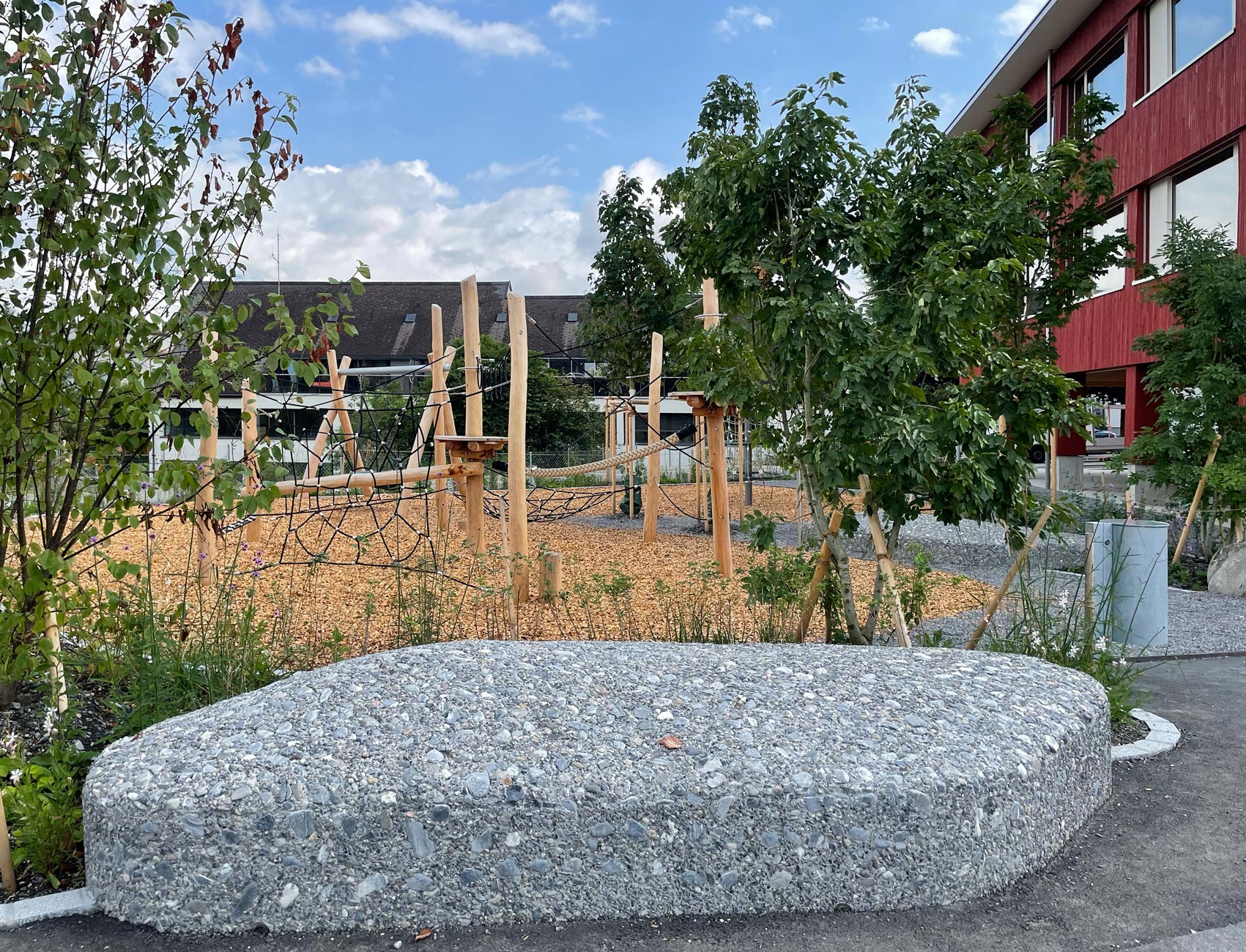 Der anschliessende Allwetterplatz steht den Primarschülern als grosse Platzfläche zur Verfügung, die gelegentlich auch als Parkplatz bei grösseren Veranstaltungen zweckentfremdet werden kann. Der Übergang vom Pausenplatz zum höher liegenden Schulhausniveau ist als schiefe Ebene ausgebildet. Auch hier finden sich wieder Vegetationsinseln mit Bäumen, deren Einfassungen den Kids als Sitzelemente dienen. Der oben liegende Verbindungsweg zwischen Schulhaus Dossen und dem Neubau ist mit seiner Überdachung auch gedeckter Pausenbereich.