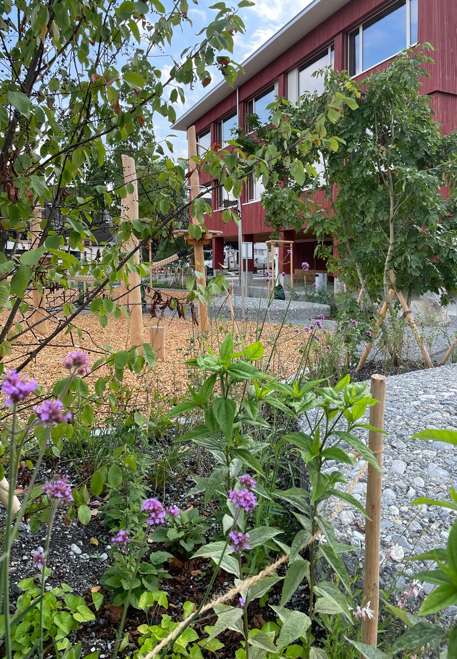 Entlang der Ostfassade des neuen Primarschulhauses bildet ein Heckenkörper mit eingestreuten Gehölzen einen Filter zur Feuerwehr. Im Westen findet er eine Fortsetzung und umfasst als Vegetationssaum den Spielplatz, der kanzelartig über dem Parkplatz am Dossen liegt. Zur Sarnerstrasse bietet der Eingangs- und Vorbereich des neuen Schulhauses eine zusätzliche Adresse für die Primarschule. Der vorgelagerte Parkplatz bietet Potenzial für eine zukünftige weitere Aufwertung des Schulaussenraumes.