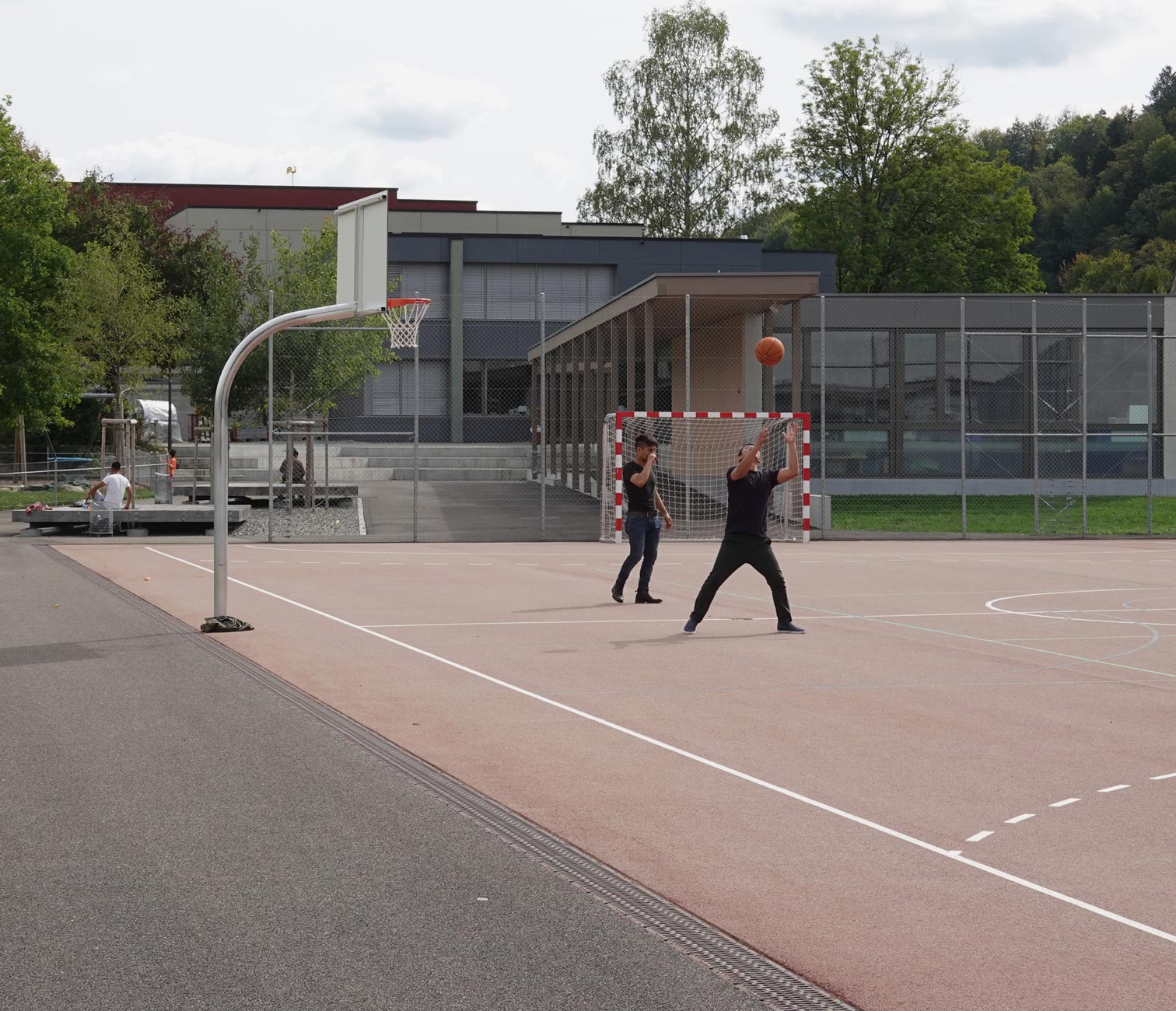 Mit dem Schulerweiterungsbau wird der Pausenplatz der Primarschule hofartig gefasst und erhält einen eigenständigen, geschützten Charakter. Durch gebäudezugeordnete Überdachungen, eine Sitzstufenanlage sowie die Bauminsel mit Holzpodesten bietet er vielfältige Aufenthaltsmöglichkeiten. Nach Westen öffnet sich der Hof zu den Sportanlagen und zur neuen Turn- und Mehrzweckhalle, welche das Schulareal zur Tösstalstrasse hin abschliesst. Arkadenartige Gänge entlang der Neubauten sowie die Sitzstufenanlagen im Hofbereich und vor der Ostfassade des Mehrzweckgebäudes (Aussenbereich Mittagstisch) spannen den Schulaussenraum über den Allwetterplatz hinweg auf. Die Wiederholung des Bauminselelements im Vorbereich der Mehrzweckhalle sowie auf dem östlichen Schulhausvorplatz verstärkt den Zusammenhalt des lang gestreckten Schulareals.