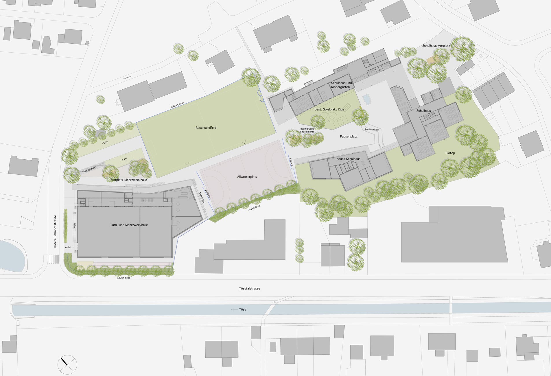 Lineare Baumreihen aus Säulenespen bilden entlang der Südgrenze einen klaren Abschluss und verweisen auf die jenseits der Tösstalstrasse fliessende Töss. Entlang der Schulhäuser wird das bestehende Biotop mit Baumpflanzungen und Wiesenflächen komplettiert. Die pragmatische Reduktion auf wenige markante Ausstattungselemente und Materialien ermöglicht trotz der räumlich knappen Verhältnisse ein grosszügiges und unaufgeregtes Erscheinungsbild der Schulanlage.