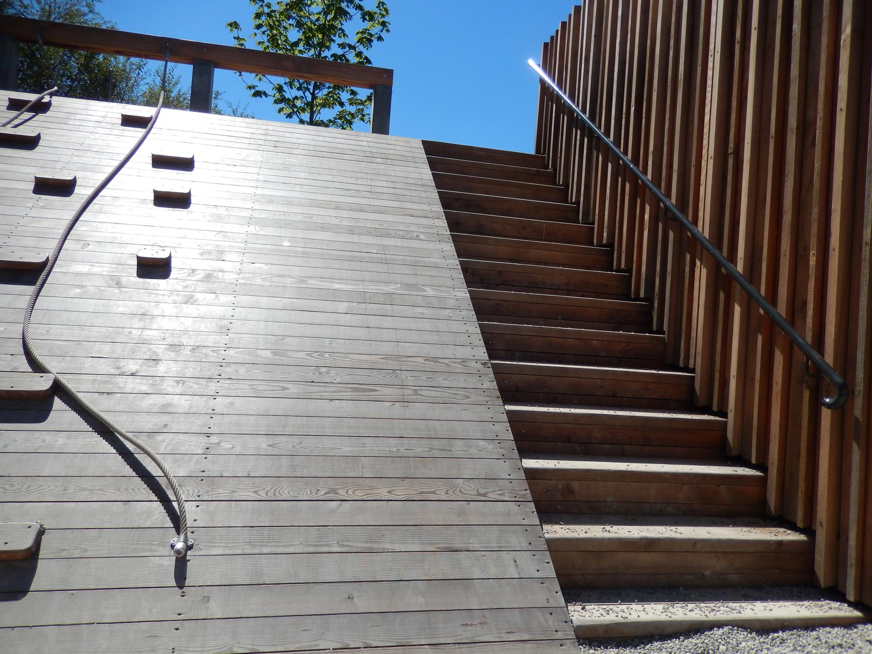 Dieser wird über eine neue Treppenverbindung mit einem nördlich des Erweiterungsbaus liegenden „Unteren Pausenhof“ verbunden. Hier bieten Baumstämme und Findlinge in einer Kiesfläche einen mit „unbearbeitetem“ Naturmaterial gestalteten Spielraum, der wiederum von den Zierapfelbäumen des Baumvorhangs überlagert wird.
