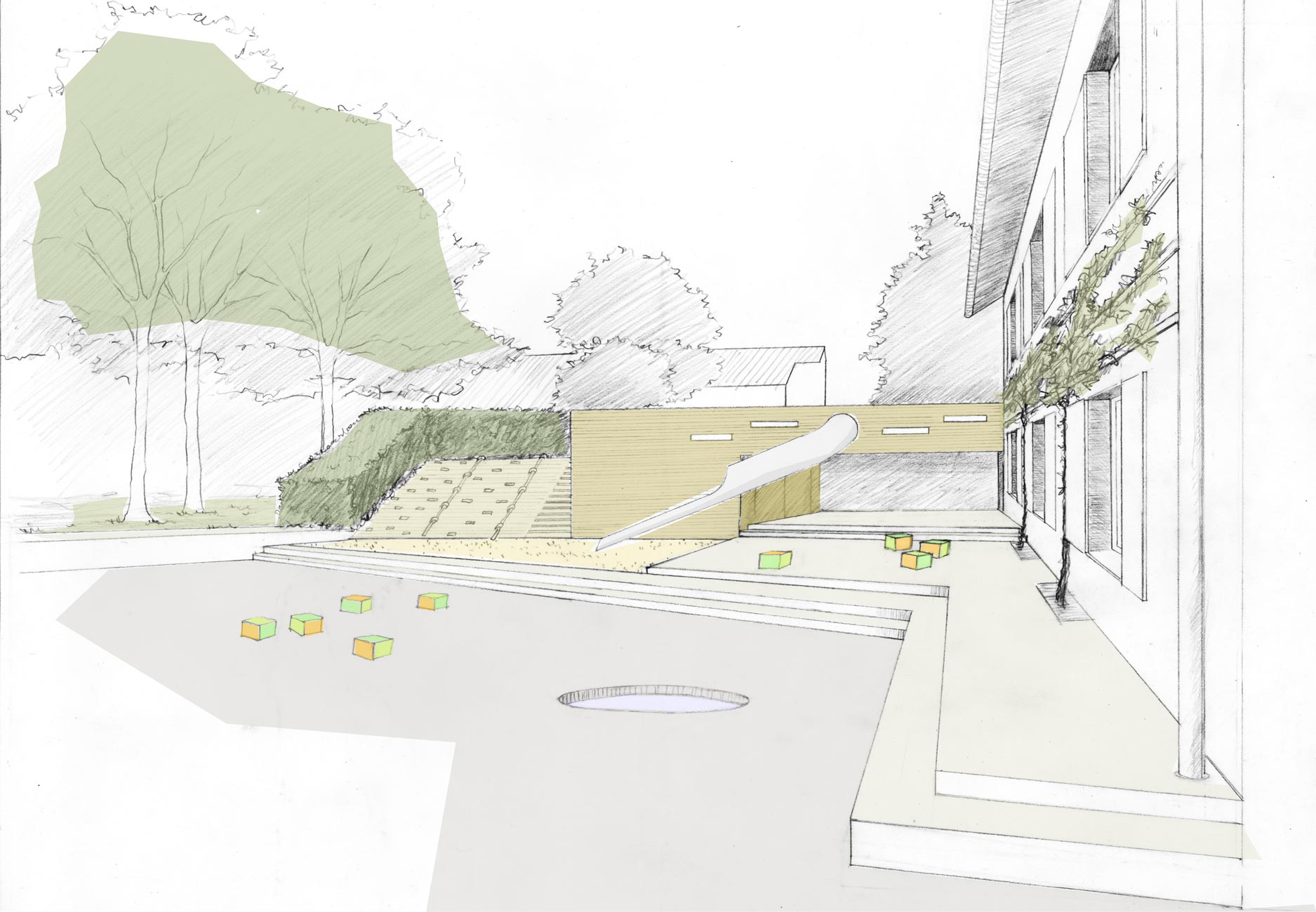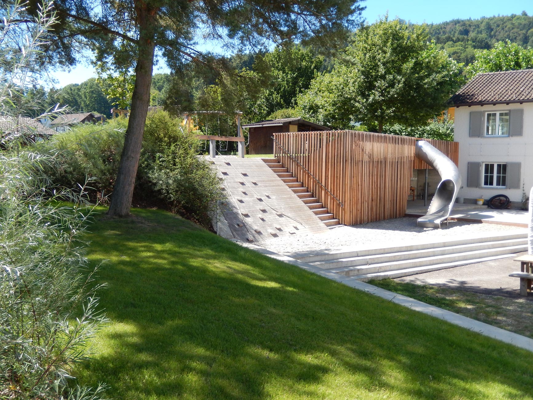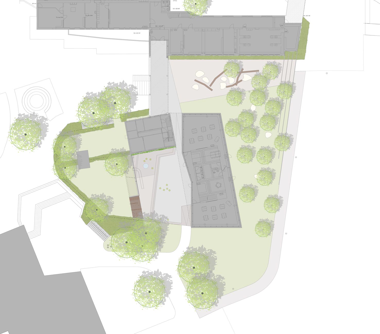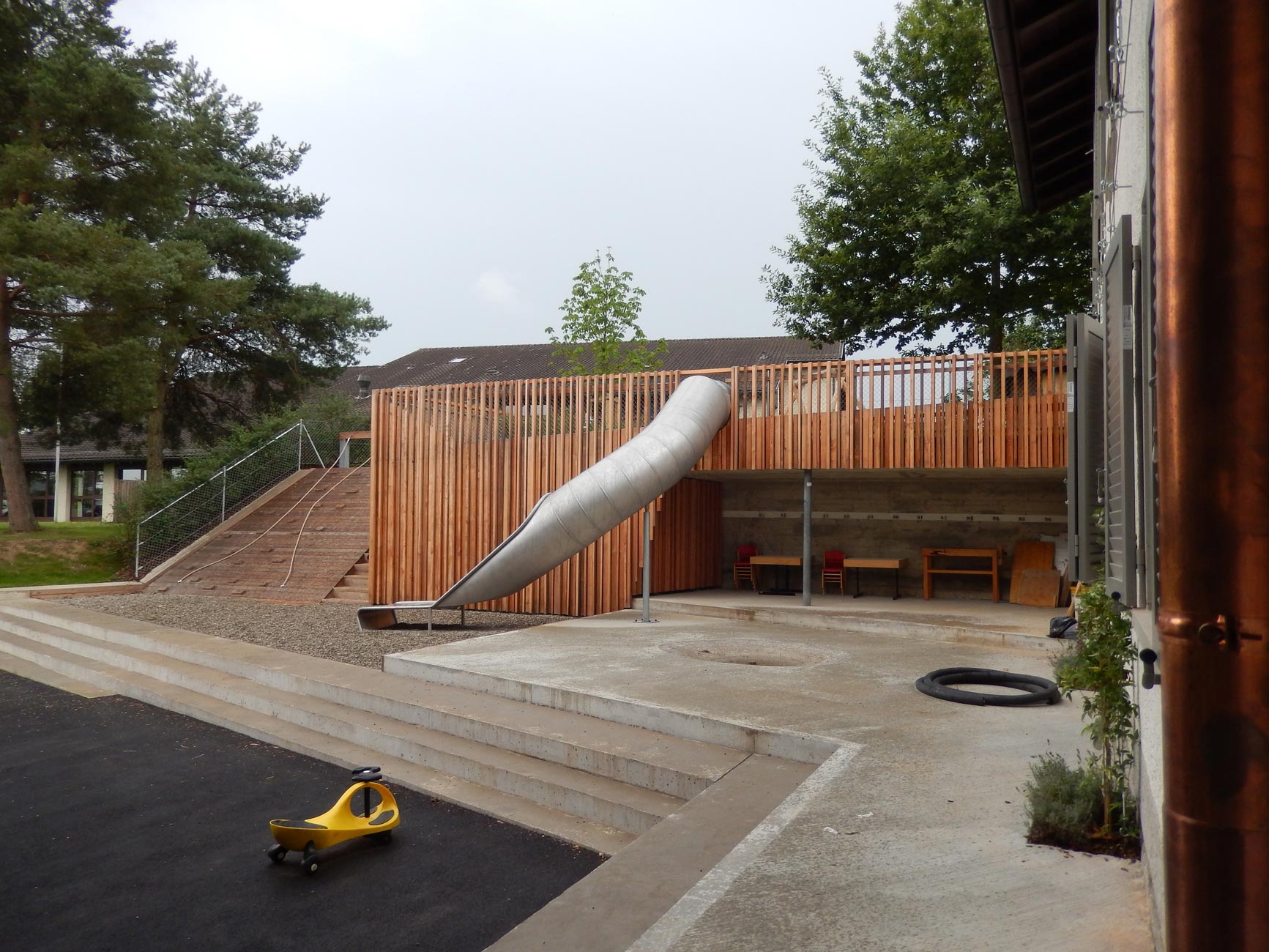Der Ergänzungsneubau mit dem Kindergarten im Erdgeschoss erhält an seiner grünen Ostseite einen Baumvorhang aus hochstämmigen Zieräpfeln, die durch ihren Stammvorhang den Blick in die anschliessende weite Agrarlandschaft zulassen und gleichzeitig einen eigenen Spielort entstehen lassen. Südseitig entsteht durch die Anordnung der Gebäude ein introvertierter Hof als aussenliegendes Spielzimmer. Eine abgestufte Topographie unterschiedlicher Höhe lässt verschiedene Spielsituationen entstehen, mit Wasserstelle, Rutschbahn und Unterstand. Über eine schiefliegende Kletterwand gelangen die Kinder auf die höher liegende Spielwiese mit Gartenhaus und Sandspiel und über den Rutschbahneinstieg wieder nach unten. Beerensträucher bieten eine Naschhecke zum angrenzenden Pausenhof der Primarschule.