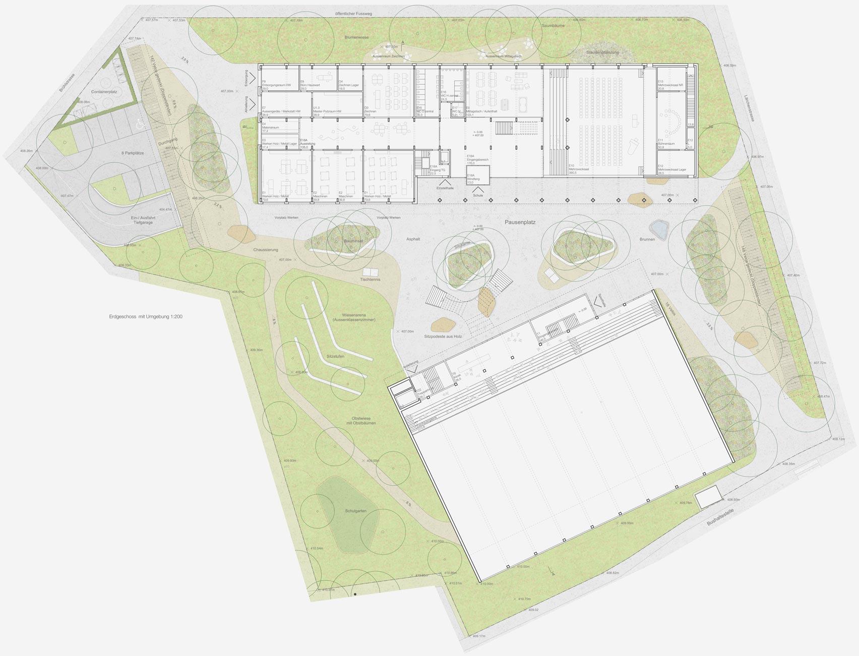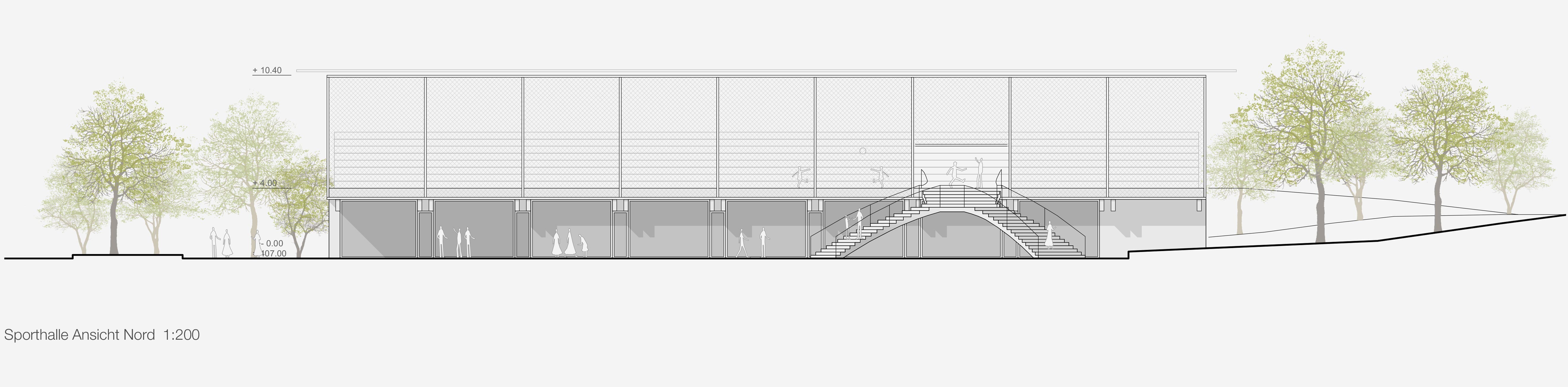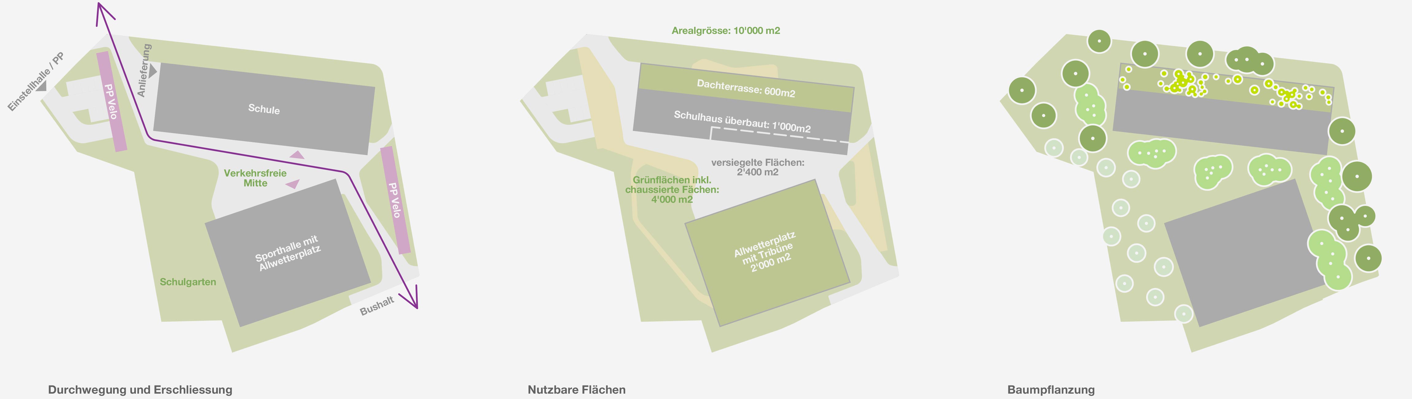 «Ausgehend von der Idee eines geschützten, zentral gelegenen Pausenhofs entwickelt das Projekt für Schule und Sporthalle zwei eigenständige Baukörper. ... Gemeinsam bilden sie einen polygonalen Pausenhof, der durch ein Wegenetz von beiden Seiten an das umliegende Quartier angebunden ist. ... Durch die Setzung der Neubauten spannt sich über die Diagonale eine Freiraumfigur auf, die an ihren Enden die Schülerschaft geschickt in Empfang nimmt. Der Pausenplatz liegt geschützt zwischen den Bauten. Bepflanzte Bauminseln mit umlaufenden Sitzmöglichkeiten, Sitzpodeste aus Holz sowie ein Brunnen bespielen den Pausenhof. Eine zweiläufige Treppenbrücke sowie ein sanft ansteigender Fussweg führen hinauf zum Aussensportplatz mit Tribüne. Ein nach Norden hin ausgerichteter Dachgarten auf dem Schulgebäude erweitert das Freiraumangebot zusätzlich. Das Projekt versteht es, Freiflächen maximal zu nutzen und eine attraktive Schulumgebung zu schaffen. ... Das Projekt besticht durch seine überzeugende städtebauliche Einbindung und den zentralen Pausenhof als Herzstück der Anlage.»