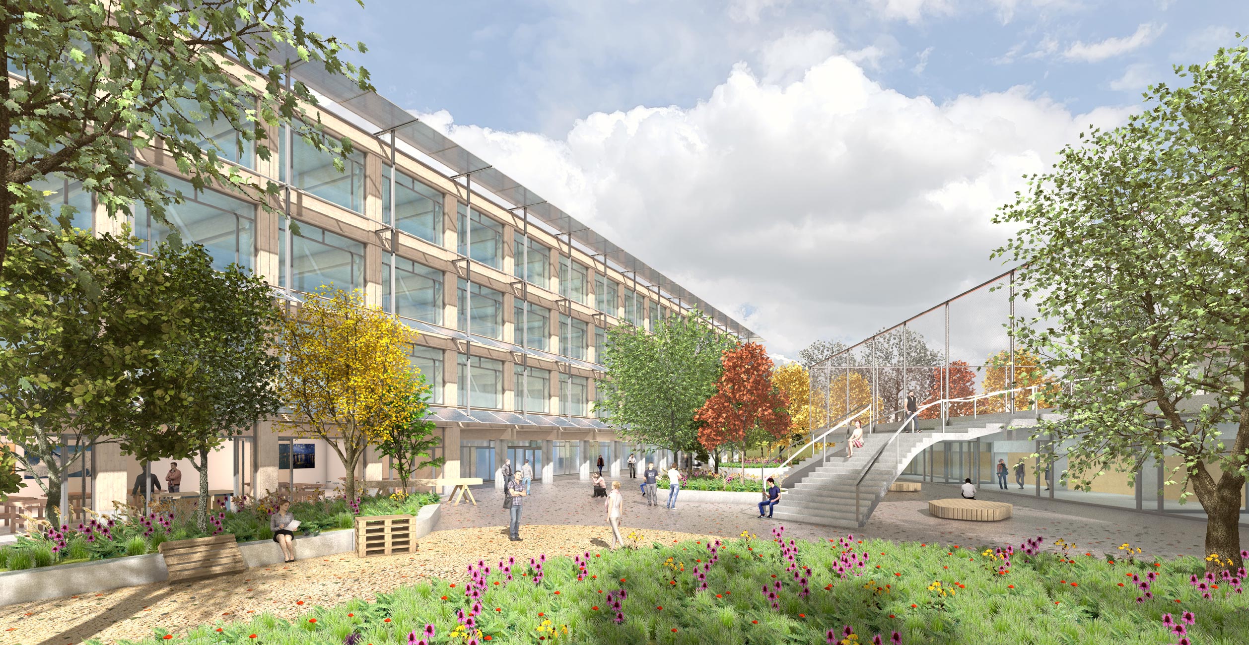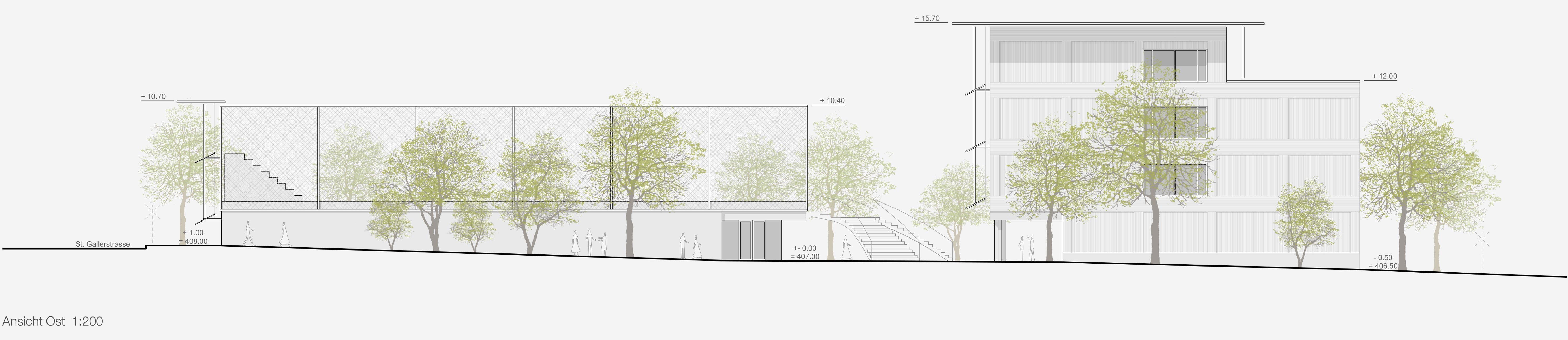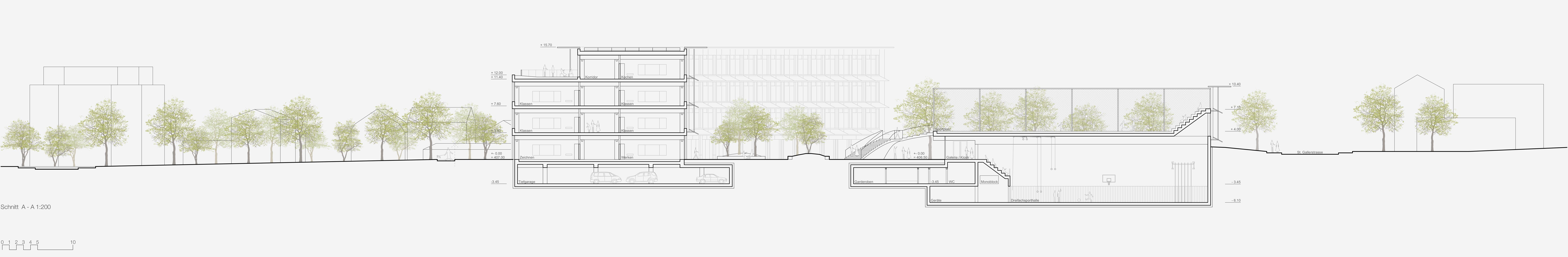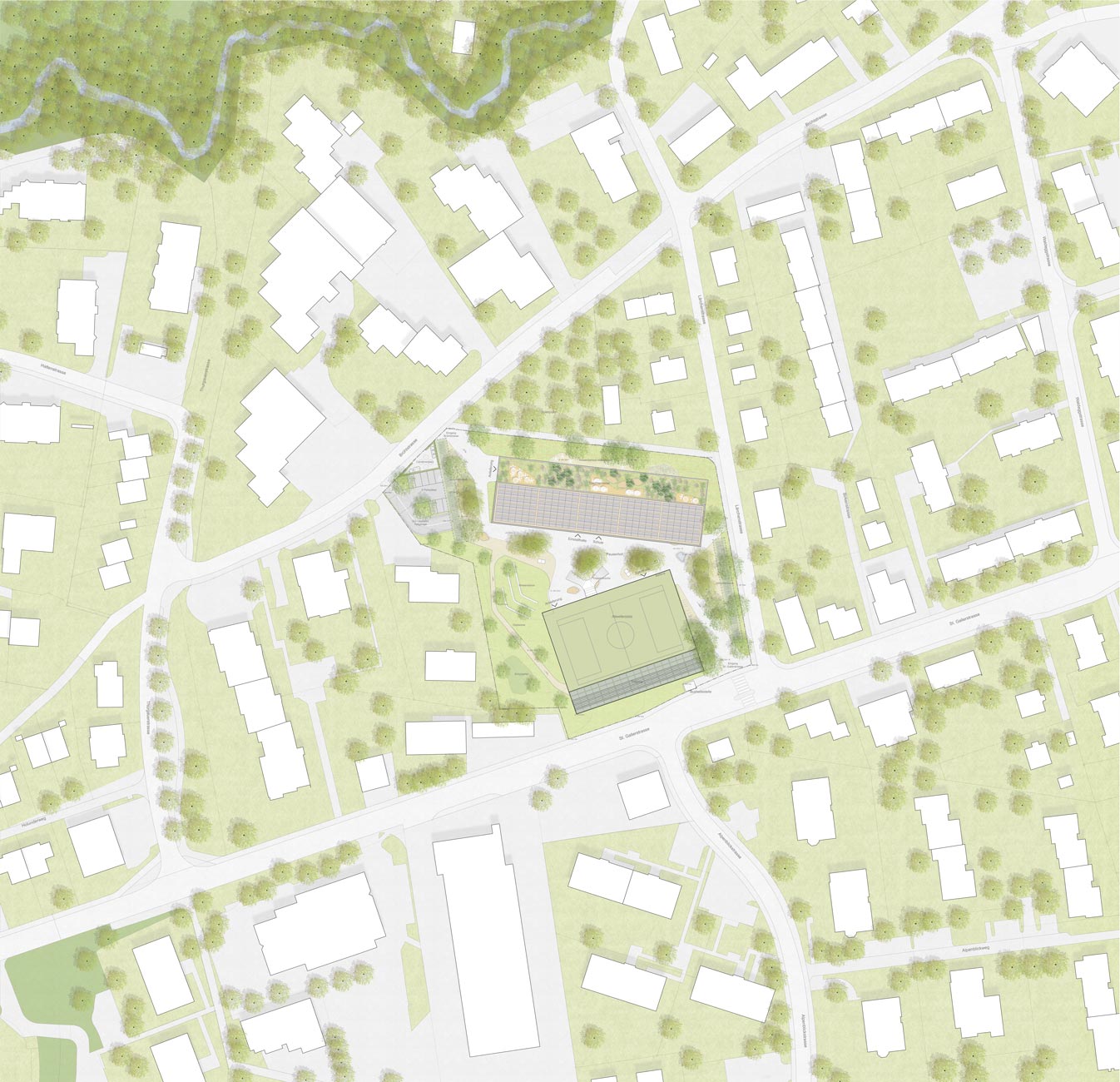 «Ausgehend von der Idee eines geschützten, zentral gelegenen Pausenhofs entwickelt das Projekt für Schule und Sporthalle zwei eigenständige Baukörper. ... Gemeinsam bilden sie einen polygonalen Pausenhof, der durch ein Wegenetz von beiden Seiten an das umliegende Quartier angebunden ist. ... Durch die Setzung der Neubauten spannt sich über die Diagonale eine Freiraumfigur auf, die an ihren Enden die Schülerschaft geschickt in Empfang nimmt. Der Pausenplatz liegt geschützt zwischen den Bauten. Bepflanzte Bauminseln mit umlaufenden Sitzmöglichkeiten, Sitzpodeste aus Holz sowie ein Brunnen bespielen den Pausenhof. Eine zweiläufige Treppenbrücke sowie ein sanft ansteigender Fussweg führen hinauf zum Aussensportplatz mit Tribüne. Ein nach Norden hin ausgerichteter Dachgarten auf dem Schulgebäude erweitert das Freiraumangebot zusätzlich. Das Projekt versteht es, Freiflächen maximal zu nutzen und eine attraktive Schulumgebung zu schaffen. ... Das Projekt besticht durch seine überzeugende städtebauliche Einbindung und den zentralen Pausenhof als Herzstück der Anlage.»