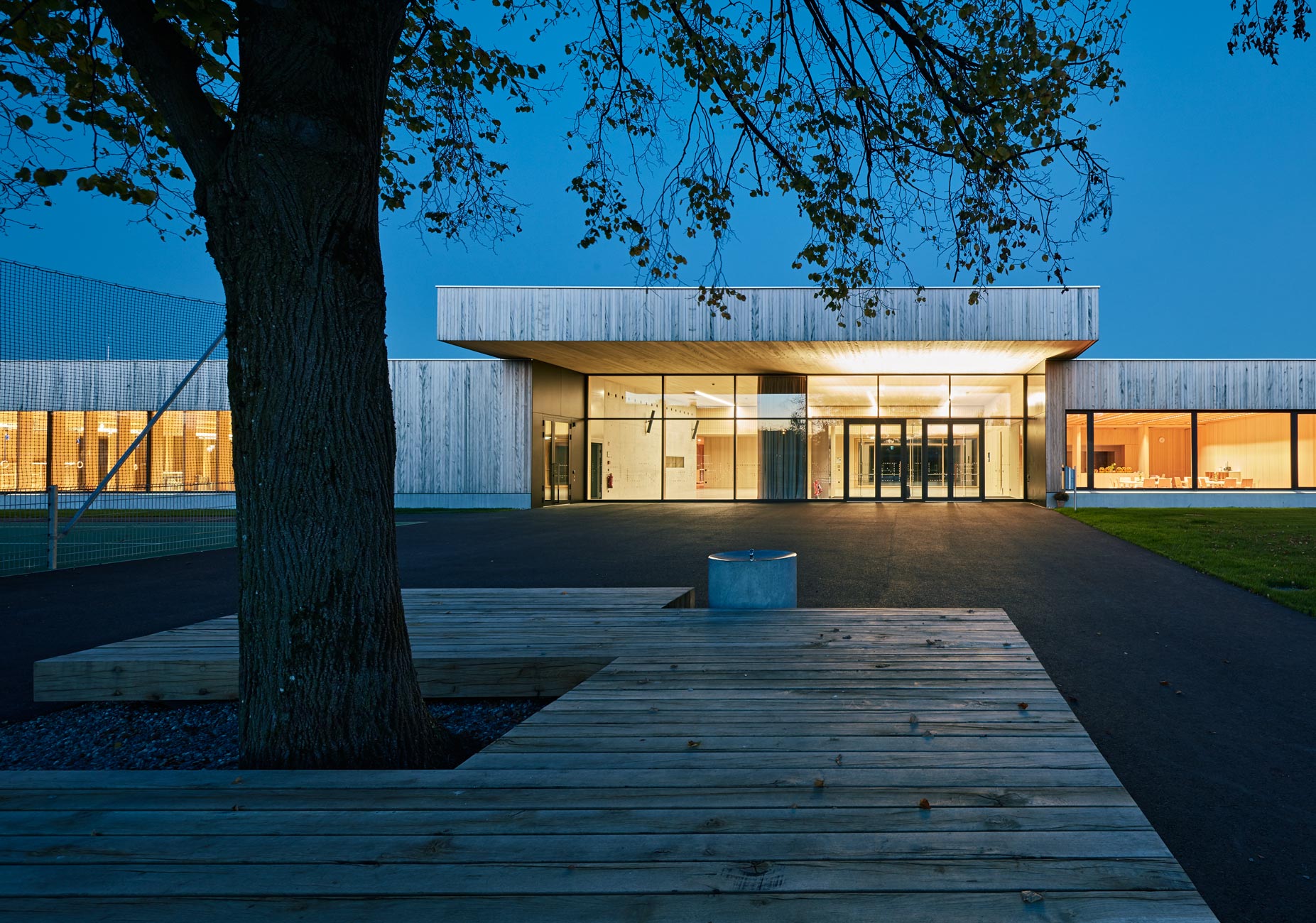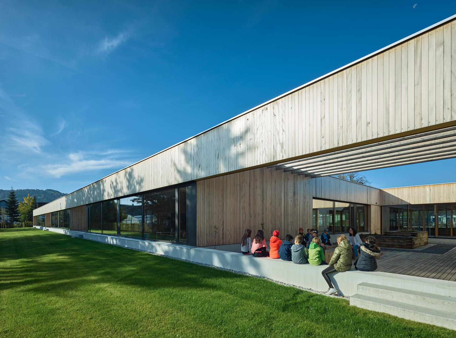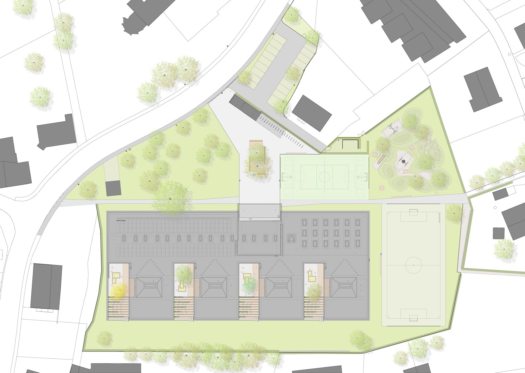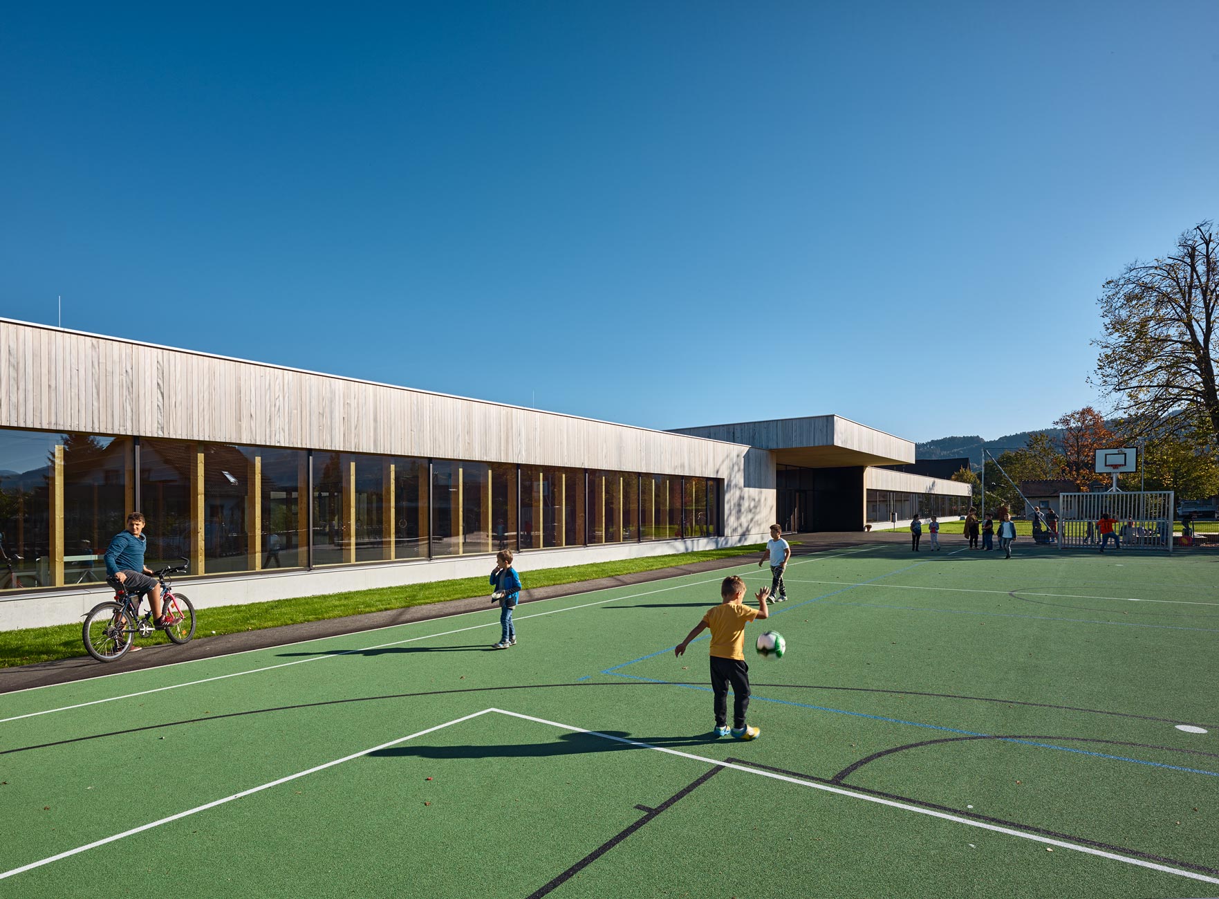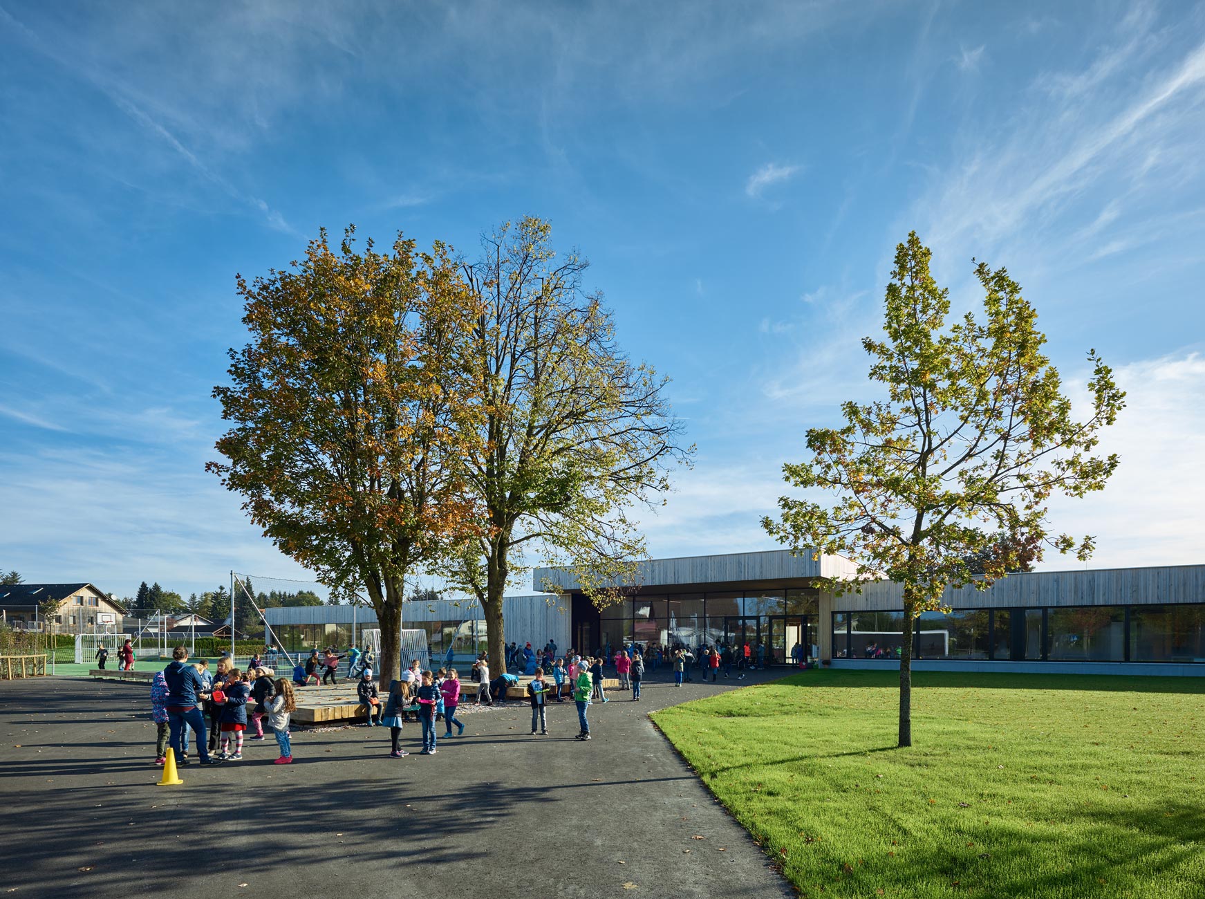 Die Aussenräume der neuen Volksschule orientieren sich um den auf einer baumbestandenen Wiese liegenden flachen Baukörper. Zur Gaissauerstrasse präsentiert sich der Neubau hinter einem lockeren Baumvorhang aus Eichen. Der Pausenplatz öffnet sich von der Strasse in Richtung Schule und Haupteingang und wird nordseitig von einem langen Velounterstand gefasst. Ein grosszügiges, zwei grosse Bestandsbäume integrierendes Holzdeck dient den Schülern als zentrales Aufenthaltselement. An hell asphaltierten Pausenplatz schliesst der Allwetterplatz für Ballsportarten an. Mit seinem grünen Gummibelag fügt es sich in die angrenzenden Grünflächen ein und ist Übergangselement zu diesen.
