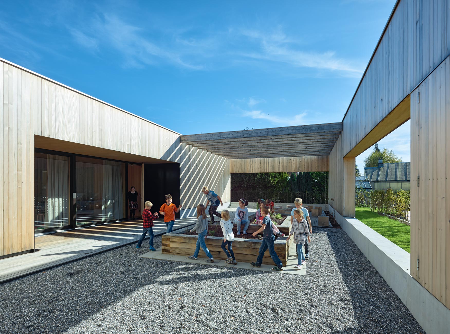 Innerhalb des Schulhausvolumens ist jeder Lerneinheit ein dreiseitig gefasstes Gartenzimmer zugeordnet, das über einen Holzrost an die Klassenzimmer angeschlossen ist. Die sonst gekiesten Hofflächen beherbergen je einen besonderen „Klassenbaum“ sowie eine holzgefasstes Hochbeet fürs schülerische Gartenexperiment.