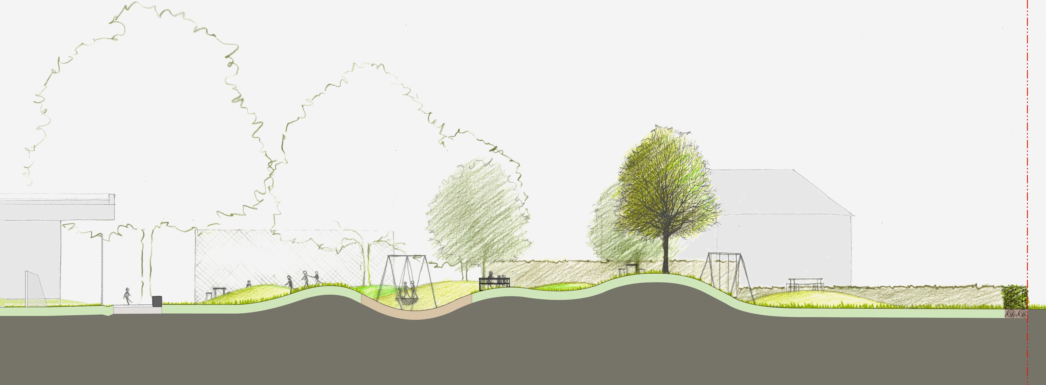 Ein Hügelspielplatz mit bewegter Topografie schafft einen vielfältigen und kleinteiligen Spielraum. Mit den locker verteilten Kirschbäumen sowie den roten Kinder-Tischbänken auf den Hügelkuppen ist dieser Ort identitätsstiftende Besonderheit auf dem Areal – nicht nur während der Kirschblüte.