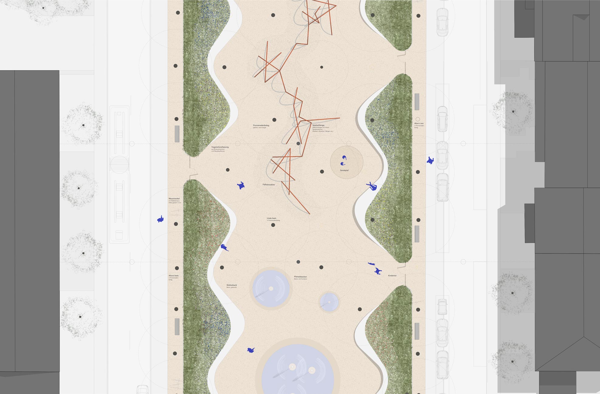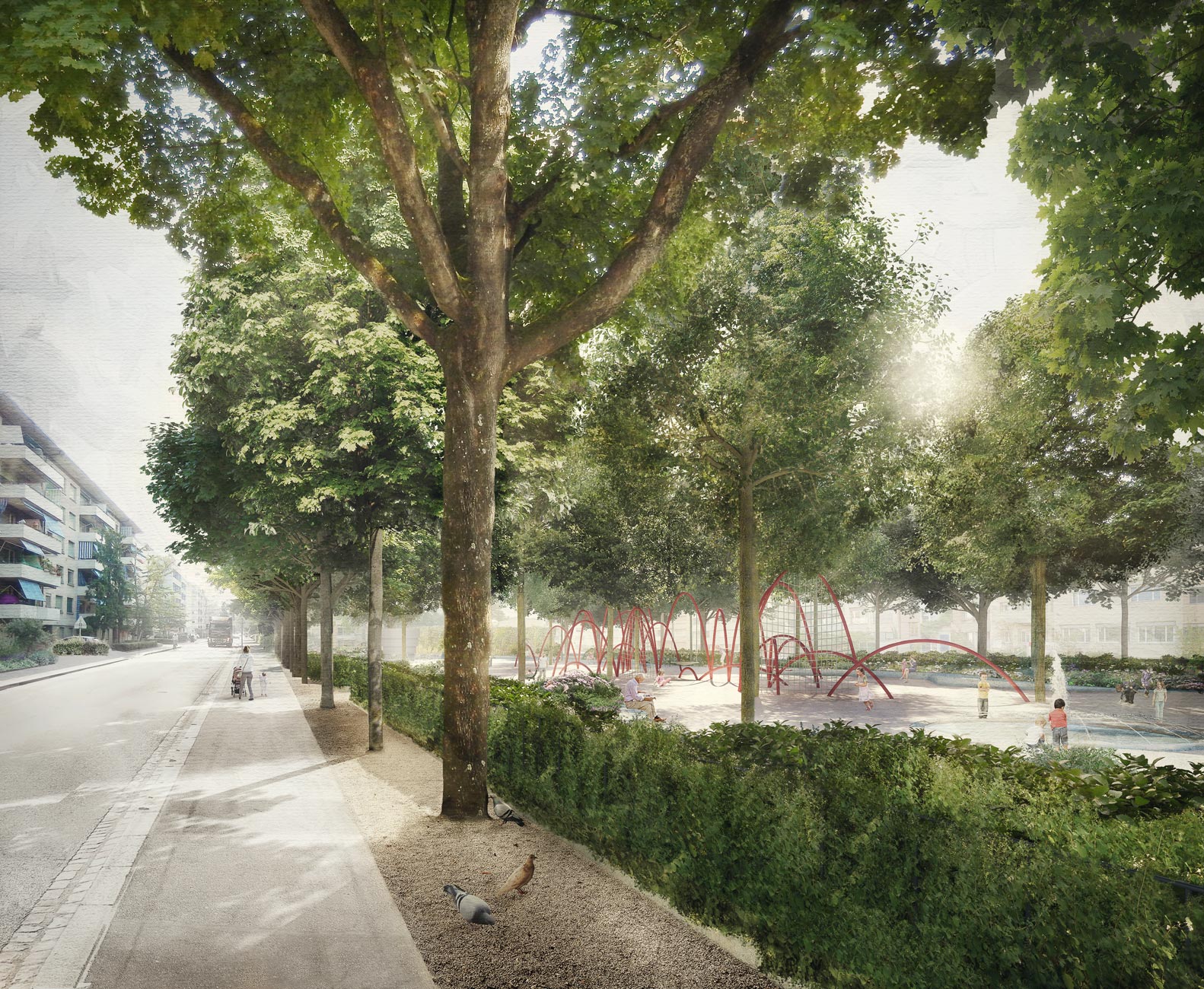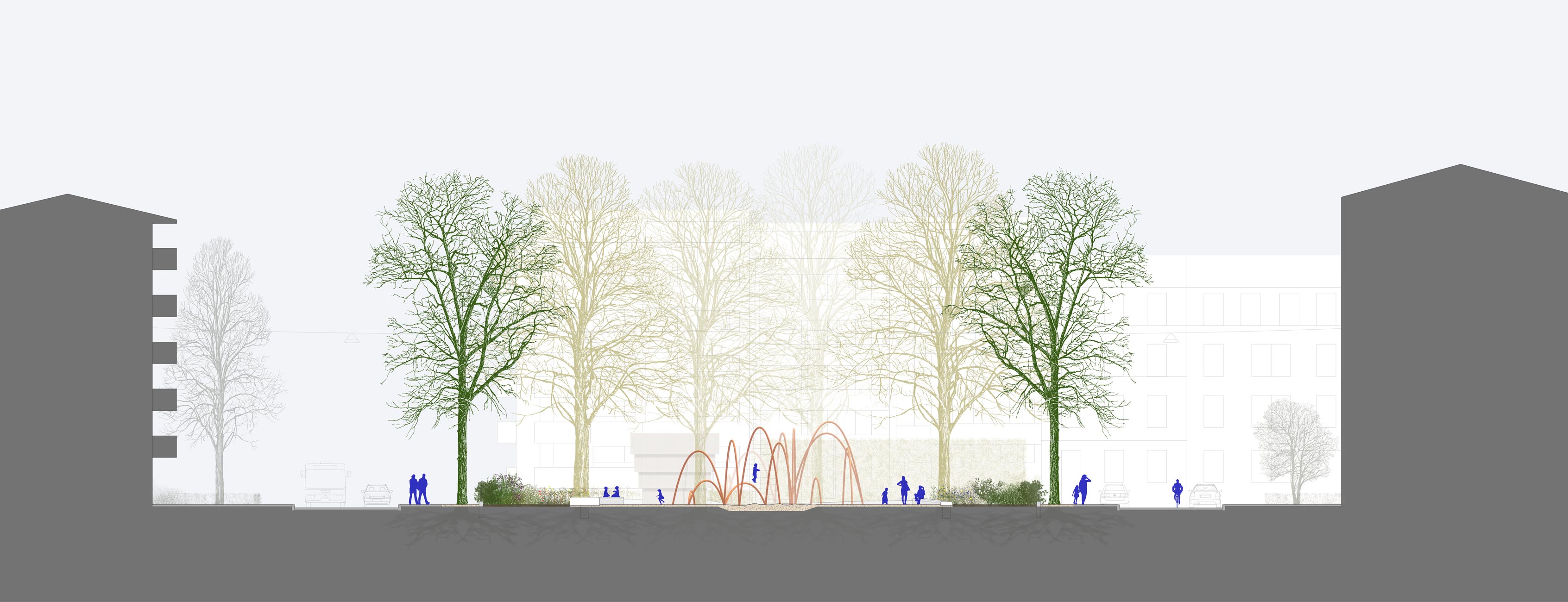 Der Winkelriedplatz soll künftig wieder als offener Platzpark die angrenzenden Strassenräume bestimmen und bereichern. Mit einer prägnanten, die Tradition des Squares zeitgemäss fortführenden Gestaltung wird ein durchlässiger Rahmen geschaffen, der unter gelichtetem Laubdach eine offene innere Fläche fasst, auf der die heutigen Interessen der Quartiersbewohner im Miteinander stattfinden können und so Vielfalt innerhalb eines „einheitlichen“ Gefässes ermöglicht. Wird dem Kinderspiel in der Fläche der meiste Raum gegeben, so zielt die Gestaltung doch darauf ab, dass jeder Quartiersbewohner hier seinen Platz finden können soll – mal mehr mal weniger exponiert, mal separat mal in Gesellschaft, aber immer als Teil des Gesamten. Der Winkelriedplatz als Treff fürs Gundeli: der Salon du Quartier.